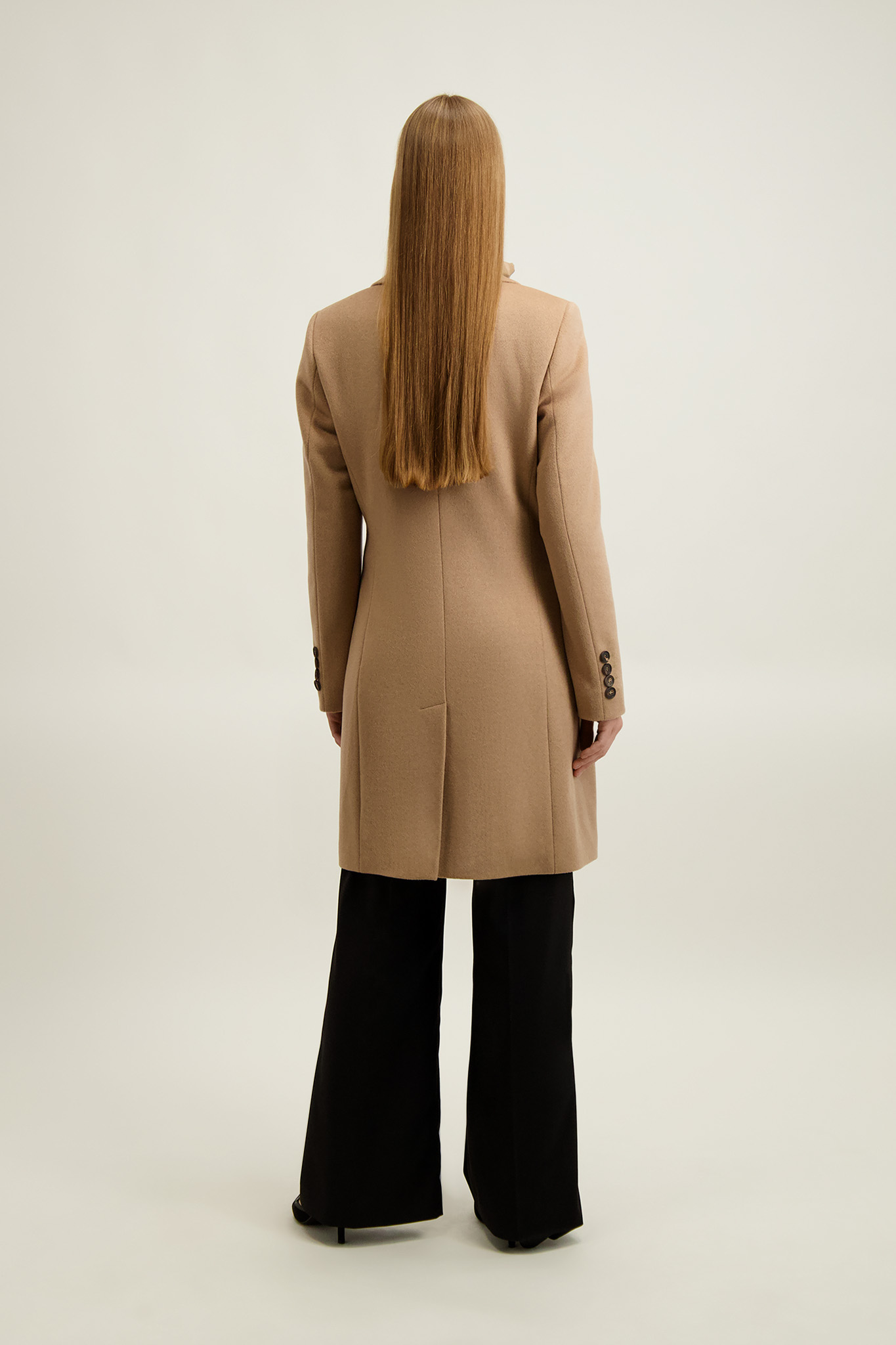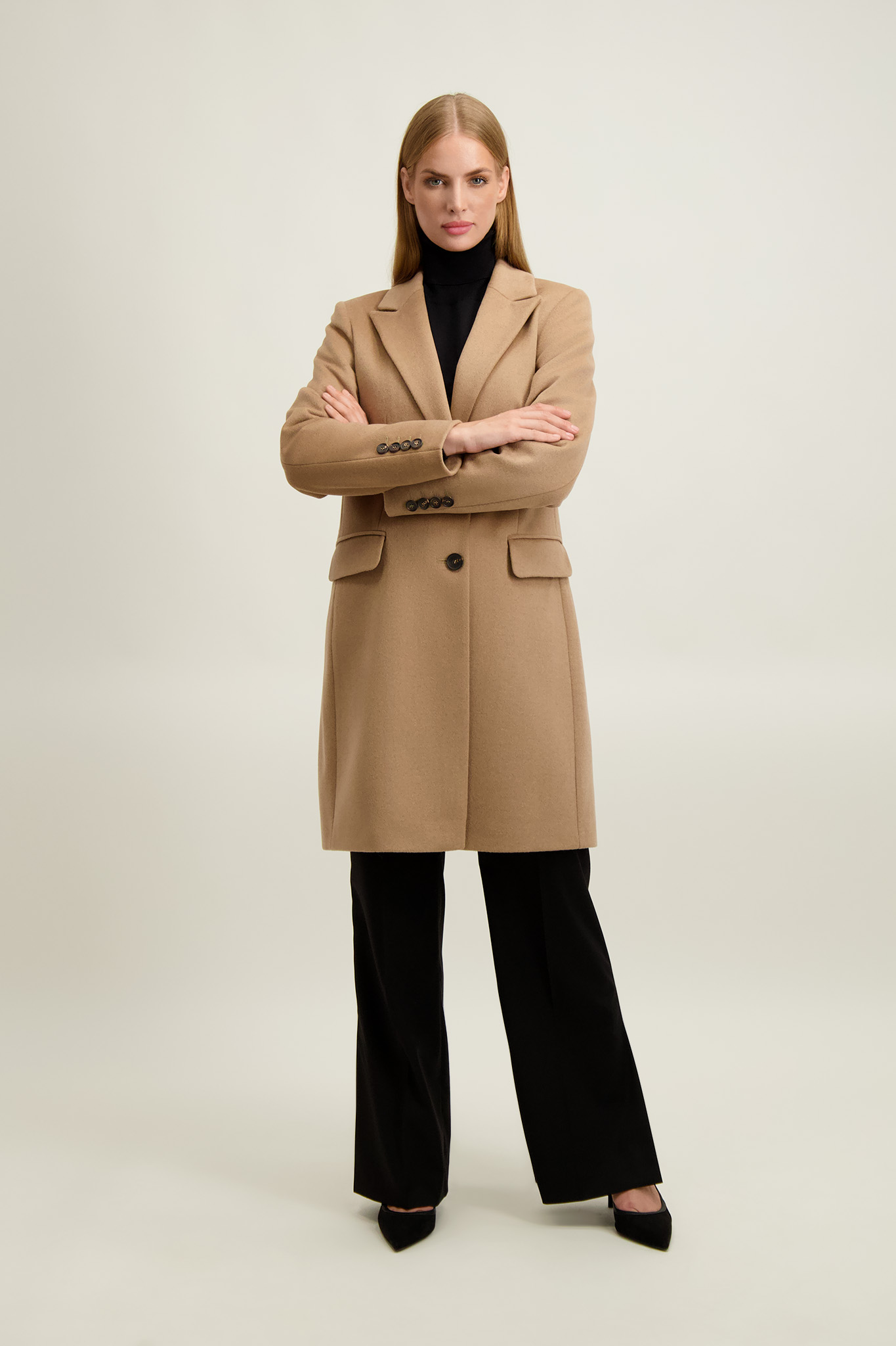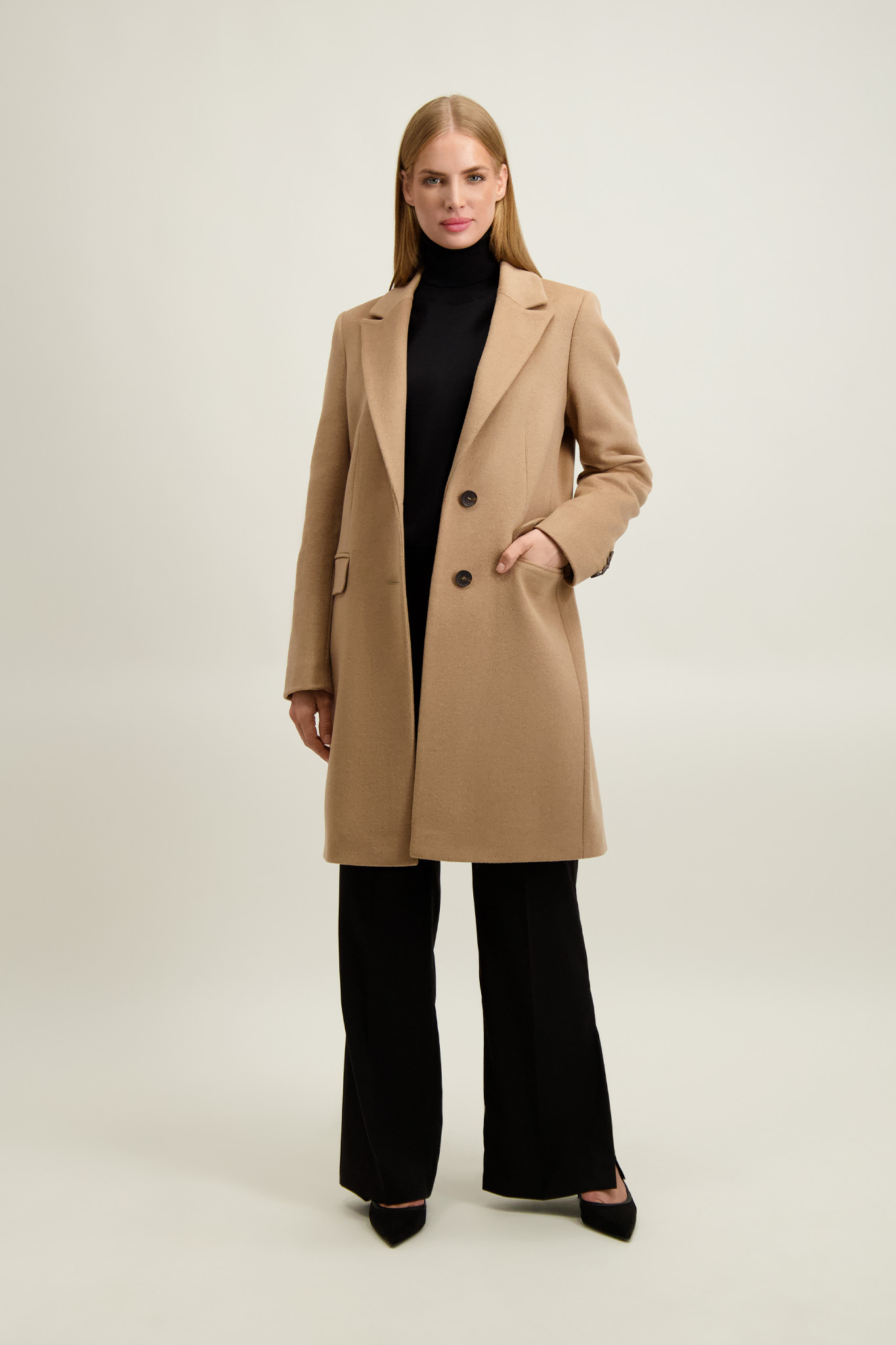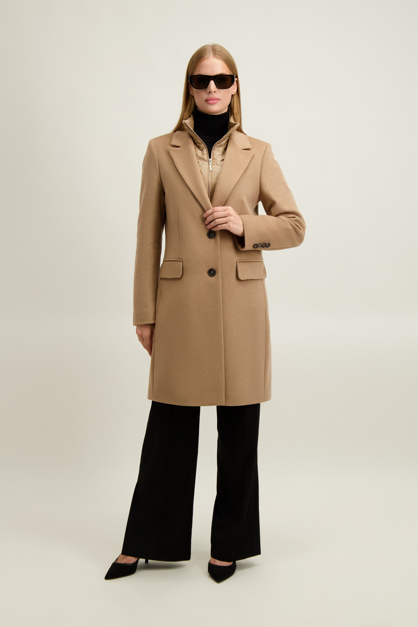 Kamelowy płaszcz damski z wełną 87425