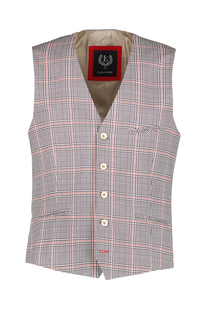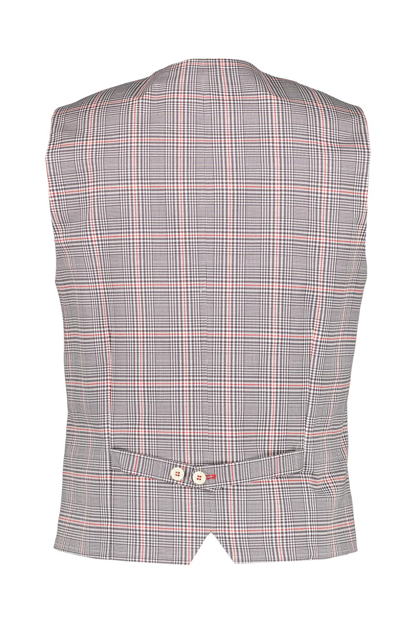 Elegancka kamizelka męska uszyta z wysokiej jakości tkaniny bawełnianej w szaro-białą pepitkę. Kamizelka posiada kryte kieszenie bez patek oraz regulację szerokości na plecach. Przód wycięty jest w kształcie litery V, co efektownie wyszczupla męską sylwetkę i nadaje jej pożądanych proporcji. Na uwagę zasługują czerwone akcenty ozdobne pojawiające się na tkaninie oraz wewnątrz kamizelki. Jest to obowiązkowa propozycja do każdego zestawu smart casualowego z białą koszulą oraz chinosami, ale także ciekawy dodatek do jednolitego garnituru, który eleganckiej stylizacji doda gustownego smaku oraz oryginalności.