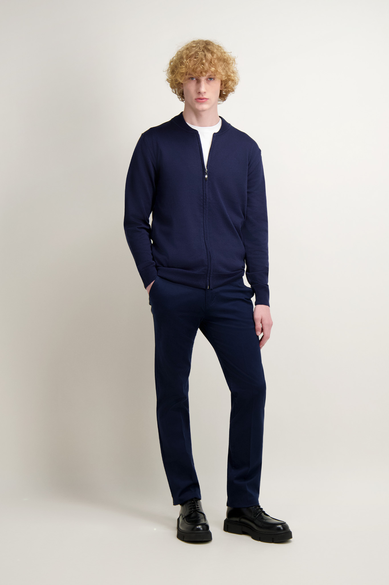 Granatowy kardigan męski ze ściągaczami. Uszyty z przyjemnej w dotyku bawełnianej tkaniny. Zapinany na zamek.