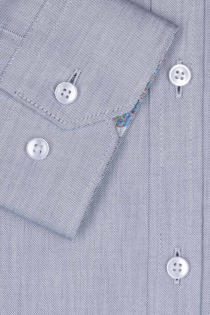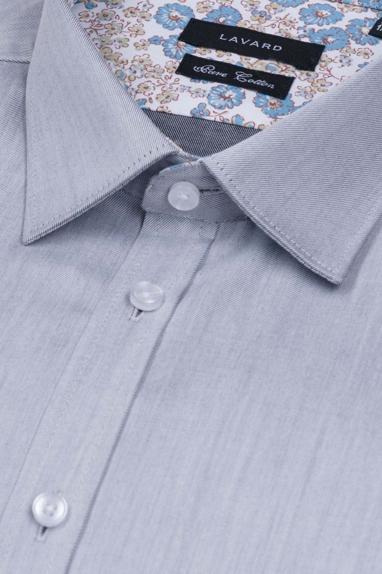 Klasyczna szara koszula męska z modnym, florystycznym motywem wewnątrz kołnierzyka i mankietów. Uszyta z bawełnianej tkaniny o nieregularnej strukturze. Zapinana na jasne guziki z białą nicią. Krój slim fit. Uniwersalny model pasujący do klasycznych i mniej formalnych stylizacji.