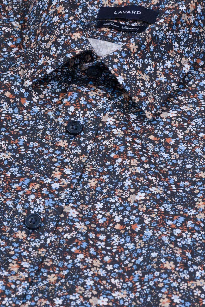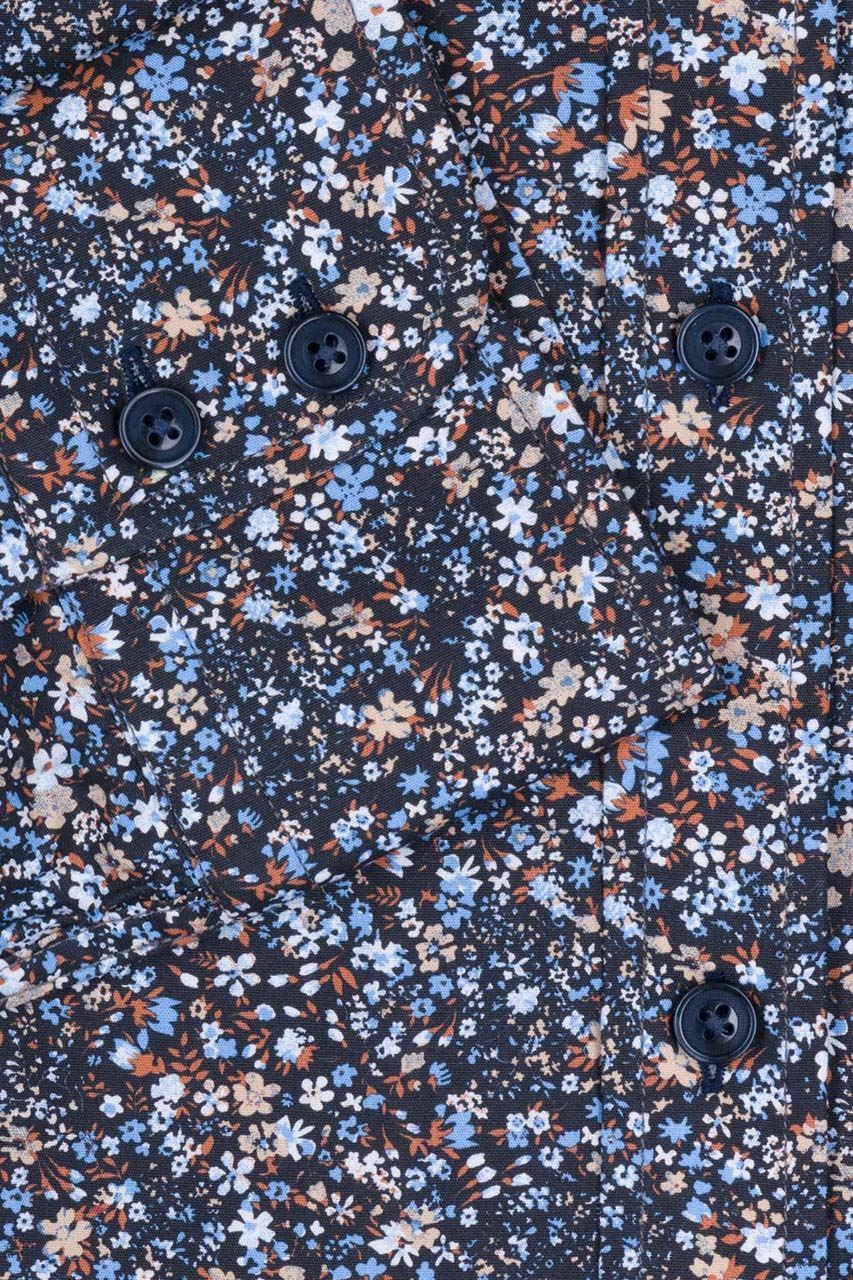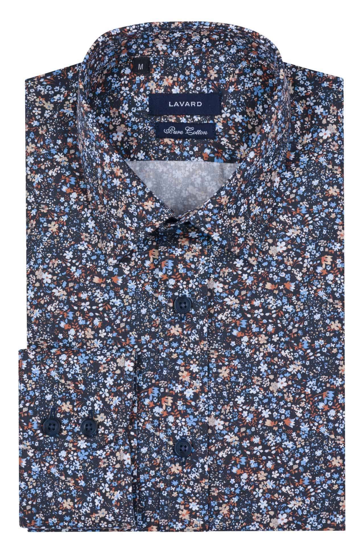 Bawełniana koszula w kwiaty męska. Utrzymana w kolorystyce beżu, błękitu i granatu. Posiada granatowe guziki przyszyte nicią w tym samym kolorze. Unikalny wzór dodający stylizacji uroku i charakteru. Koszula slim fit, idealna do casualowych zestawów.