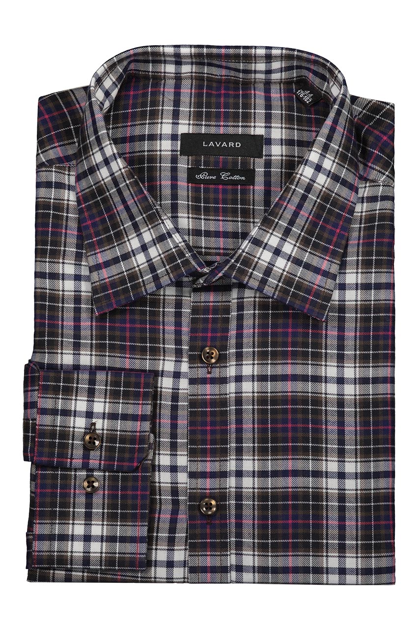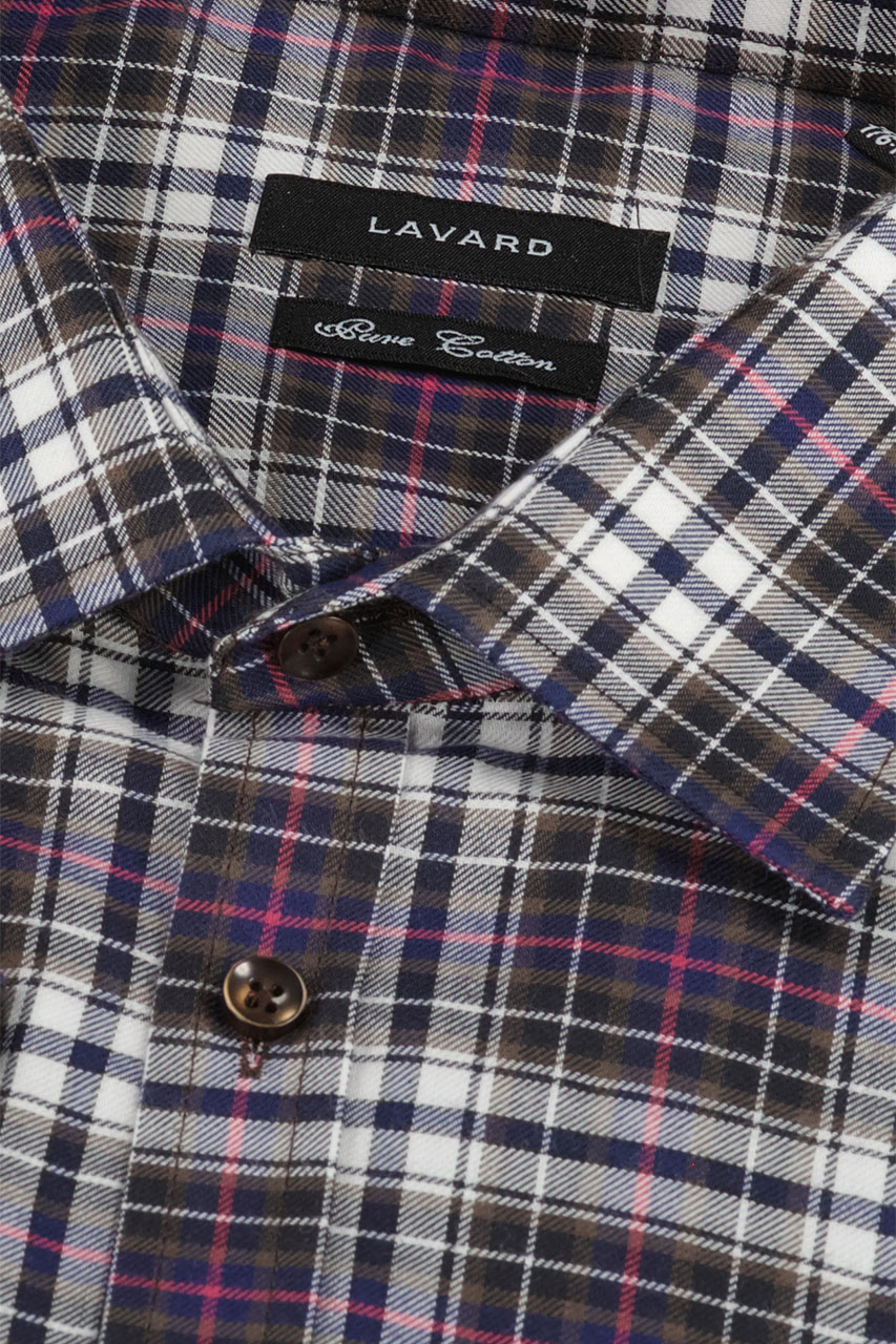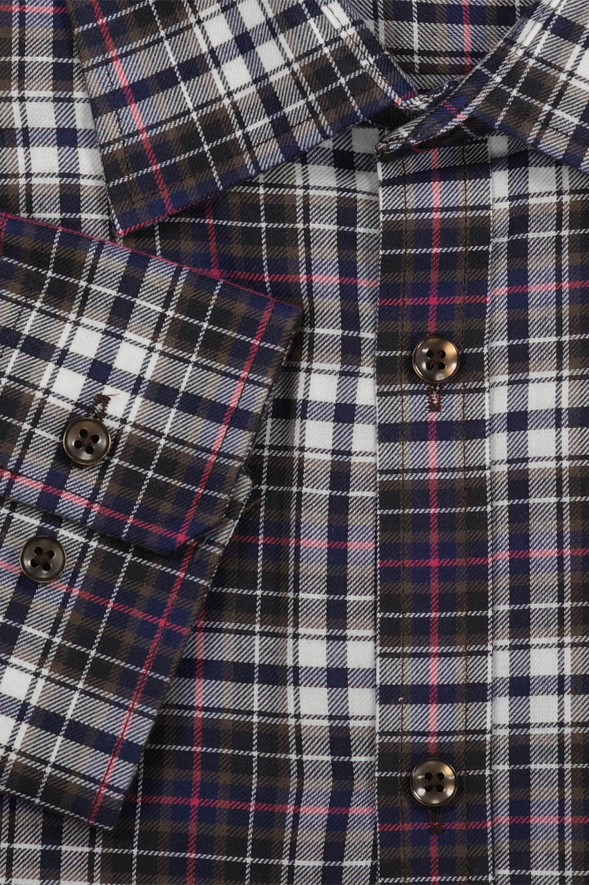 Koszula męska w kratę. Model uszyty z wysokiej jakości bawełny, co znacząco wpływa na komfort użytkowania. Koszula utrzymana w pięknej i nieoczywistej kolorystyce bieli, granatu, brązu i różu. Doskonale prezentuje się z granatowymi lub z beżowymi spodniami chino.