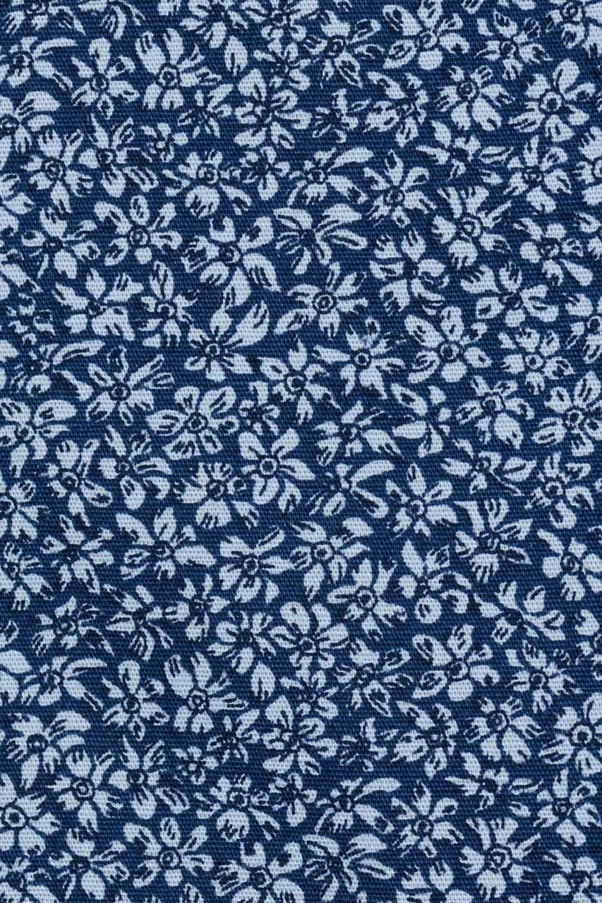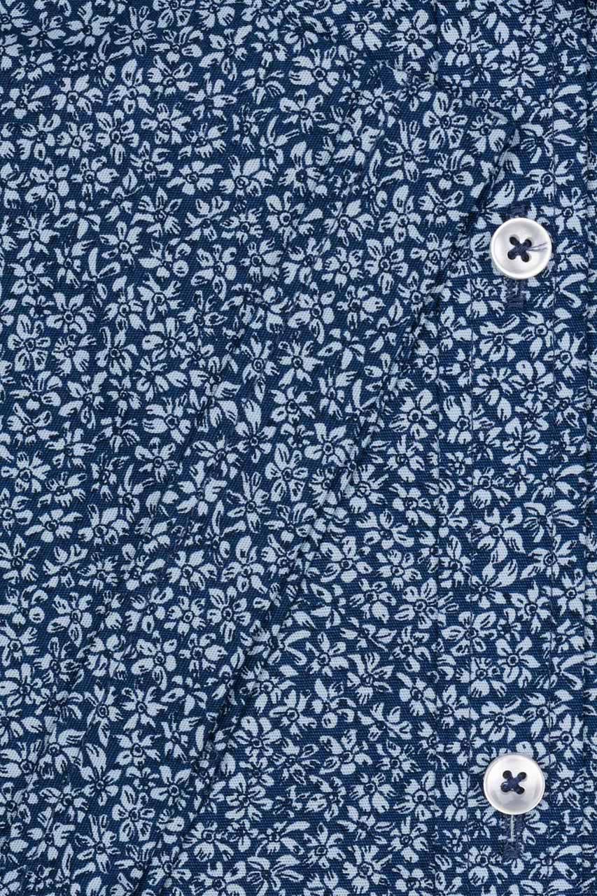 Granatowa koszula w kwiaty z krótkim rękawem. Wykonana z wysokiej jakości bawełny. Model o kroju slim, dzięki czemu pięknie dopasowuje się do sylwetki. Ciekawa propozycja do casualowych stylizacji. Fantastycznie prezentuje się zarówno solo jak i z granatową marynarką w mniej formalnym stylu.