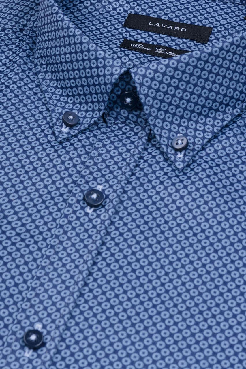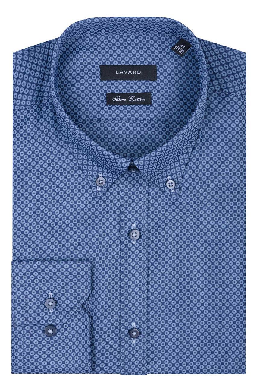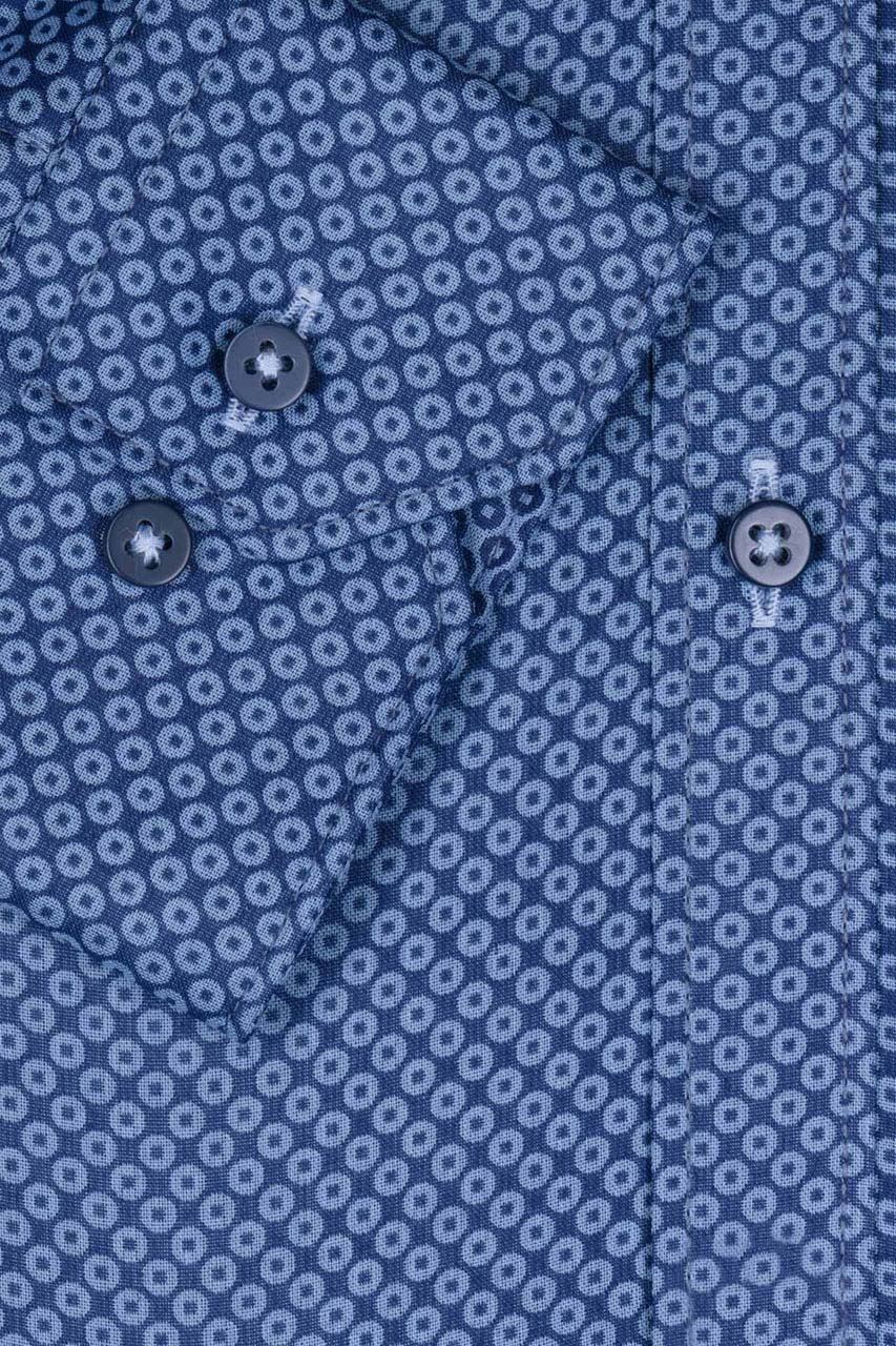 Granatowa koszula w geometryczny wzór. Utrzymana w kolorystyce granatu i błękitu. Model zapinany na granatowe guziki przyszyte błękitną nicią. Wykonana w całości z wysokiej jakości bawełny. Koszula o kroju slim fit. Świetny fason na mniej zobowiązujące spotkania.