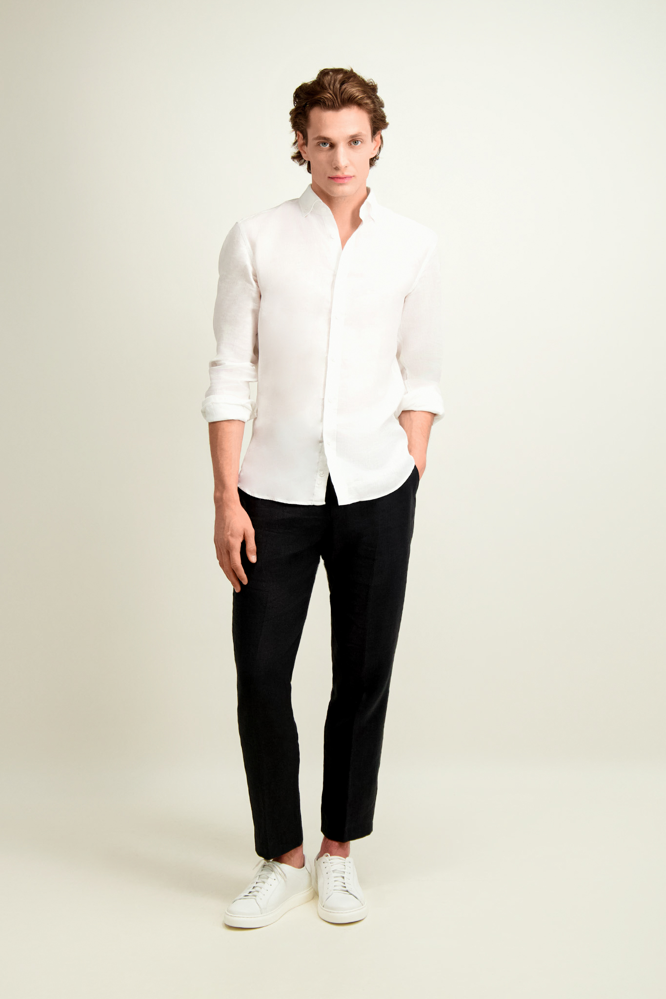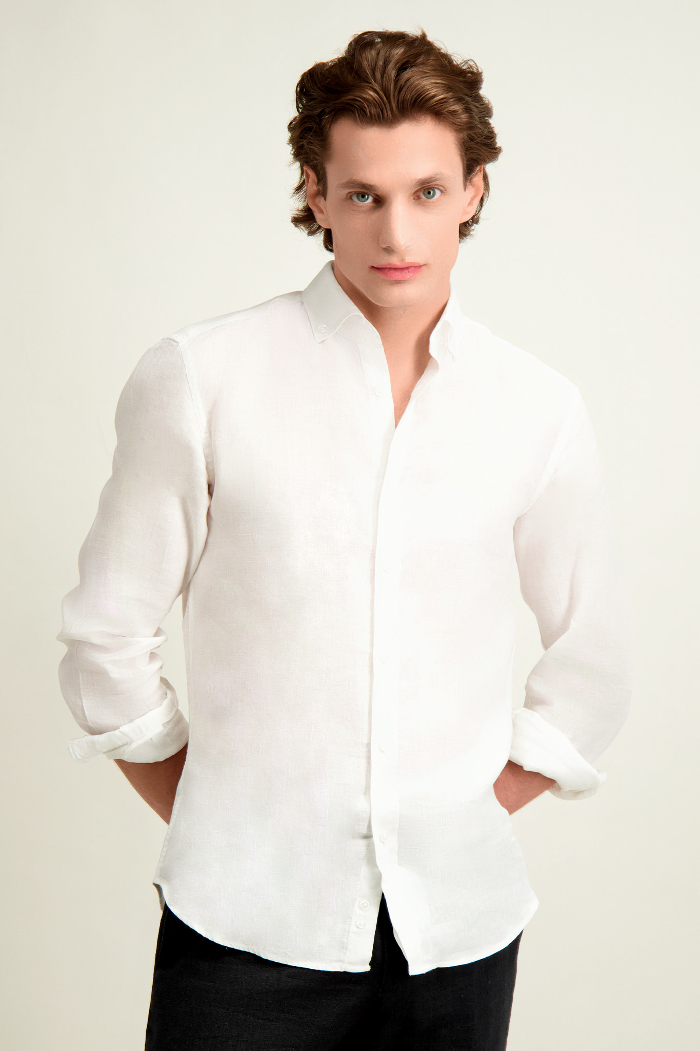 Biała koszula męska z długim rękawem. Uszyta z lnianej tkaniny o gładkim deseniu. Model o dopasowanym kroju slim.