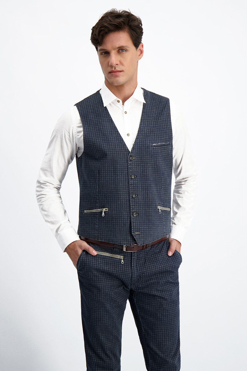 Kamizelka męska w pepitkę z efektem prania. Wykonana z dobrej jakości bawełny, utrzymanej w granatowej tonacji. Z przodu dwie kieszenie dwuwypustkowe, zapinane na zamek i brustasza. Z tyłu rozcięcie w szpic oraz pasek w beżowym kolorze ułatwiający regulację. Przód modelu wykończony szwem AMF nawiązującym do tradycyjnego krawiectwa. Kamizelka idealna do półformalnych zestawów ze spodniami typu chino i marynarką. Doskonale prezentuje się również w stylizacji z samą koszulą.
