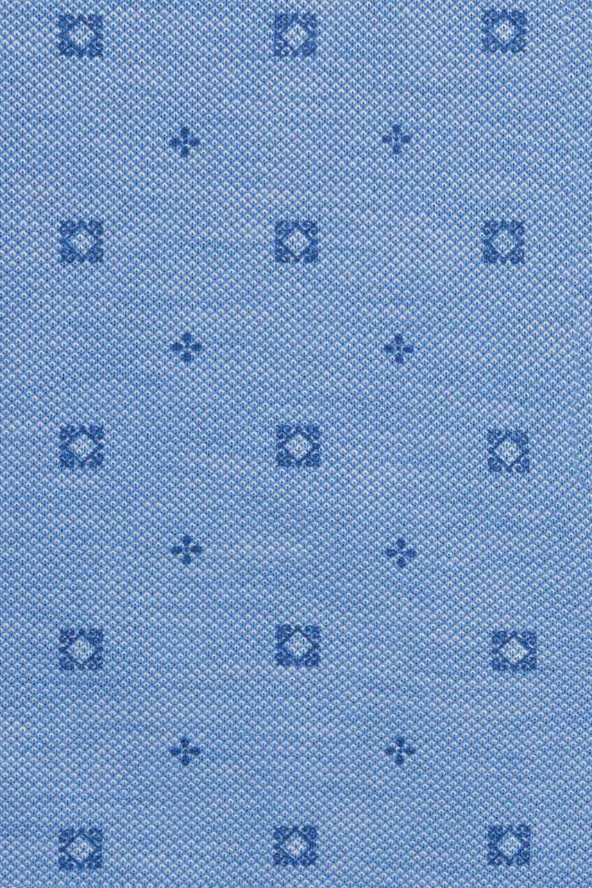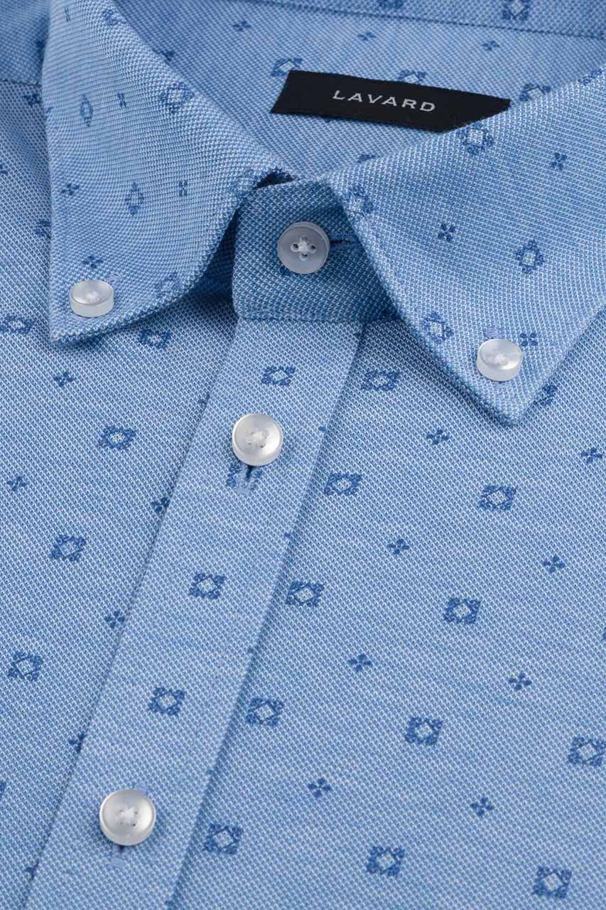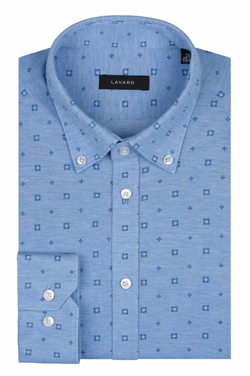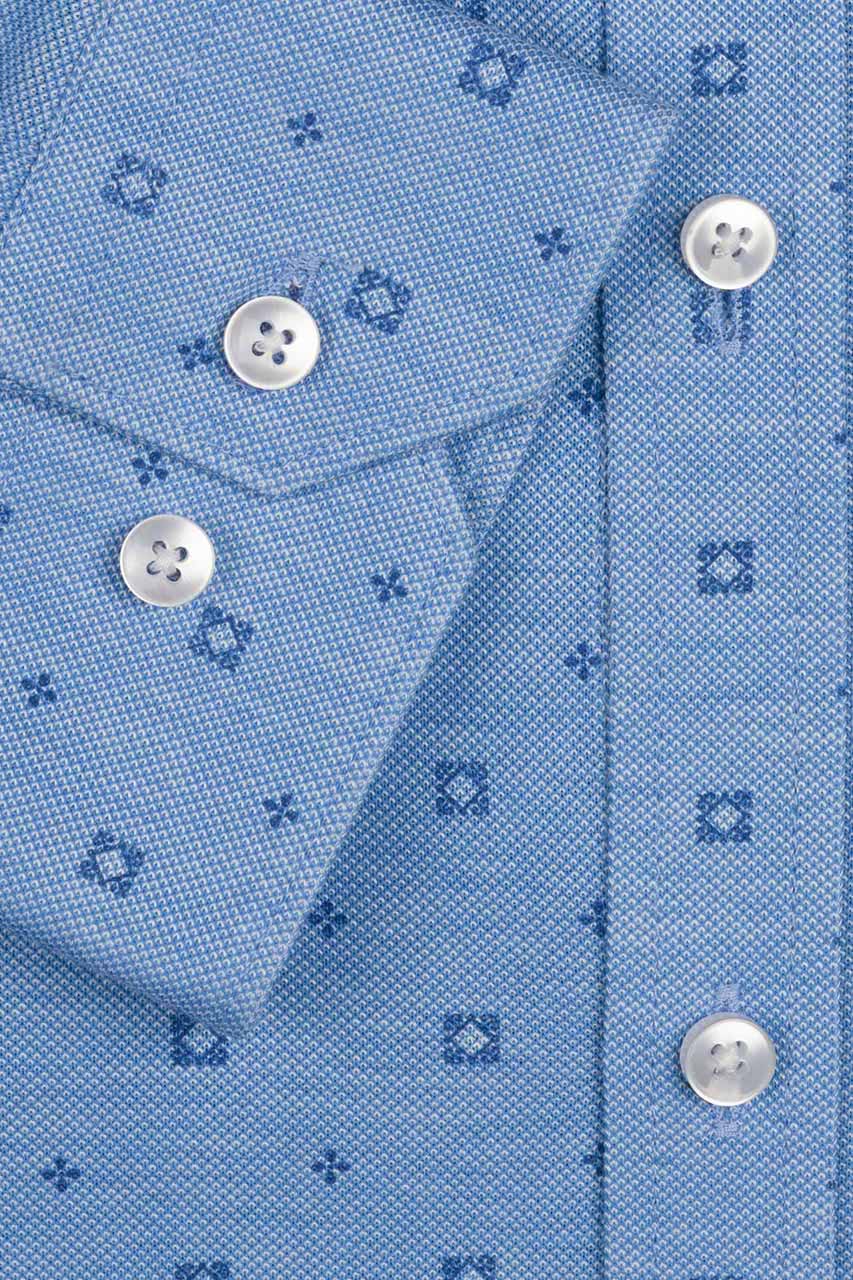 Koszula męska wykonana z przyjemnego w dotyku materiału w niebieskim odcieniu. Materiał z delikatną strukturą w geometryczne wzory. Casualowy model z kołnierzykiem „button down”. Zapinany na perłowe guziki. Koszula o kroju slim fit, stanowi świetną propozycję do miejskich zestawień z spodniami typu chino.
