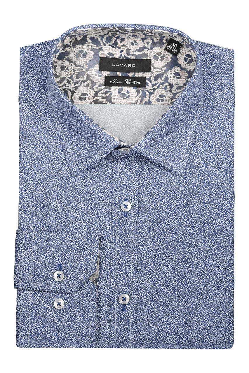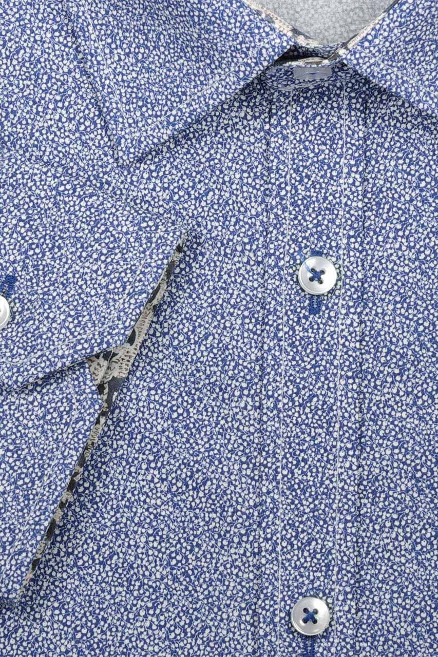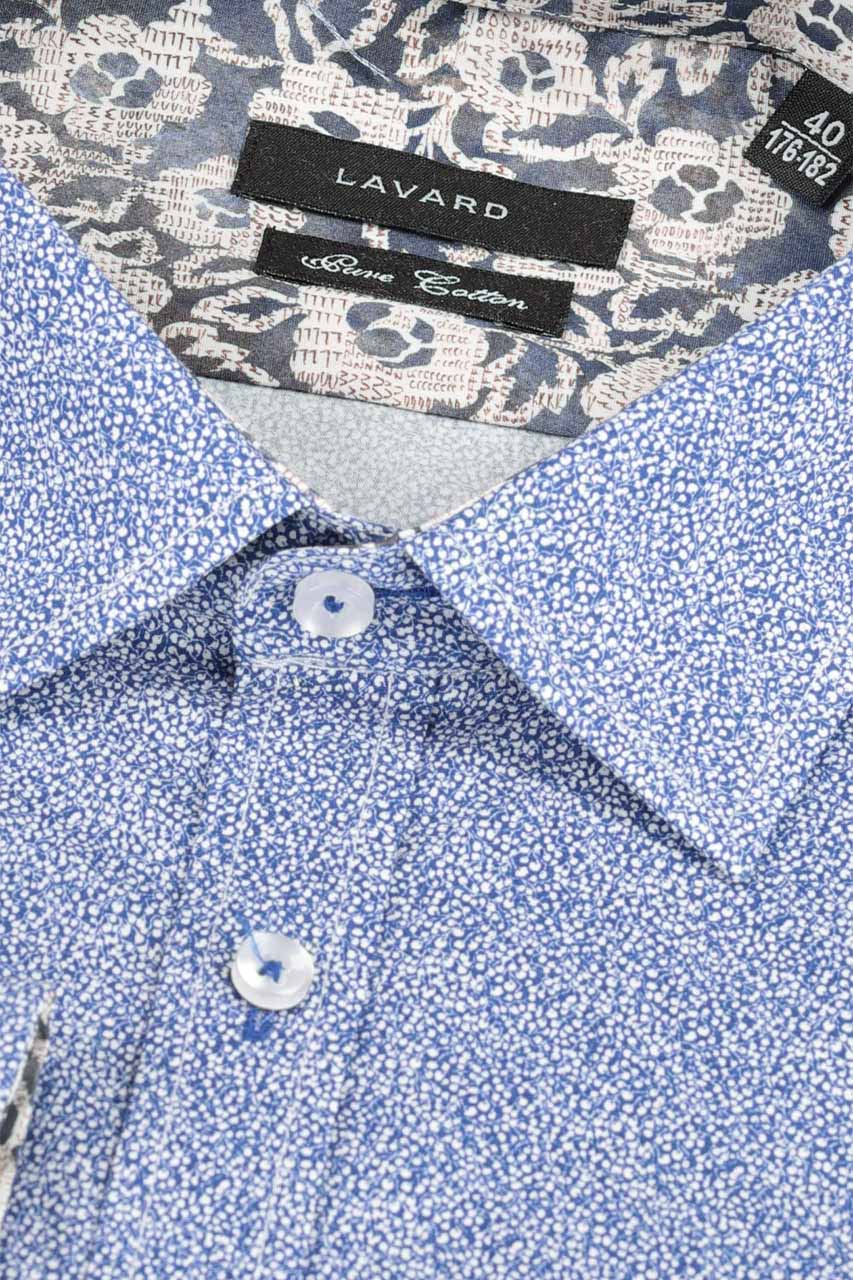 Niebieska koszula w mikro wzór wykonana z wysokiej jakości bawełny. Piękny model o modnym dopasowanym kroju, zapinany na guziki w perłowym odcieniu przeszyte kontrastowymi niebieskimi nićmi. Koszula fantastycznie prezentuje się z beżową lub granatową marynarką.