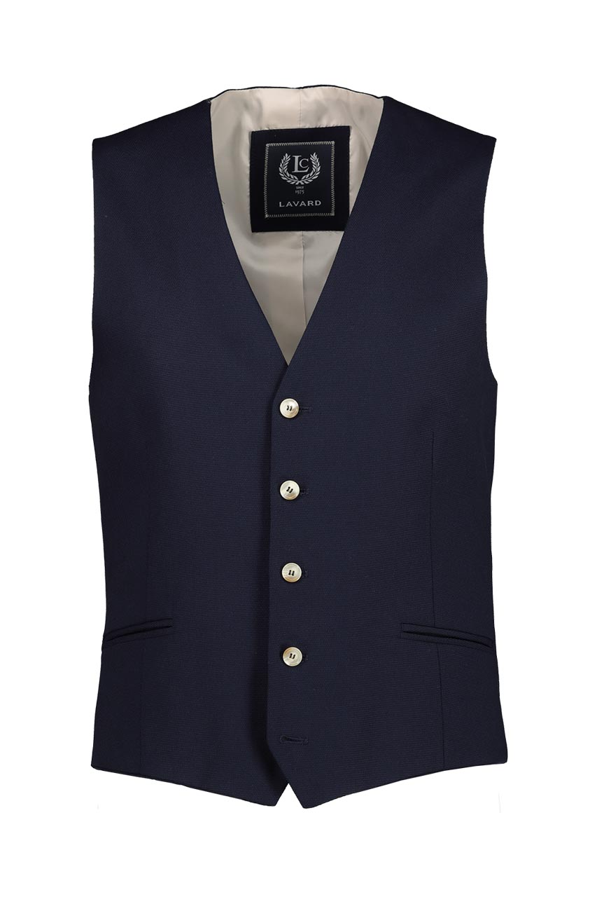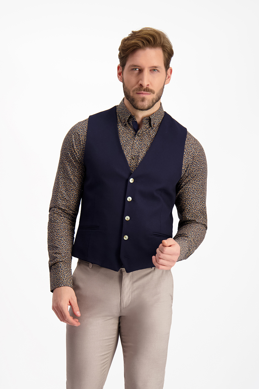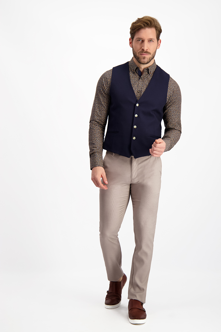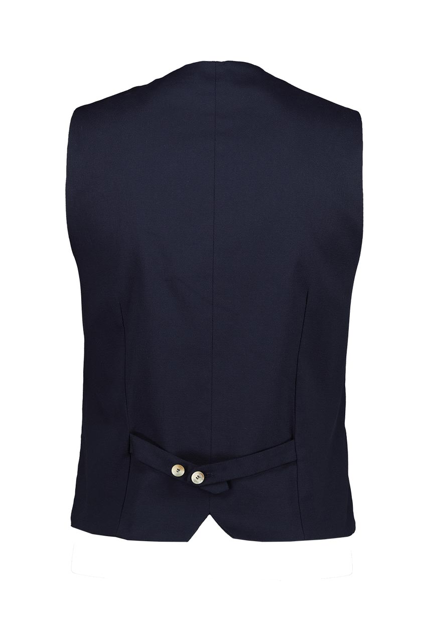 Granatowa kamizelka męska wykonana z bawełnianej i elastycznej tkaniny z delikatną strukturą. Świetny, casualowy model zapinany na jasne guziki. Posiada wygodną regulację z tyłu. Z przodu dwie kieszenie dwuwypustkowe. Propozycja idealna do miejskich zestawień zarówno z marynarką jak i z samą koszulą.
