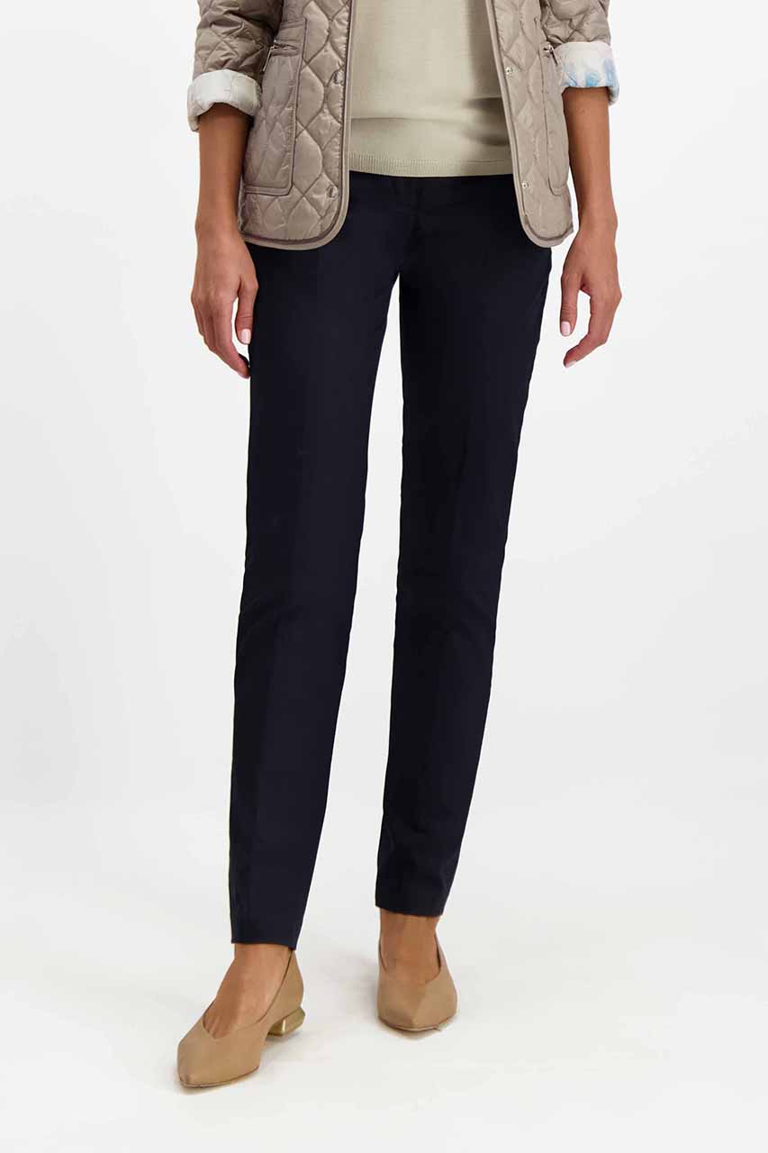 Klasyczne granatowe spodnie damskie o kroju cygaretek. To model, który jest szczególnie ceniony w oficjalnej modzie biurowej. Dzięki zawartości elastanu tkanina fantastycznie dopasowuje się do sylwetki i optycznie podkreśla kobiecą sylwetkę. Cygaretki damskie są obowiązkowym elementem każdego garnituru damskiego, który współcześnie jest ciekawym zamiennikiem sukienki. Zestawione z klasycznymi czółenkami na obcasie, białą koszulą oraz ciekawą apaszką stworzą look współczesnej businesswoman. Modelka ma 175 cm wzrostu. Prezentuje rozmiar 36.