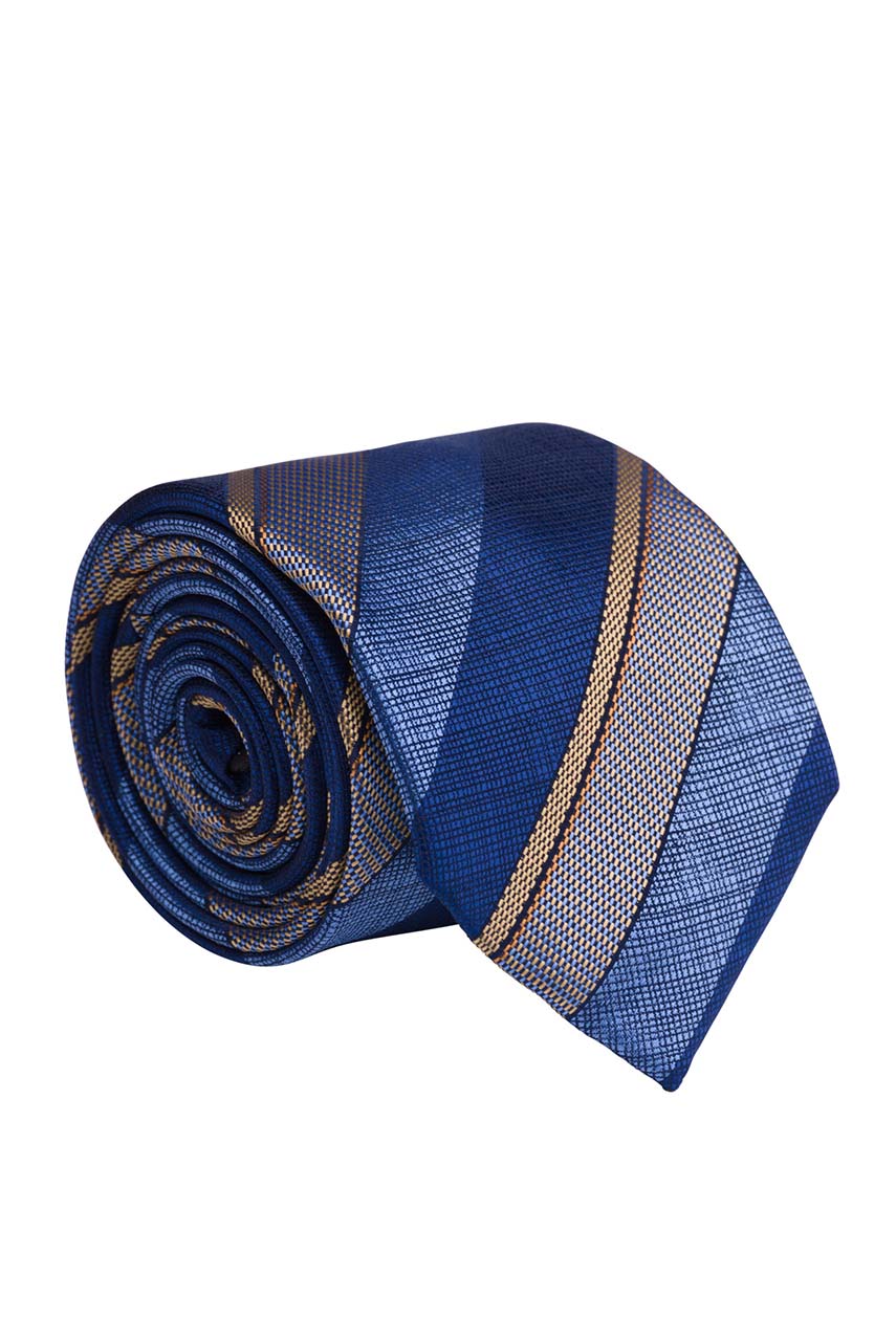 Męski krawat w skośne pasy w różnych odcieniach niebieskiego. Z delikatnym akcentem jasnych kolorów. Krawat świetnie pasuje do granatowych lub szarych marynarek, znakomity dodatek do biznesowych stylizacji.