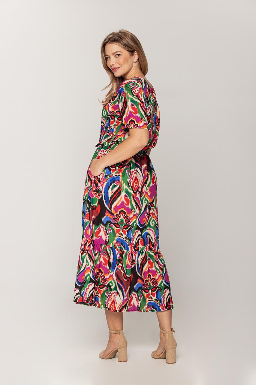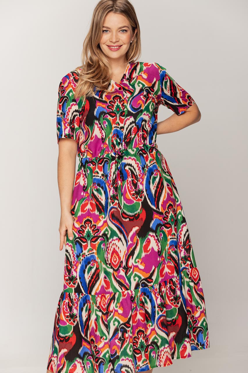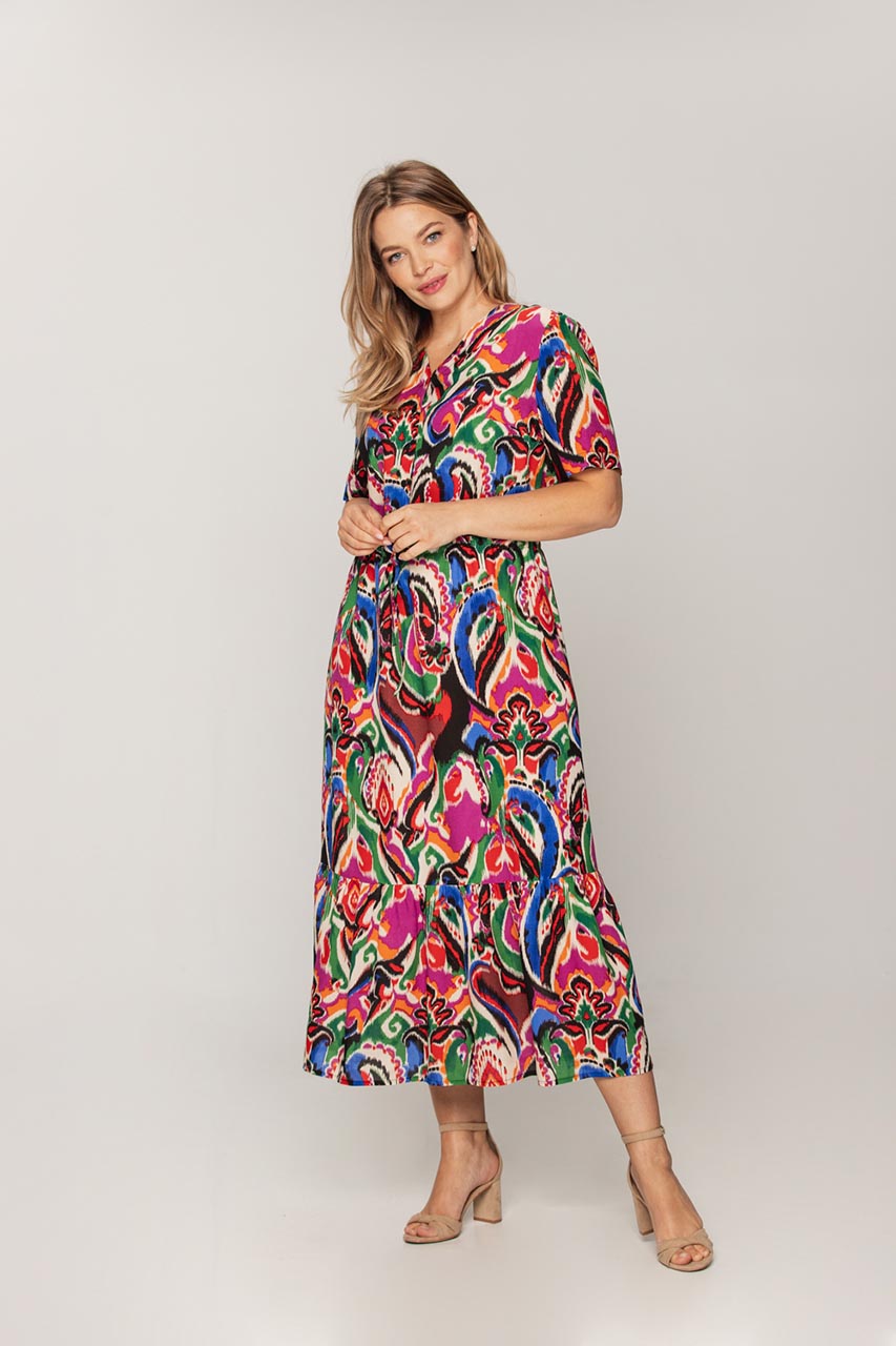 Kolorwa sukienka dla kobiet, które pragną urozmaicić swoją szafę i przede wszystkim swoje stylizacje. Model zakończony na dole falbaną. Posiada wszyty tunel w pasie z wygodną regulacją, dzięki czemu sukienkę można idealnie dopasować w talii. Propozycja uszyta w 100% z wiskozy, dzięki czemu jest bardzo komfortowa w użytkowaniu nawet podczas największych upałów.