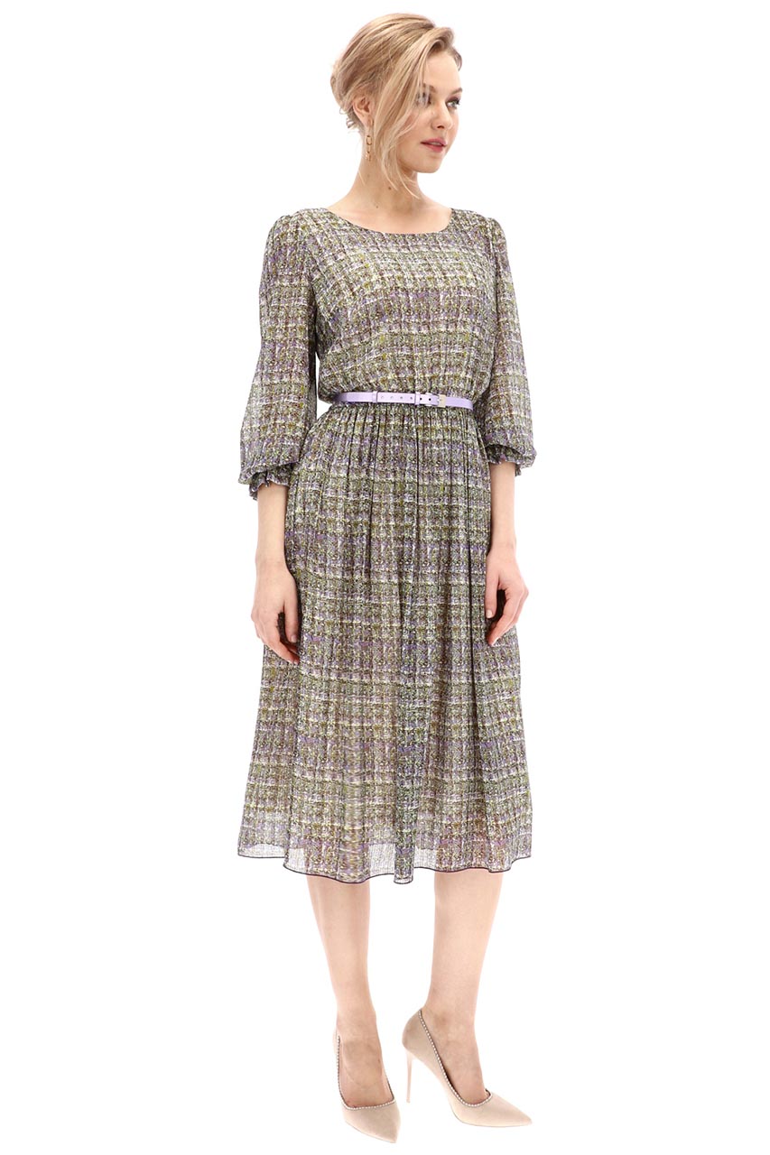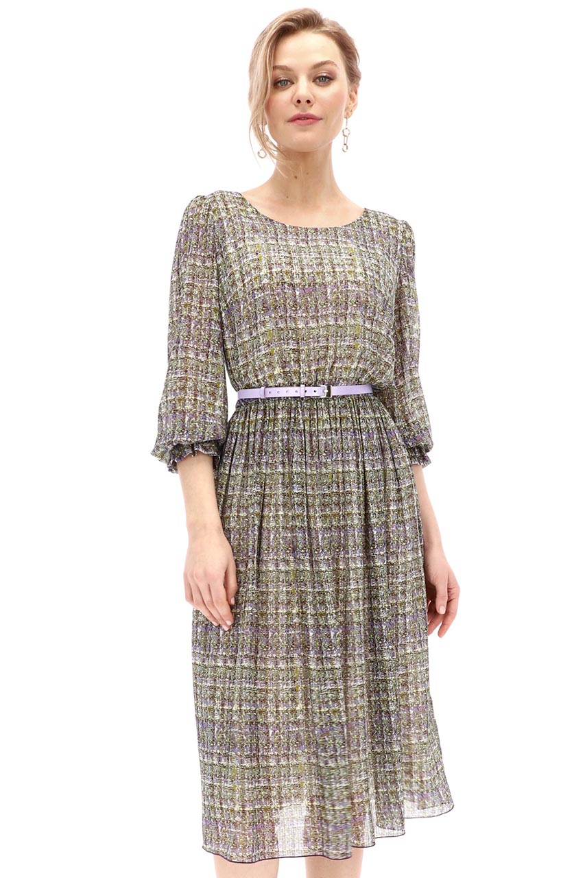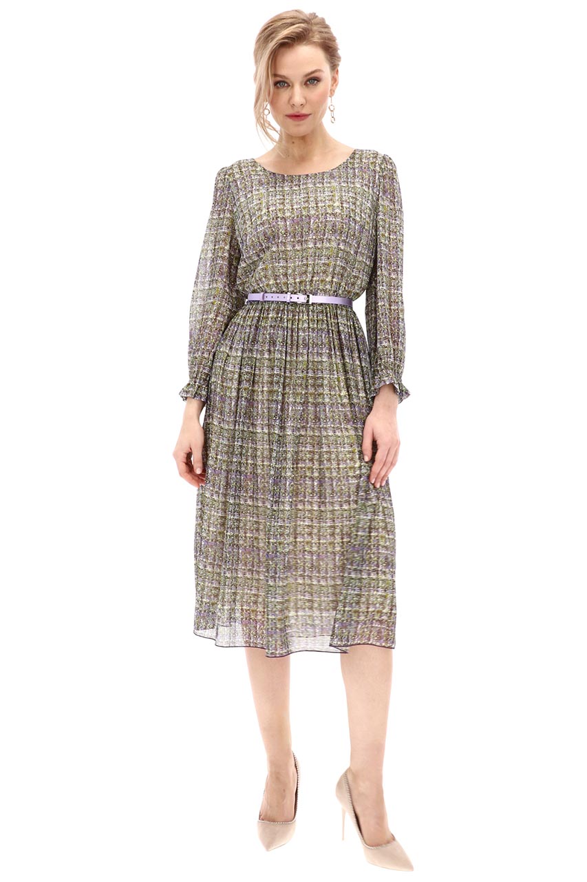 Zwiewna sukienka na podszewce. Model w wersji maxi, który posiada gumkę w pasie. Dodatkowo do sukienki dołączono pasek w fioletowym kolorze. Sukienka z długim rękawem zakończonym gumką i delikatną falbanką. Sukienka świetnie sprawdzi się podczas niezobowiązujących spotkań.