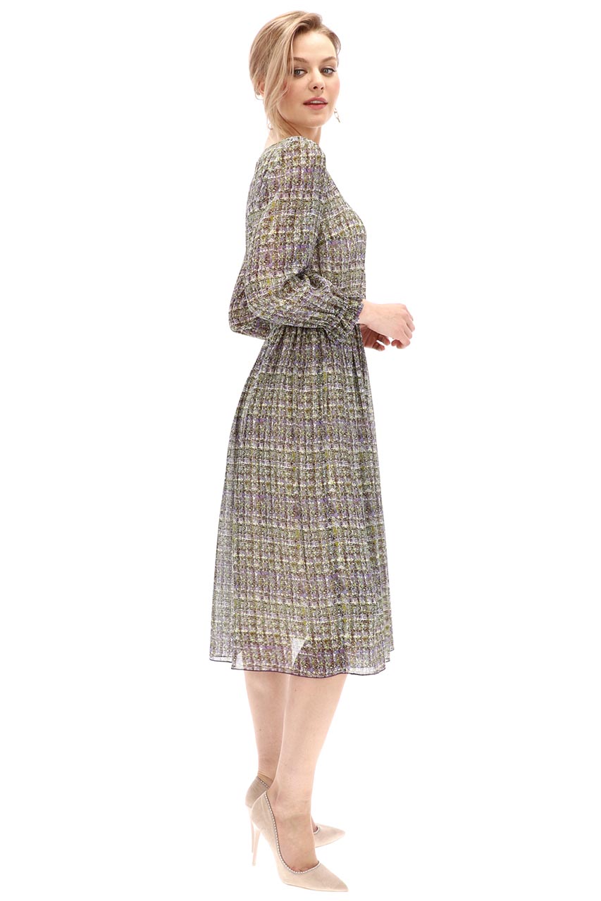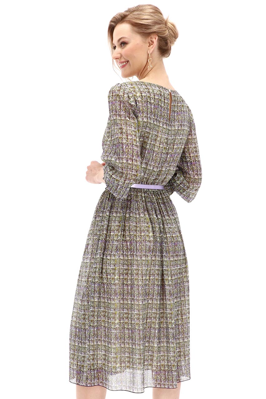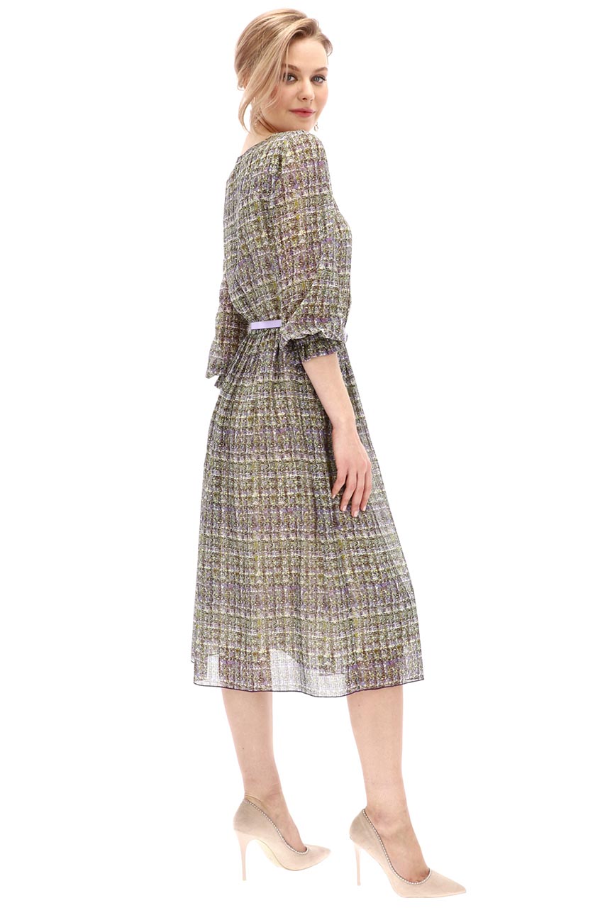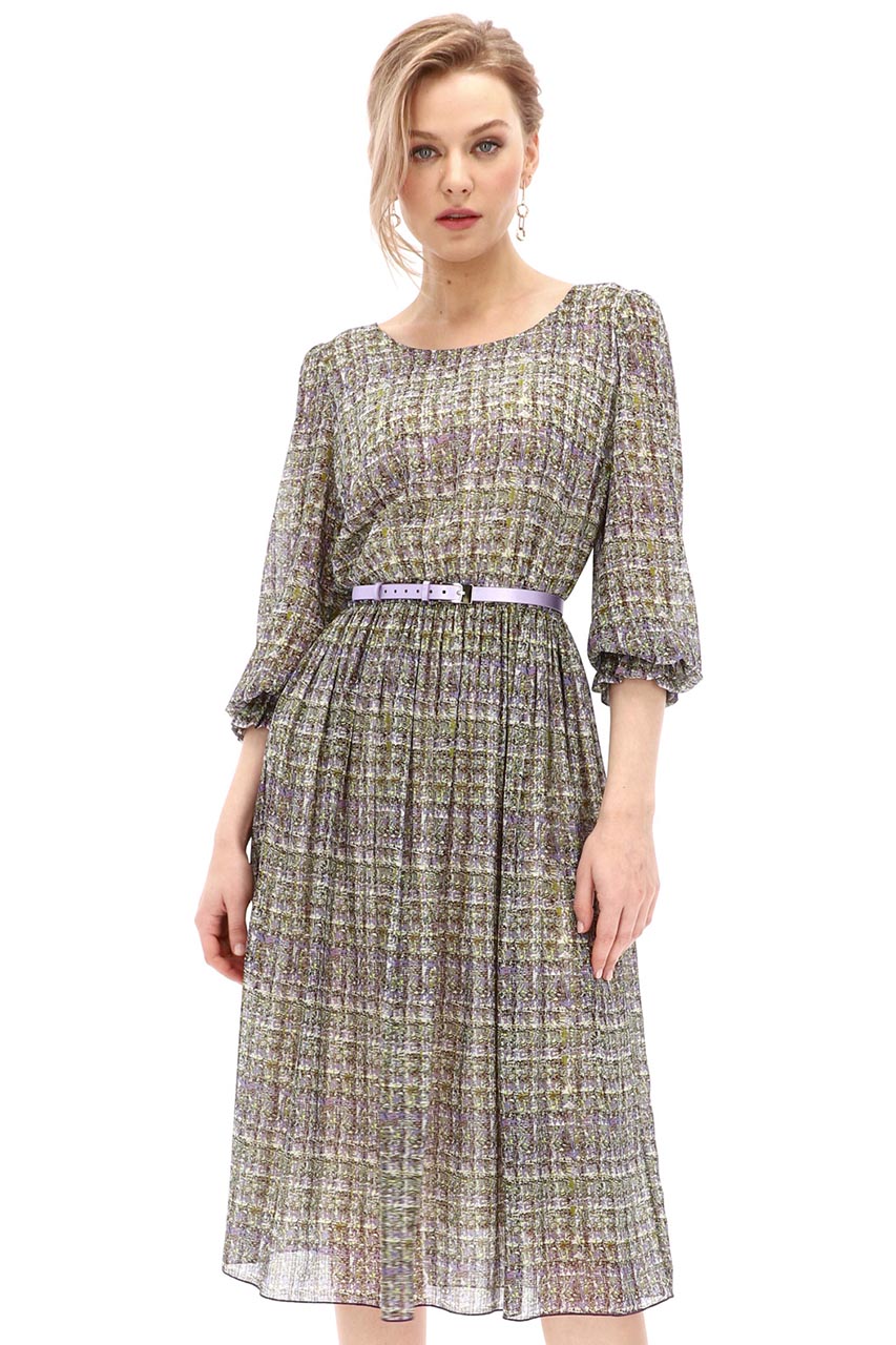 Zwiewna sukienka na podszewce. Model w wersji maxi, który posiada gumkę w pasie. Dodatkowo do sukienki dołączono pasek w fioletowym kolorze. Sukienka z długim rękawem zakończonym gumką i delikatną falbanką. Sukienka świetnie sprawdzi się podczas niezobowiązujących spotkań.