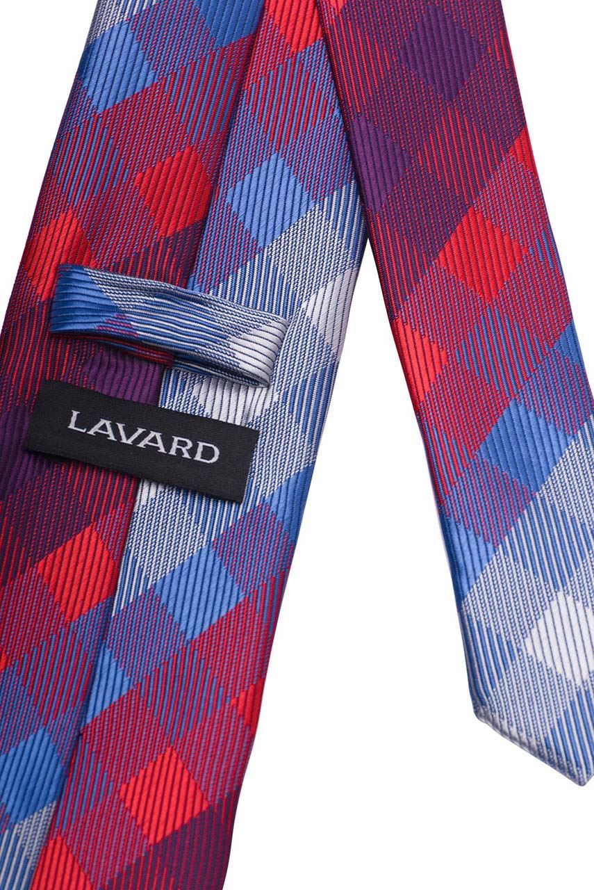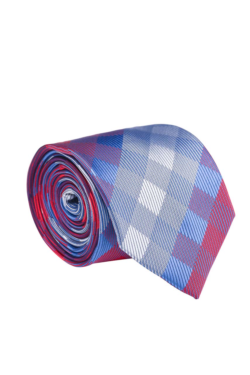 Krawat w kratę utrzymaną w kolorach czerwonym, szarym i niebieskim. Doskonała alternatywa dla klasycznych, stonowanych modeli. Wykonany ręcznie, z przyjemnej w dotyku tkaniny.