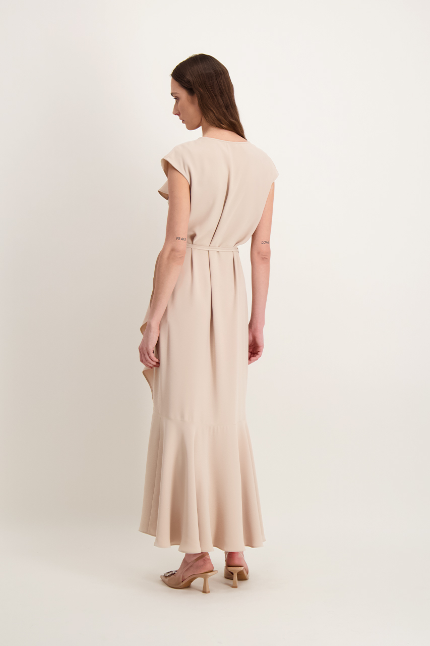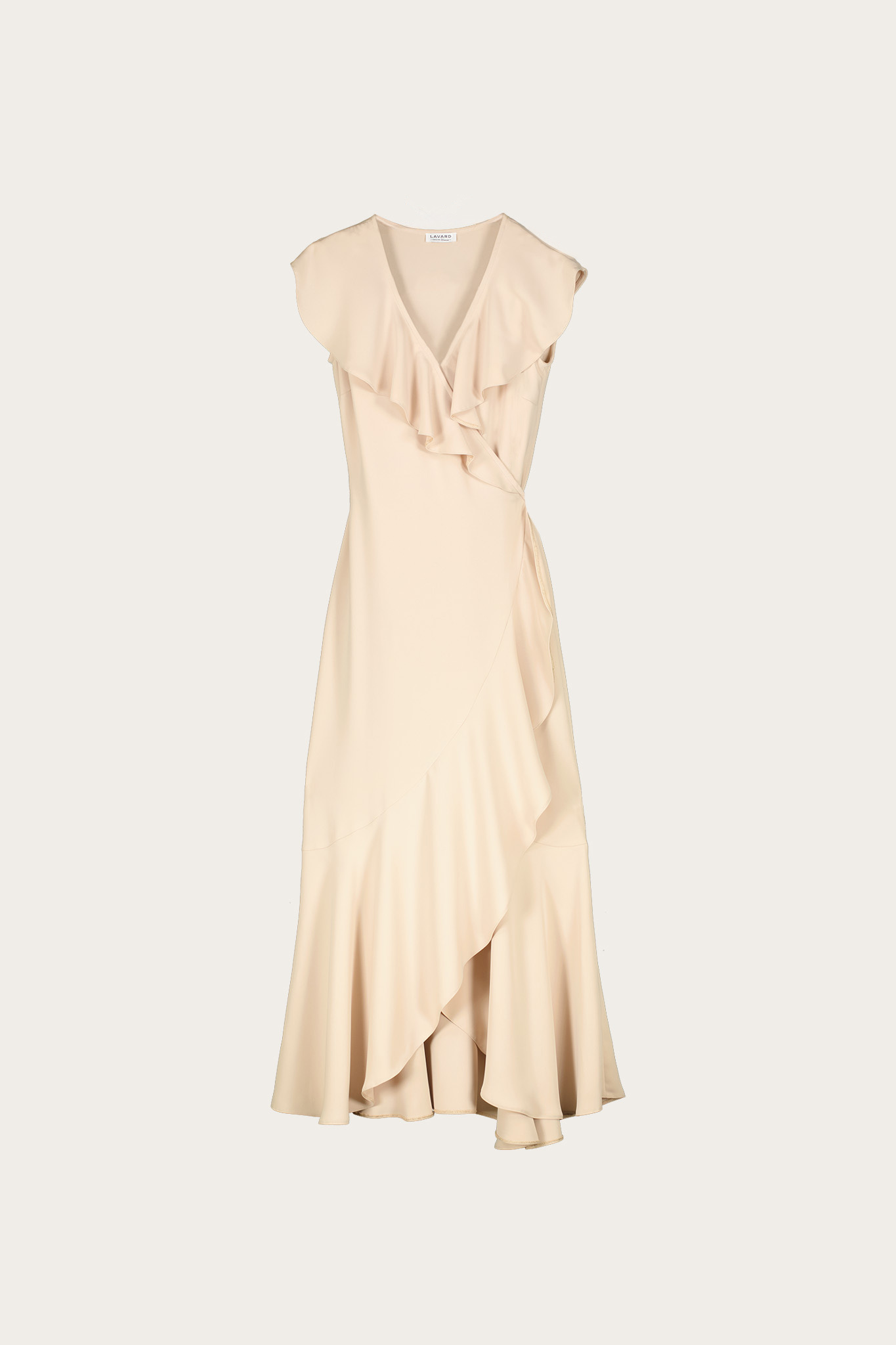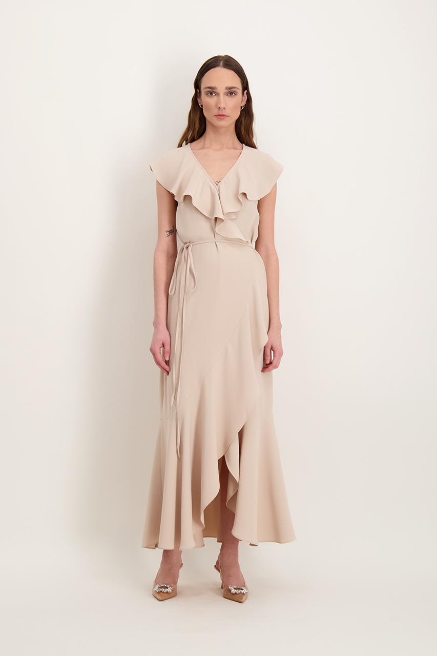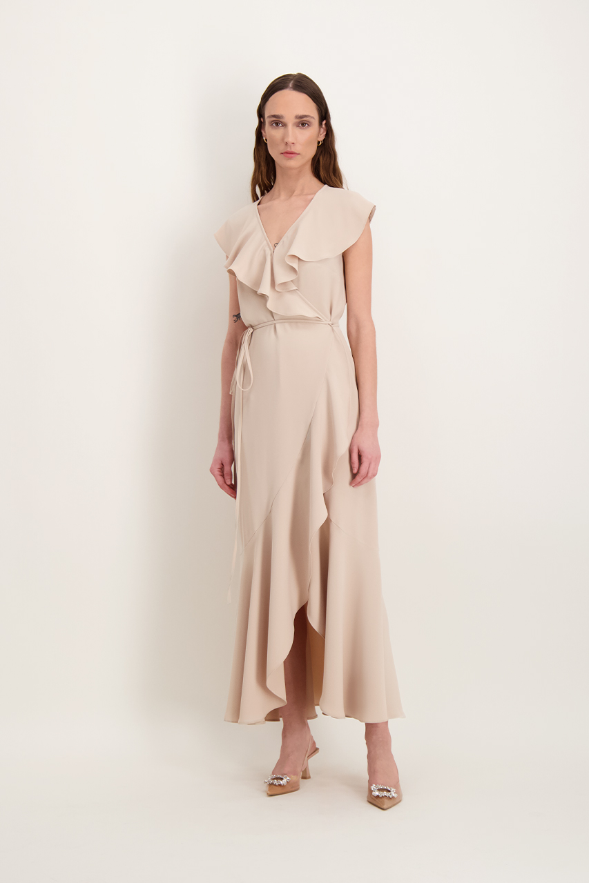 Kopertowa sukienka uszyta z lekkiej i zwiewnej tkaniny niepodatnej na zagniecenia. Posiada wiązanie w tali oraz dodatkowe zapięcie w dekolcie. Modelka ma 174 cm wzrostu. Prezentuje rozmiar 36. Wyprodukowano w Polsce.
