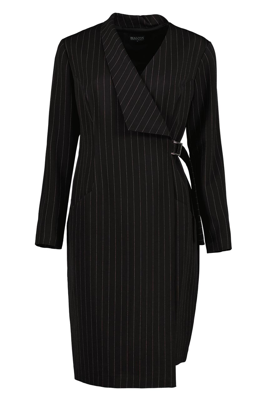 Czarna, klasyczna sukienka kopertowa z ozdobnym białym prążkiem. Dekoracyjnym elementem kreacji jest fantazyjny dekolt ze srebrną klamrą. Sukienka posiada wygodne kieszenie oraz taliowanie. Dzięki niemu kobieca sylwetka jest optycznie wyszczuplona. Dekolt układający się w literę V dodatkowo eksponuje szyję, którą warto wtedy przyozdobić biżuterią. Proponowana sukienka to ciekawa odsłona klasycznej „małej czarnej”, która zachwyca oryginalnym wzorem oraz przyciągającymi uwagę detalami.
