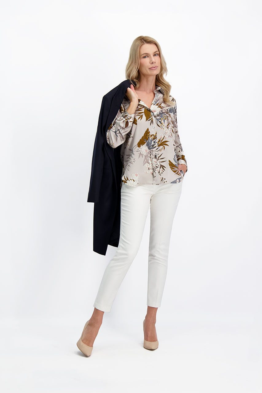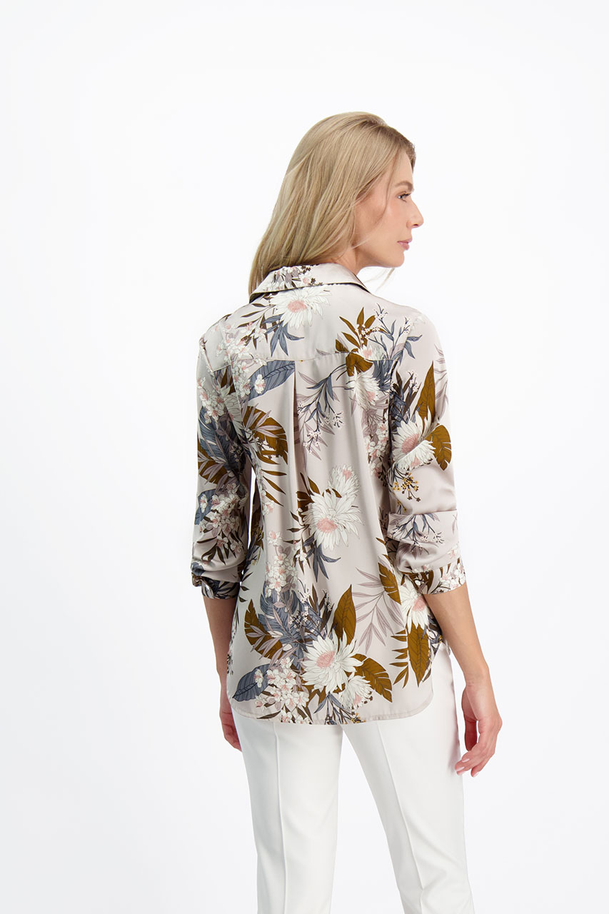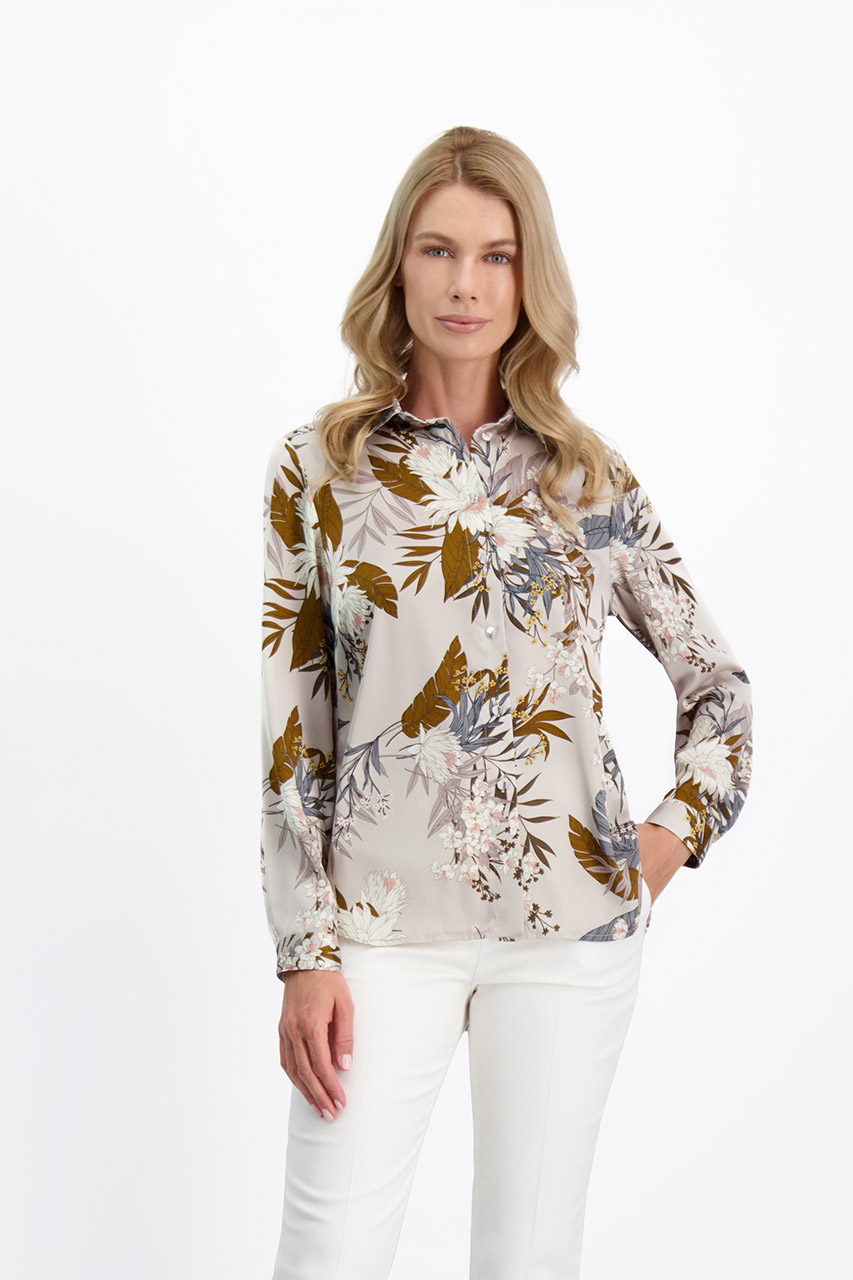 Koszula damska z klasycznym kołnierzykiem i długim rękawem. Model uszyty z delikatnej tkaniny o satynowym połysku. Bluzkę zdobi kwiatowy motyw w zgaszonych, jesiennych odcieniach, a także biżuteryjne, srebrne guziki. Modelka ma 175 cm wzrostu i prezentuje rozmiar 36. Wyprodukowano w Polsce.