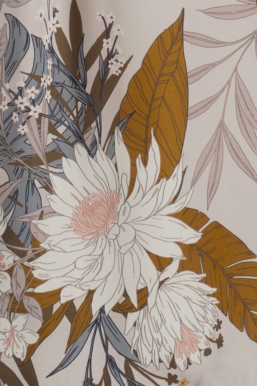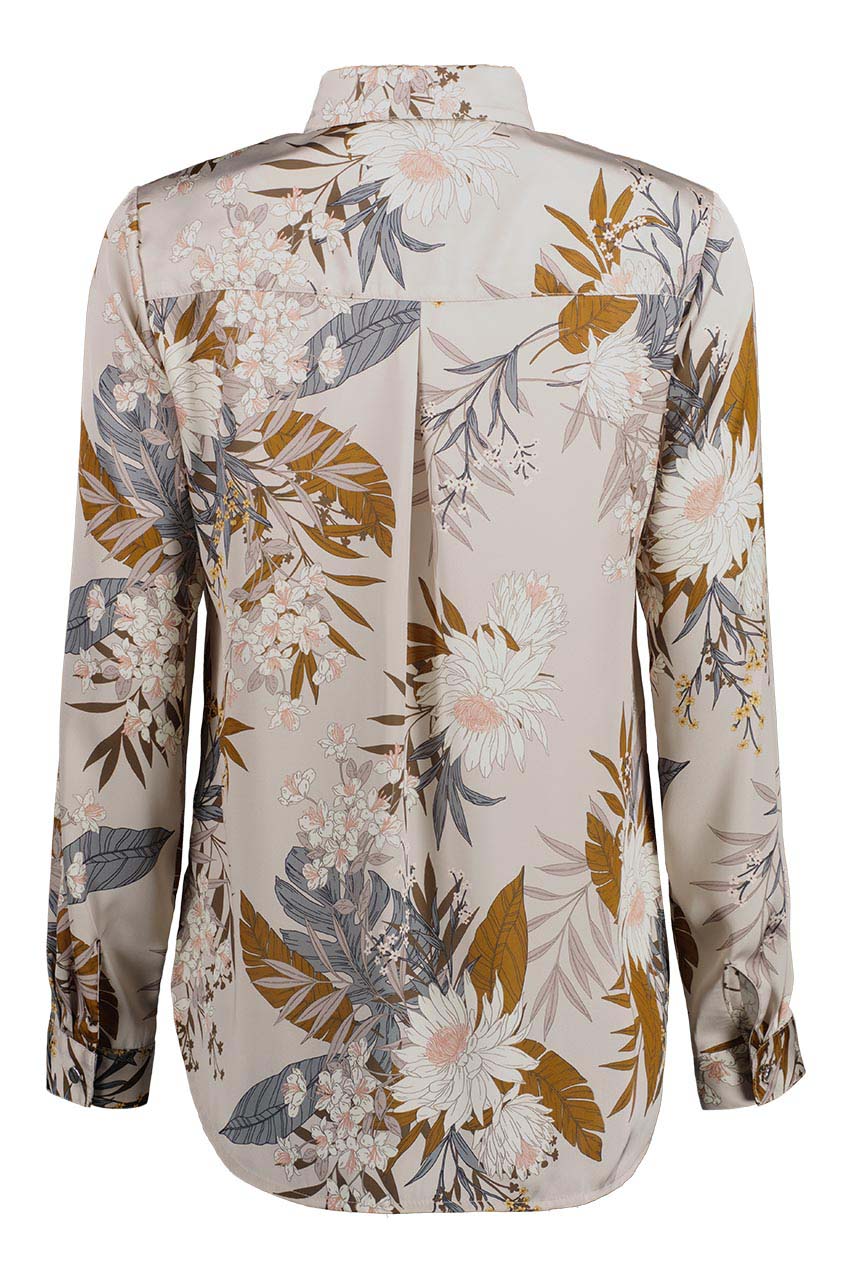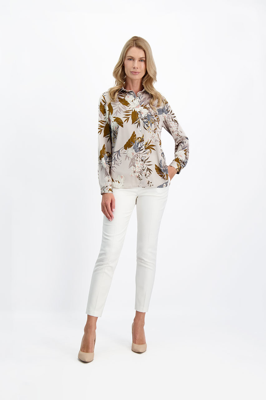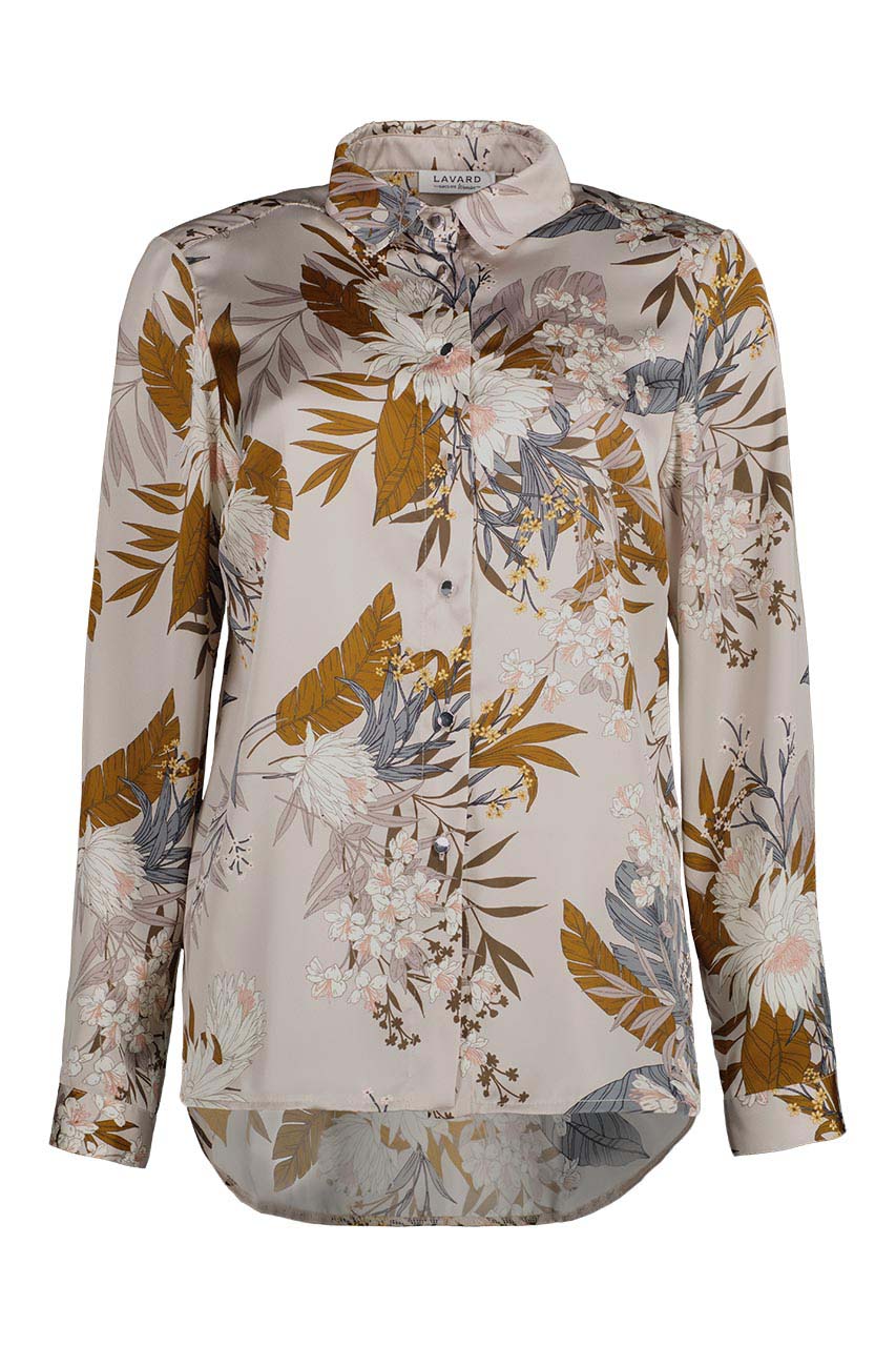 Koszula damska z klasycznym kołnierzykiem i długim rękawem. Model uszyty z delikatnej tkaniny o satynowym połysku. Bluzkę zdobi kwiatowy motyw w zgaszonych, jesiennych odcieniach, a także biżuteryjne, srebrne guziki. Modelka ma 175 cm wzrostu i prezentuje rozmiar 36. Wyprodukowano w Polsce.