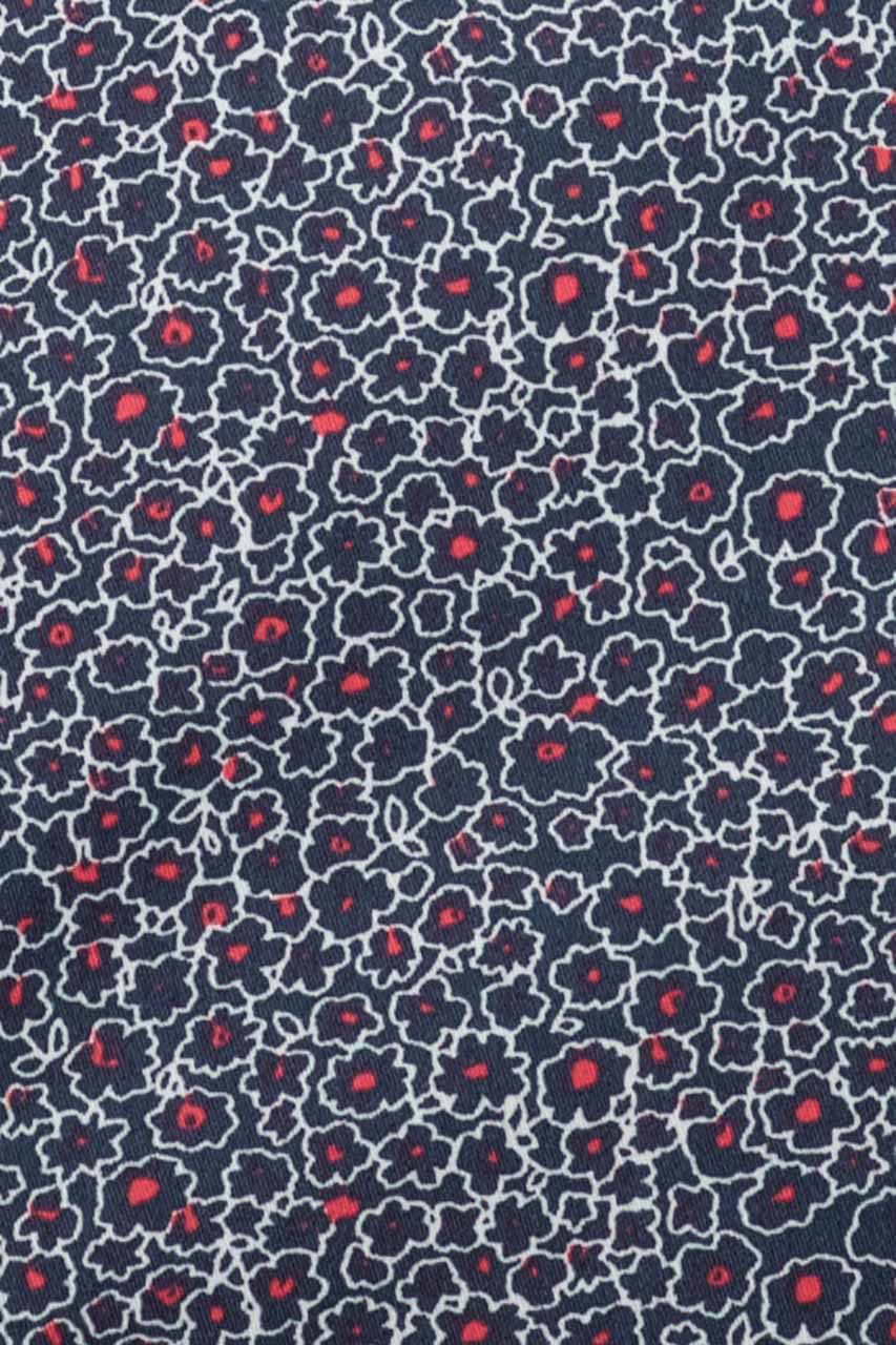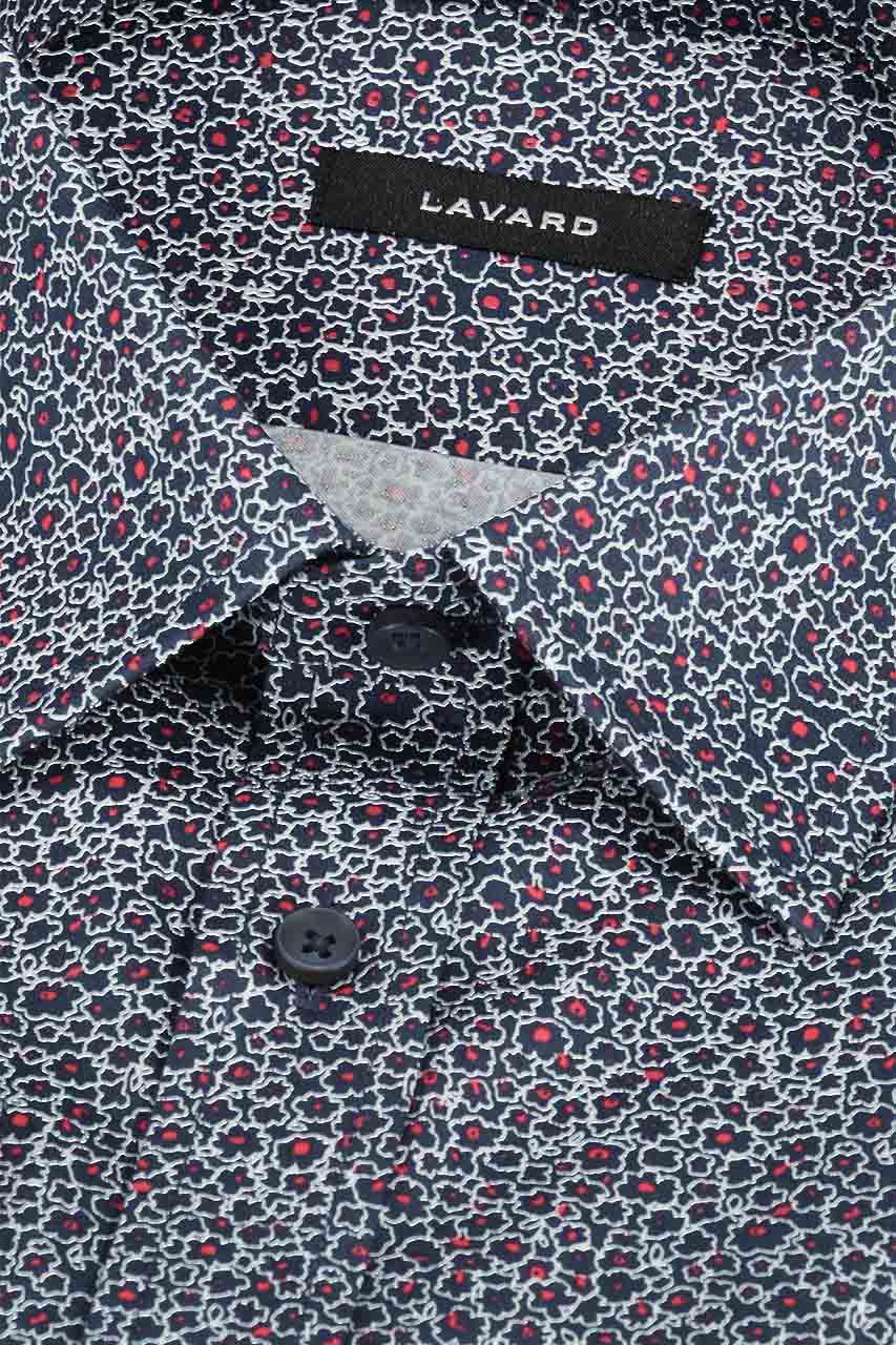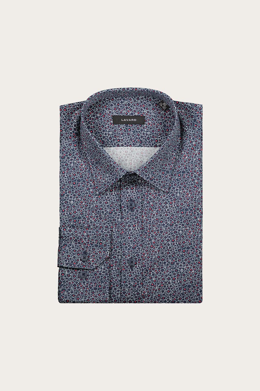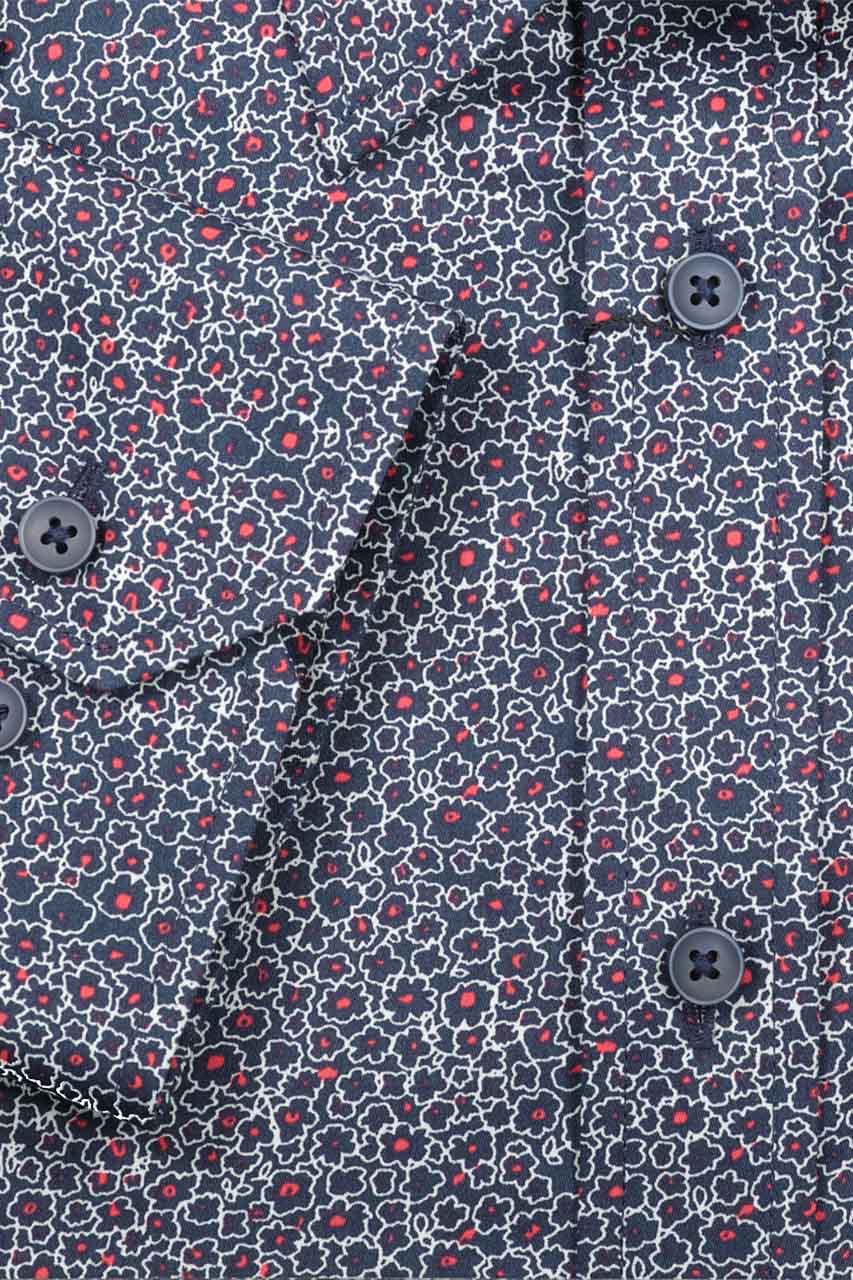 Granatowa koszula we wzory. Model z długim rękawem, uszyty z bawełny. Koszula o dopasowanym fasonie. Mankiety z regulacją na guziki.