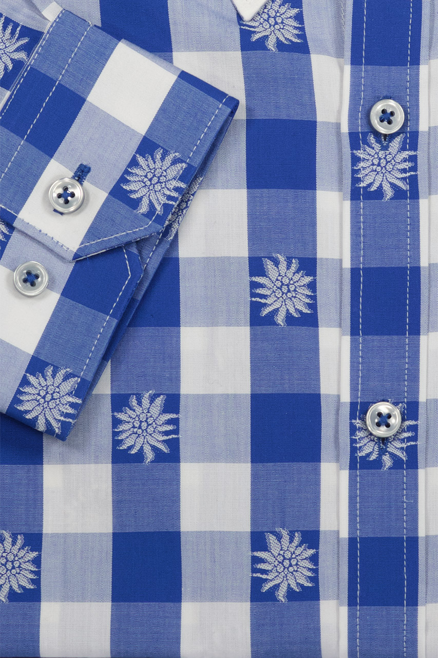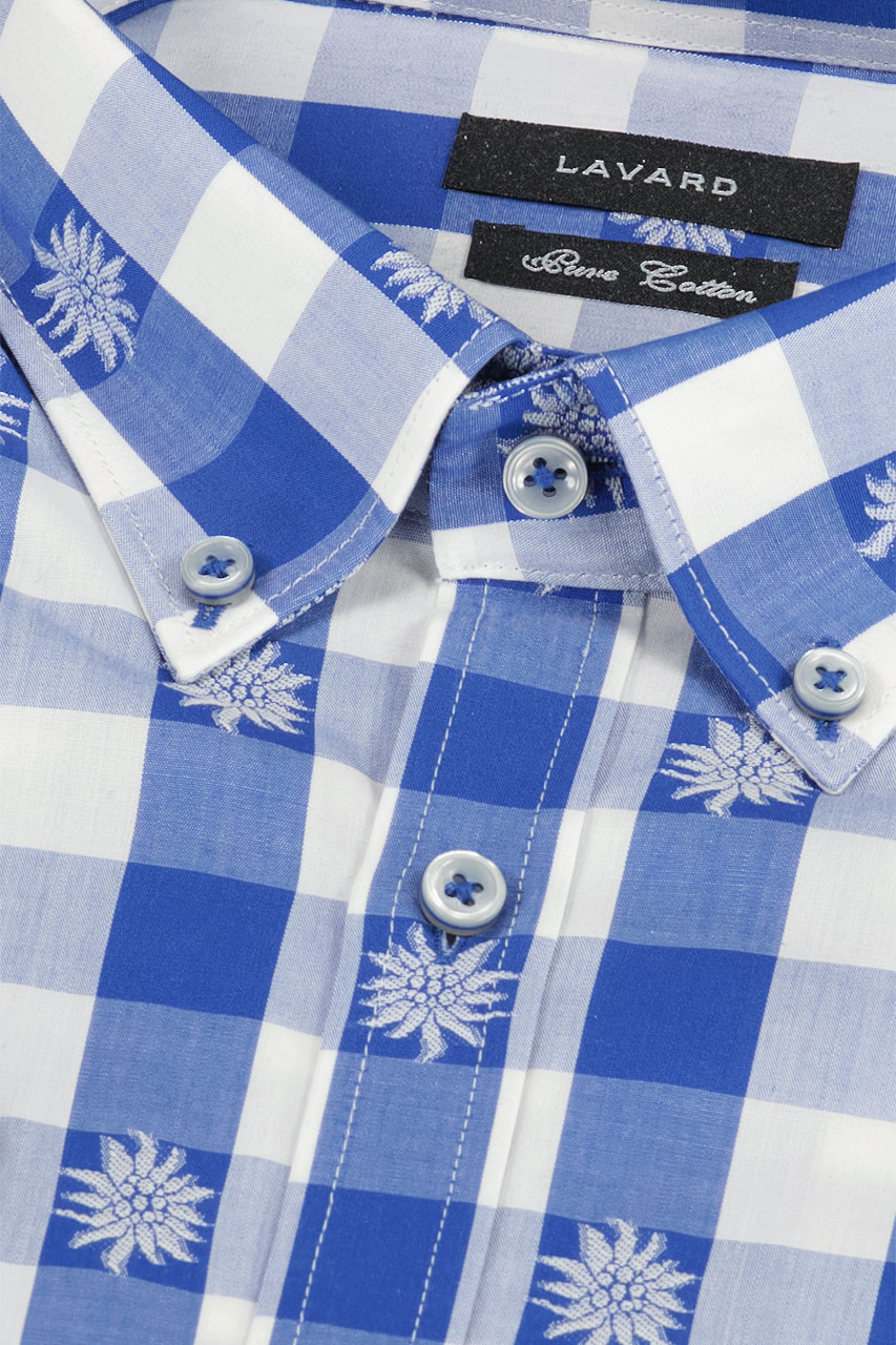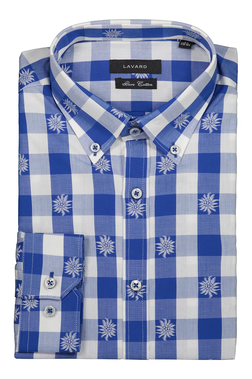 Koszula w biało-niebieską kratę z motywem szarotki. Wzór nawiązuje do regionów górskich, Tatr, gdzie korzenie swe ma marka Lavard. Niebanalny model, który znajdzie uznanie w oczach każdego indywidualisty. Koszula o modnym, dopasowanym kroju. Uszyta z wysokiej jakości bawełny, dzięki czemu jest bardzo komfortowa w użytkowaniu. Propozycja doskonale sprawdzi się w mniej formalnych stylizacjach.
