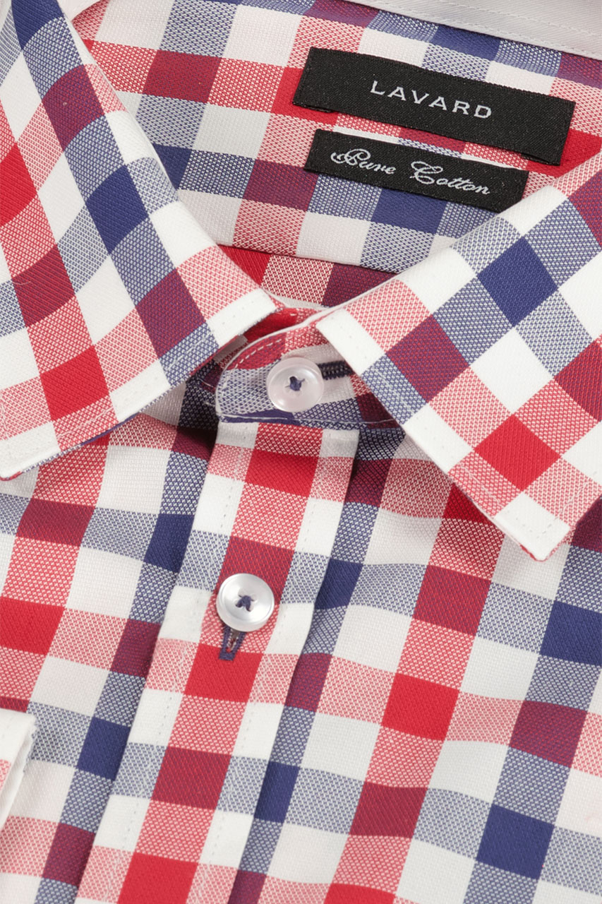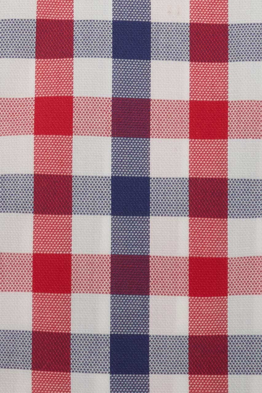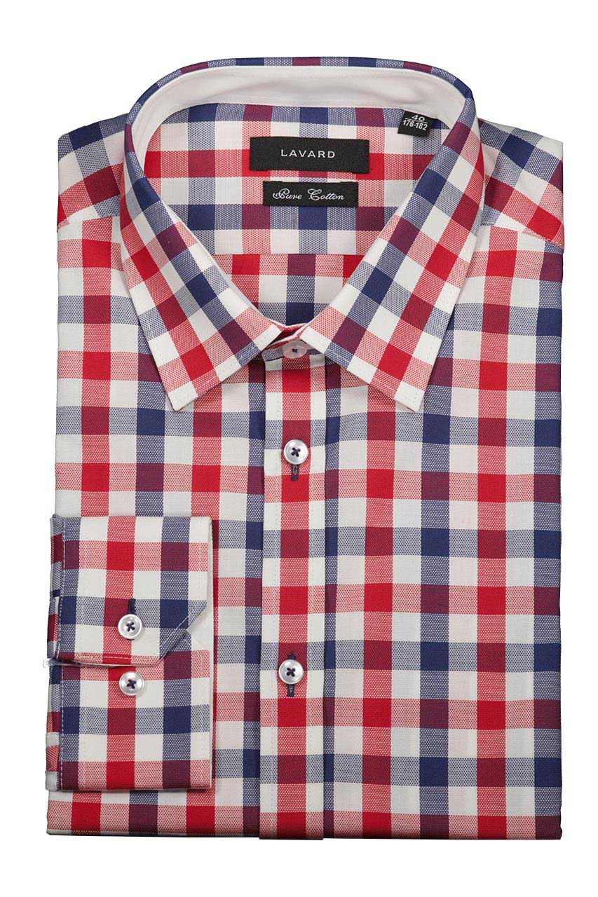 Koszula męska typu slim w czerwono-biało-granatową kratkę, z klasycznym kołnierzykiem typu Kent. Koszula posiada długi rękaw oraz świetnie nadaje się do klasycznych jeansów lub chinosów. Została uszyta z miękkiej i przewiewnej tkaniny bawełnianej, dlatego jest świetną propozycją na lato. To model idealny dla panów, którzy na co dzień wybierają mniej formalny ubiór. Świetnie sprawdzi się także w zestawieniu z szortami oraz mokasynami.