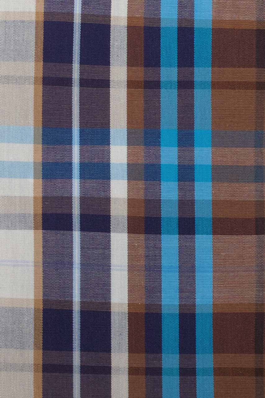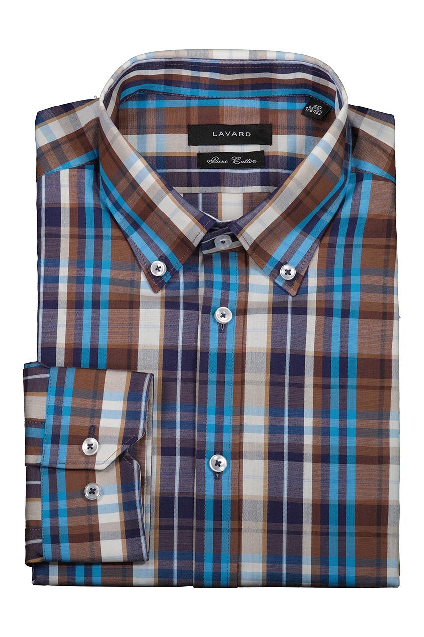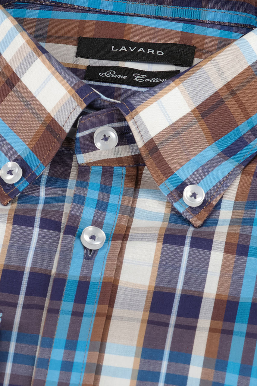 Casualowa koszula męska w niebiesko-biało-brązową kratkę. Posiada przypinany kołnierzyk, długi rękaw oraz dopasowany krój. Oferowany model świetnie sprawdzi się w mniej formalnych stylizacjach z jeansami oraz trampkami. Z uwagi na miękką i przewiewną tkaninę koszula jest niezwykle komfortowa w użytkowaniu i będzie dobrym wyborem także podczas cieplejszych dni.