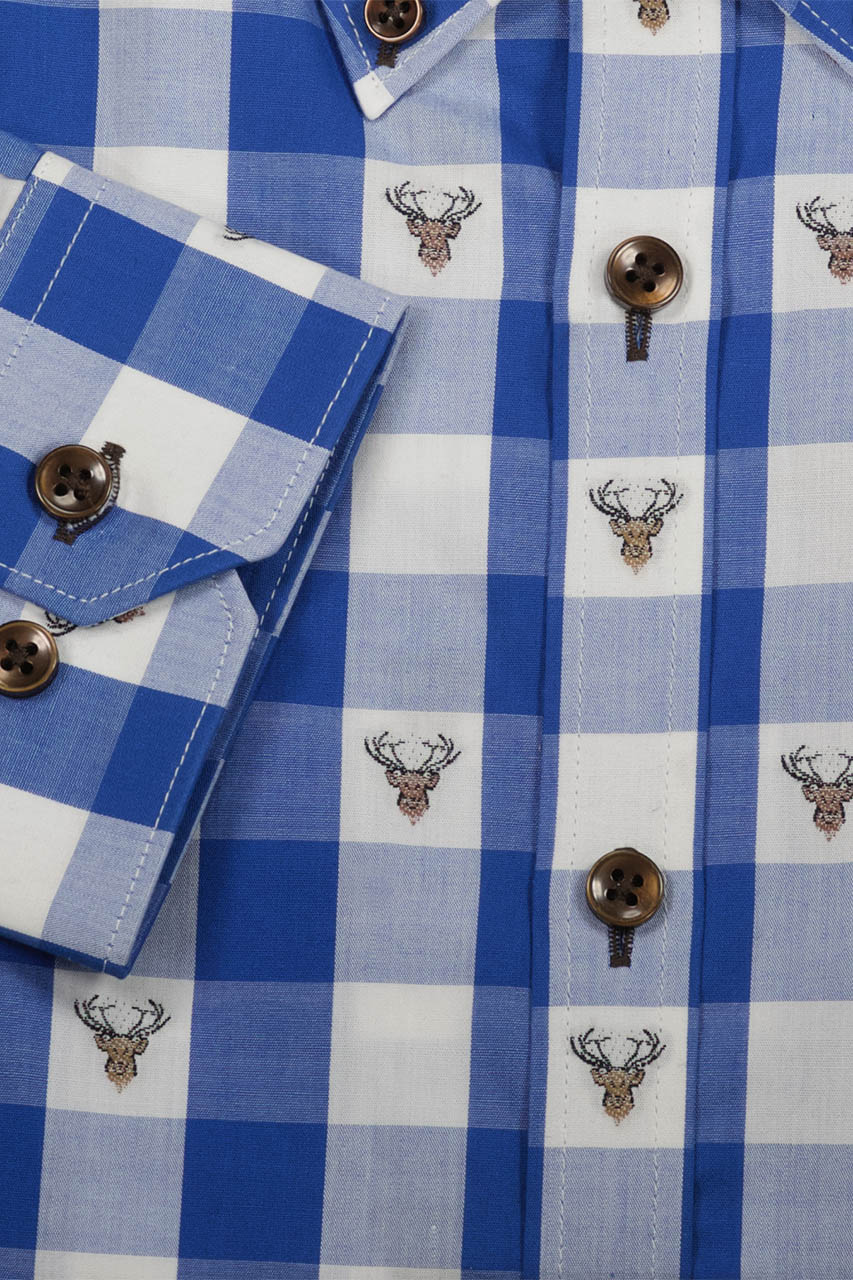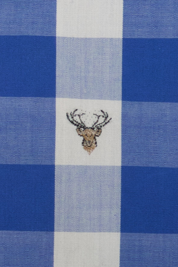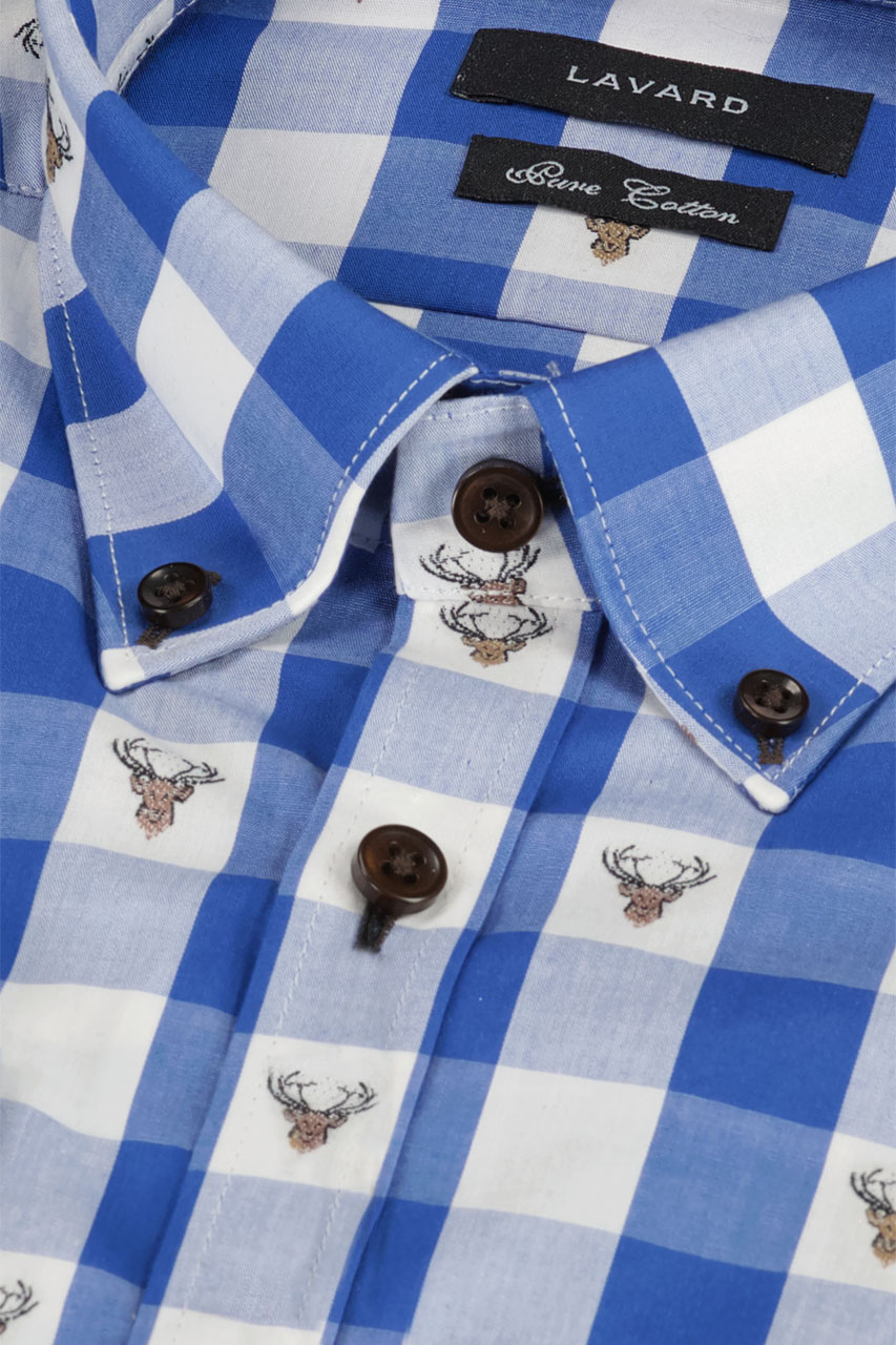 Koszula męska w niebieską kratkę z motywem zwierzęcym. Koszula posiada przypinany kołnierzyk typu „button down”, dlatego świetnie nadaje się do stylizacji casualowych np. z jeansami lub chinosami. Biało-niebieska kratka przypadnie do gustu panom, którzy cenią tradycyjną kolorystykę, a w swoim ubiorze chcą zawrzeć niebanalne detale. Miękka i komfortowa bawełna, z której powstała koszula z pewnością sprawdzi się podczas cieplejszych dni, a krój slim perfekcyjnie podkreśli sylwetkę.