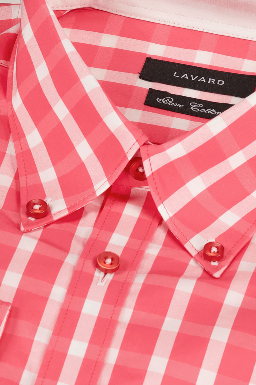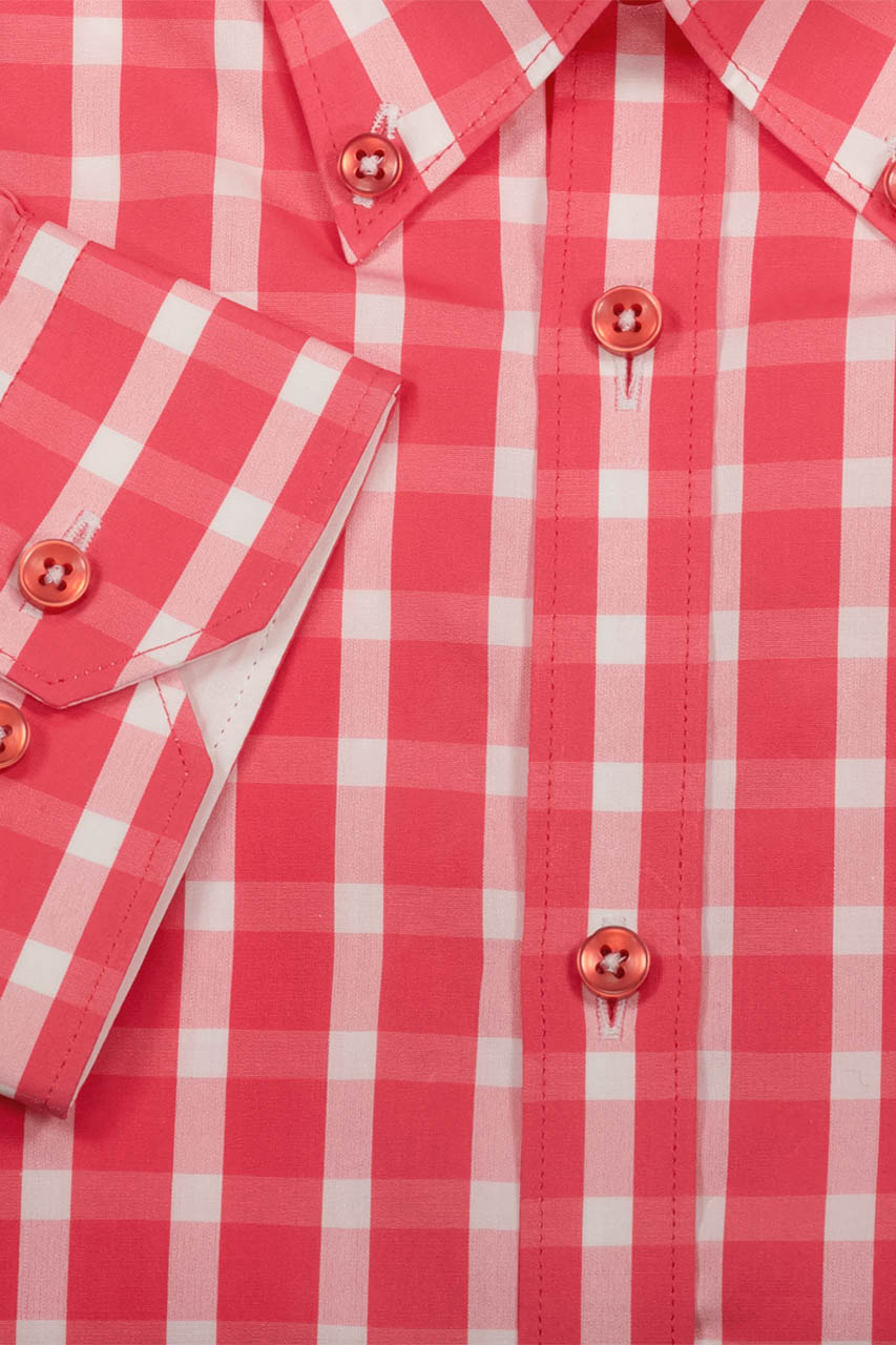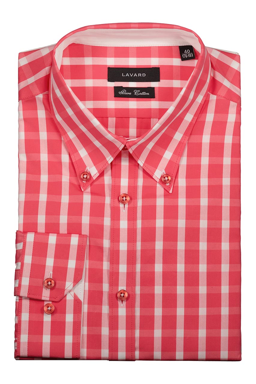 Koszula męska w różową kratkę z przypinanym kołnierzykiem typu „button down”. Została wykonana z przyjemnej oraz miękkiej bawełny oraz posiada wyszczuplony krój typu „slim”. Koszula świetnie sprawdzi się w casualowych stylizacjach z mokasynami oraz jeansami jako propozycja na weekendowy wypad lub grilla z przyjaciółmi. Jest to także koszula, która świetnie odnajdzie się w stylu smart casualowym do pracy.