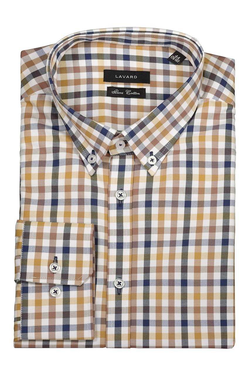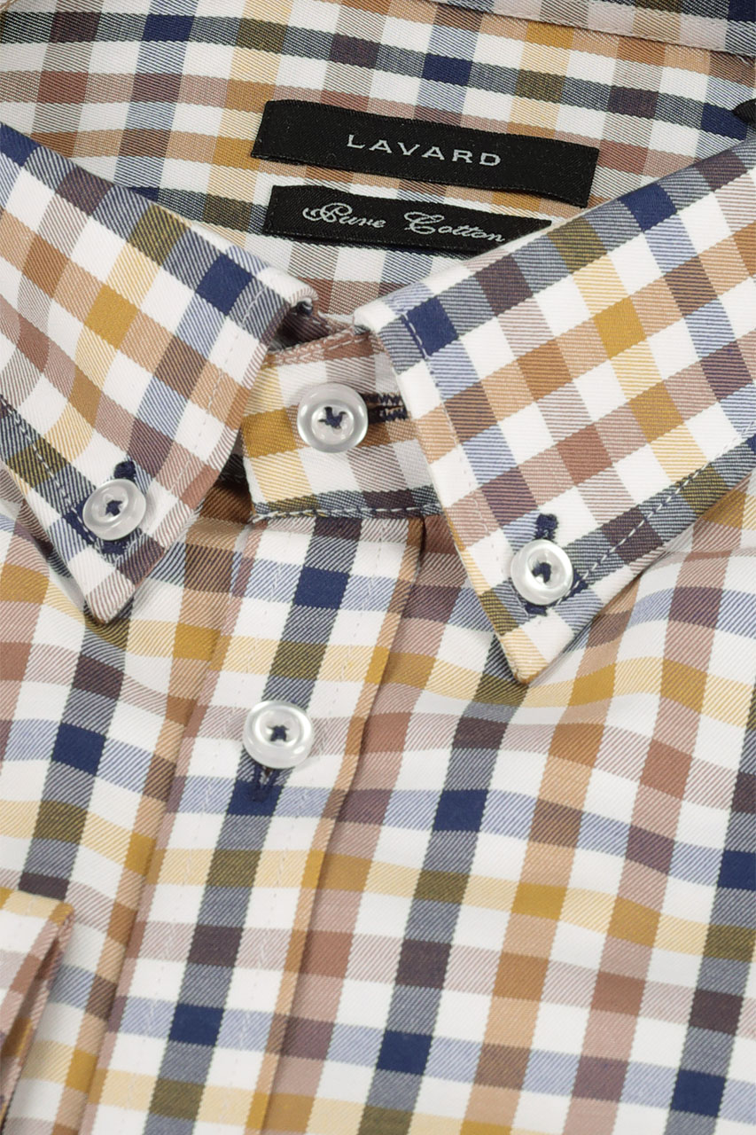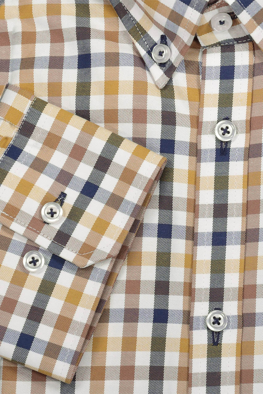 Koszula w kratkę utrzymana w białej, granatowej oraz miodowej kolorystyce. To ponadczasowy wzór do miejskich zestawień. Idealnie prezentuje się z jeansami oraz granatowymi spodniami chino. Model z długim rękawem. Koszula o modnym dopasowanym kroju slim. Wykonana z najwyższej jakości bawełny, co gwarantuje wysoki komfort użytkowania.