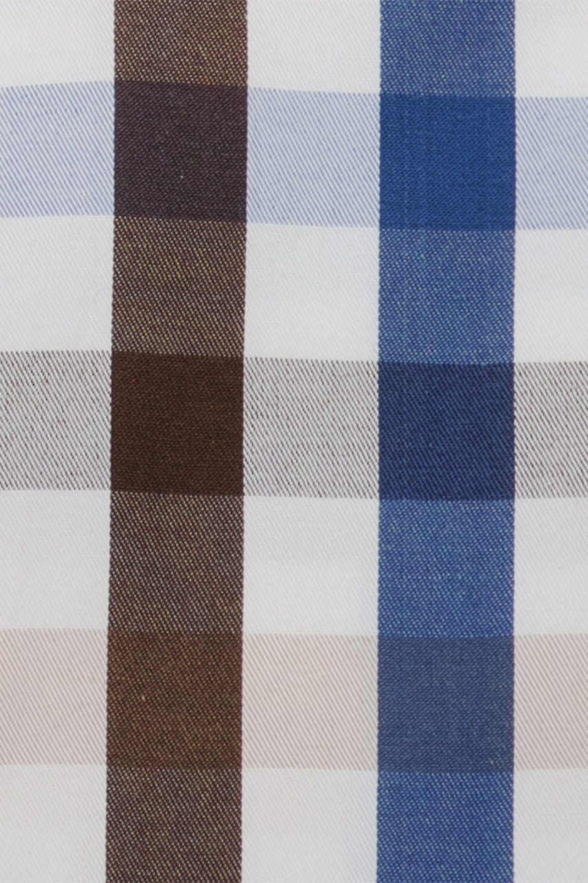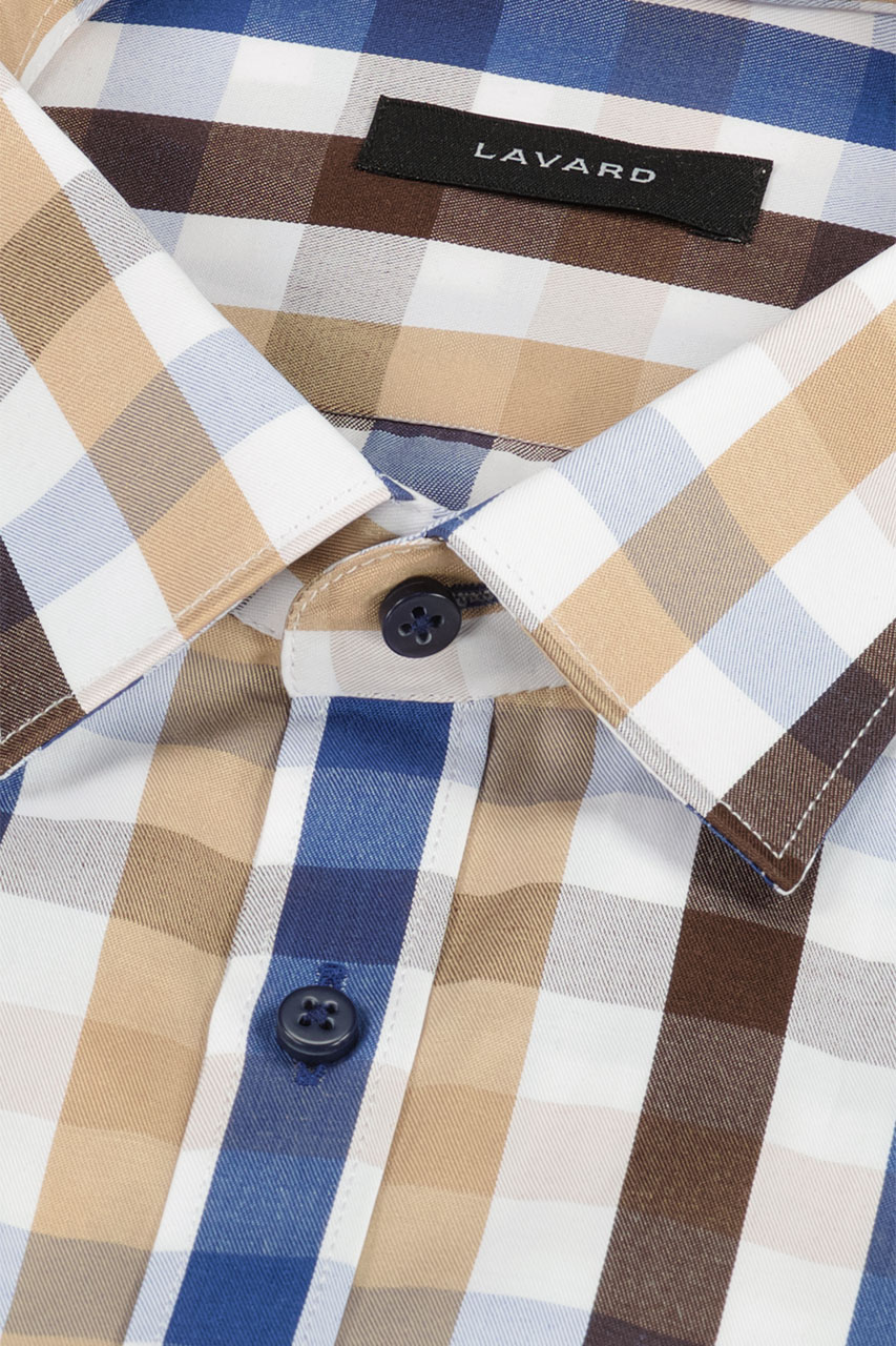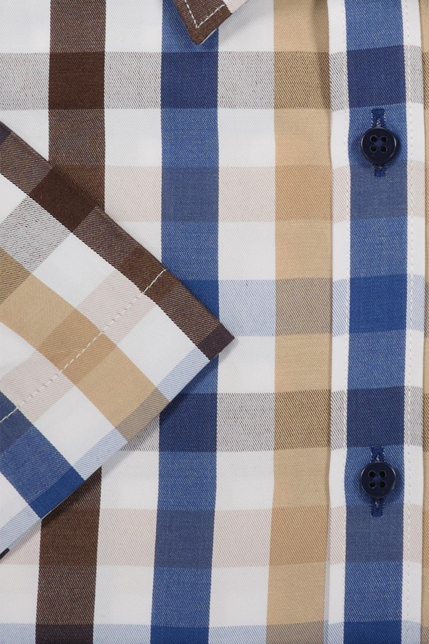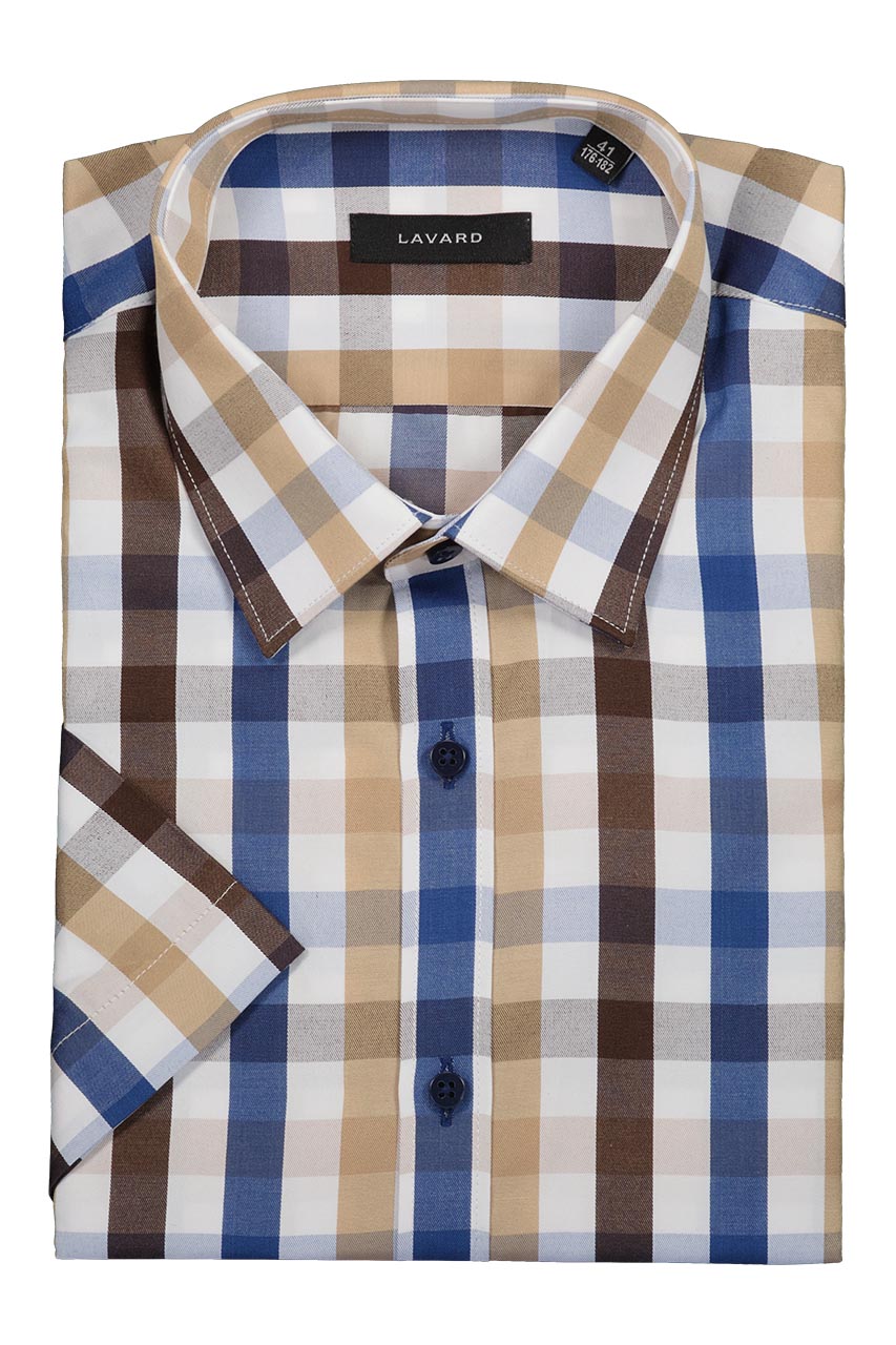 Koszula męska z krótkim rękawem, utrzymana w kolorystyce brązu, beżu, bieli i niebieskiego. Modne połączenie kolorystyczne pozwala na tworzenie wielu stylizacji. Koszula doskonale prezentuje się z jeansami jak i z krótkimi szortami w odcieniu granatu lub beżu. Świetny model na lato.