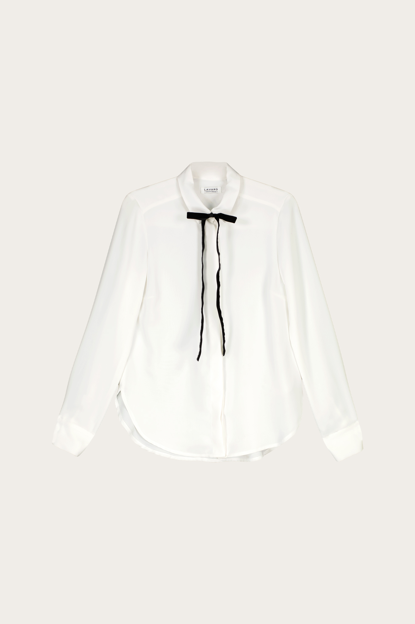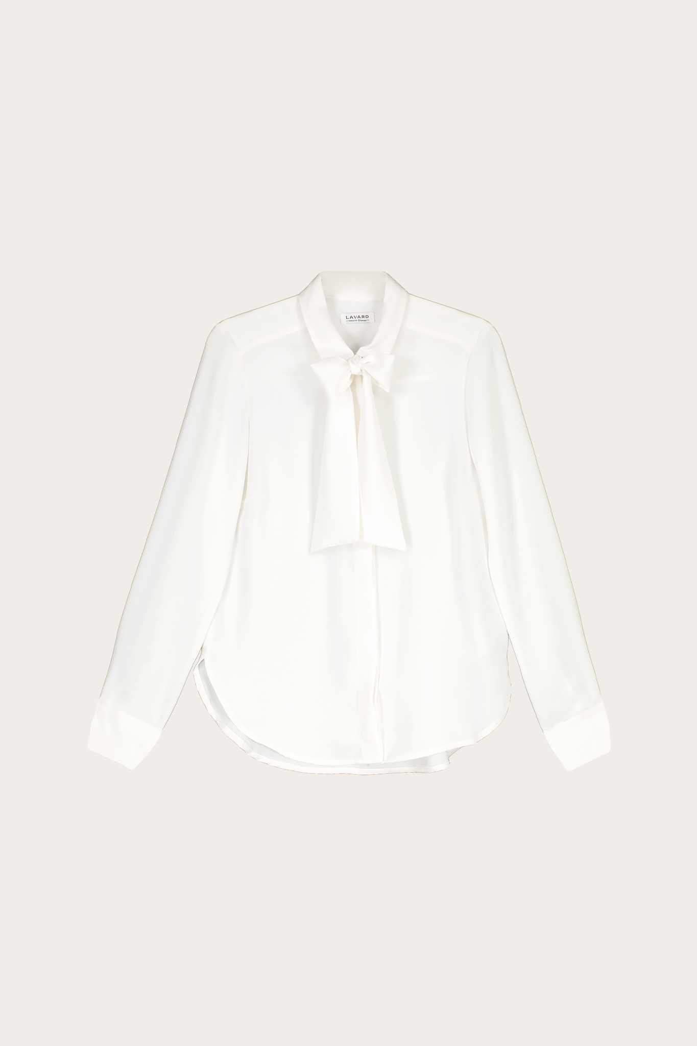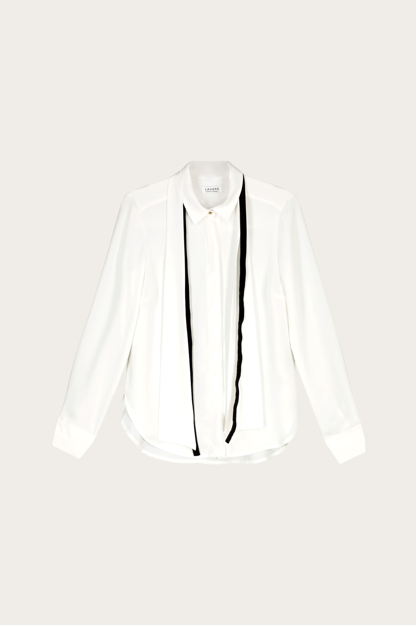 Koszula w odcieniu écru. Model uszyty z lekkiej, zwiewnej i przyjemnej w dotyku tkaniny. Koszula o klasycznym fasonie, zapinana na guziki. Do koszuli dołączono czarną tasiemkę oraz szarfę w kolorze koszuli. Wyprodukowano w Polsce. Modelka ma 174 cm wzrostu. Prezentuje rozmiar 36.
