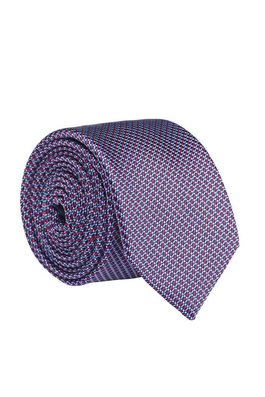 Krawat męski utrzymany w niebieskiej i czerwonej tonacji. Model w mikro wzór. Wykonany z przyjemnego w dotyku materiału. Świetnie urozmaici eleganckie oraz casualowe stylizacje. Doskonale prezentuje się z garniturami w granatowej tonacji.