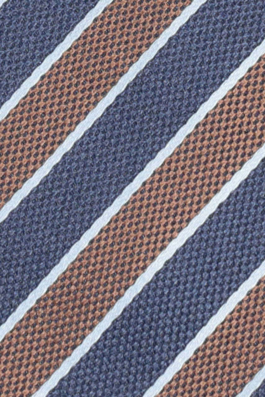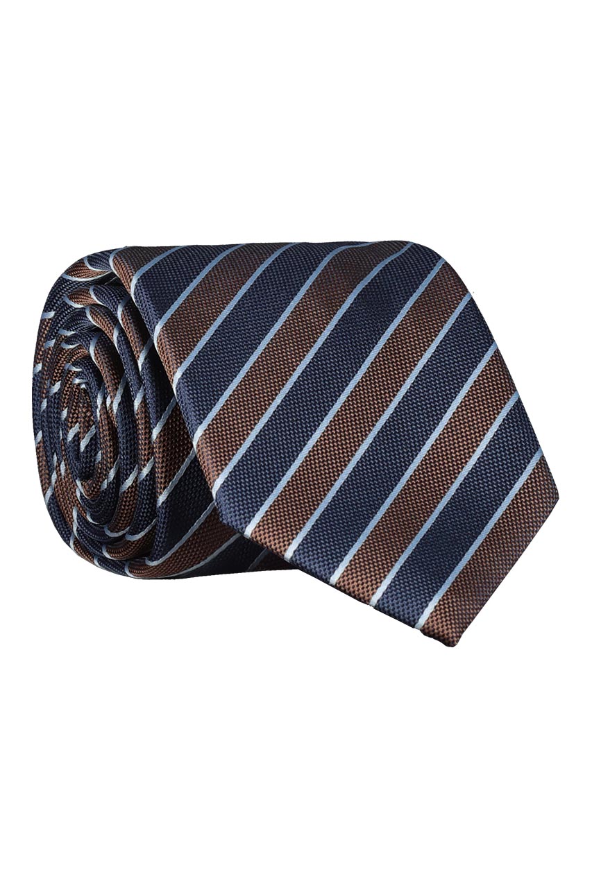 Krawat męski w pasy, utrzymany w brązowo-granatowej kolorystyce. Model o standardowej szerokości, który dzięki skośnym pasom dodatkowo poszerzy optycznie sylwetkę. Idealny dla szczupłych mężczyzn.