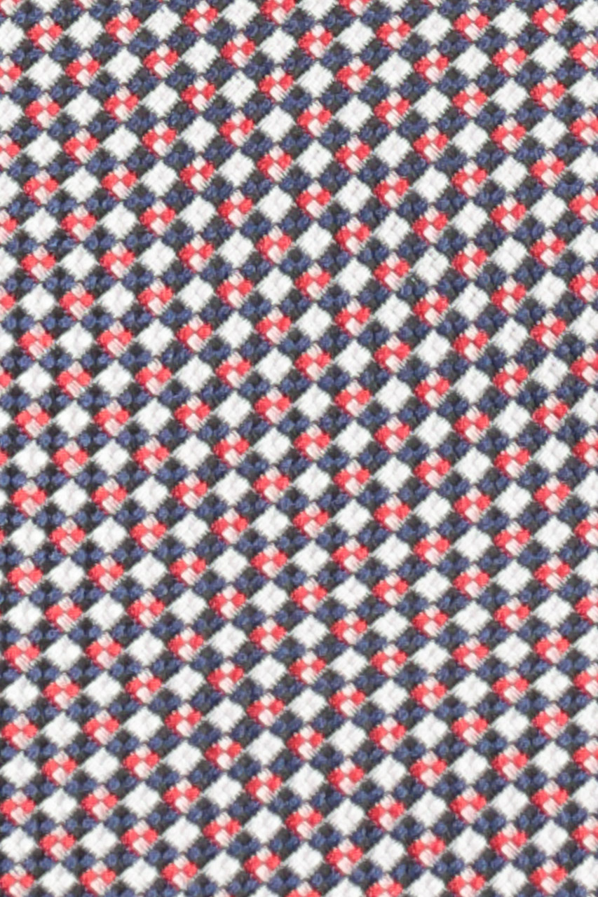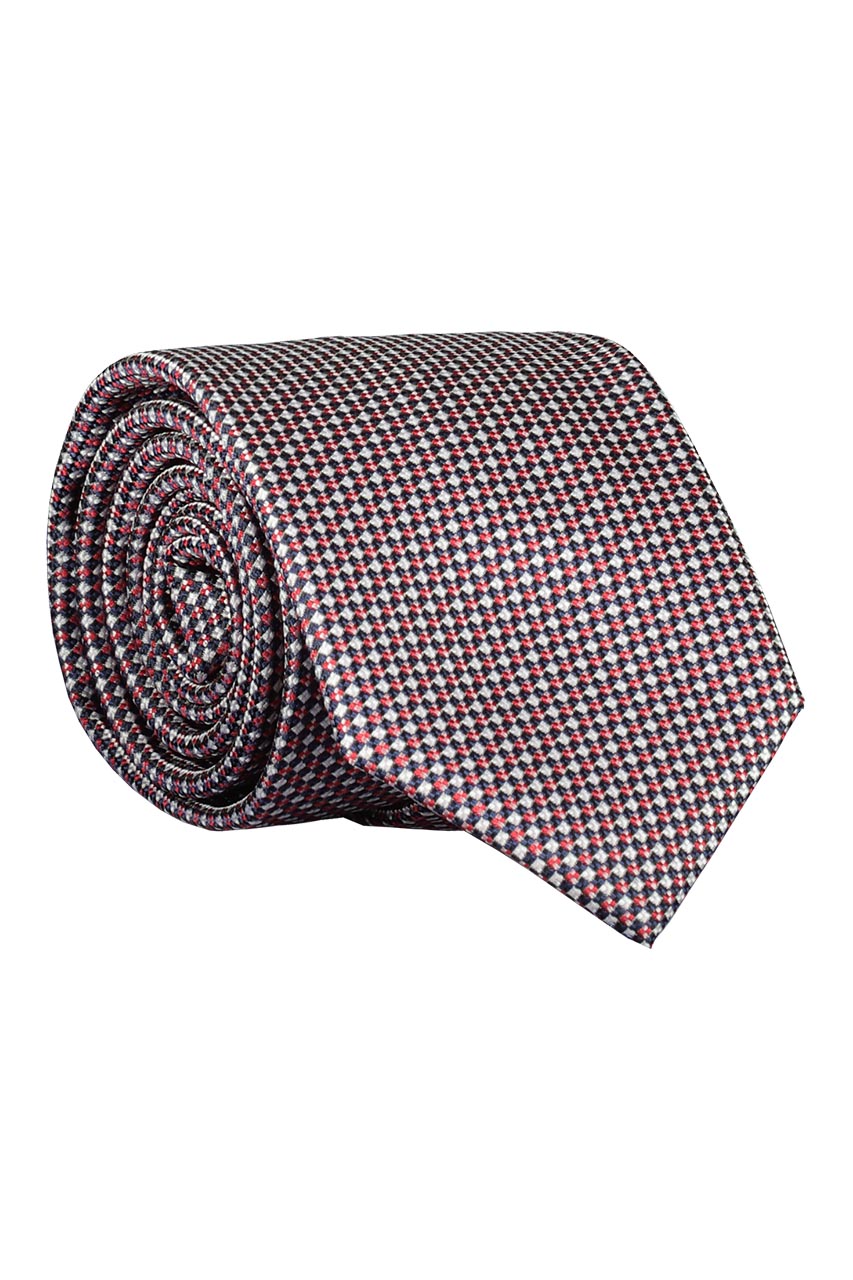 Męski krawat w mikro wzór rombów. Wykonany z przyjemnej, lekko połyskującej tkaniny. Model utrzymany w ponadczasowej tonacji granatu, czerwieni i złamanej bieli. Świetnie uzupełni wizytowe zestawienia.