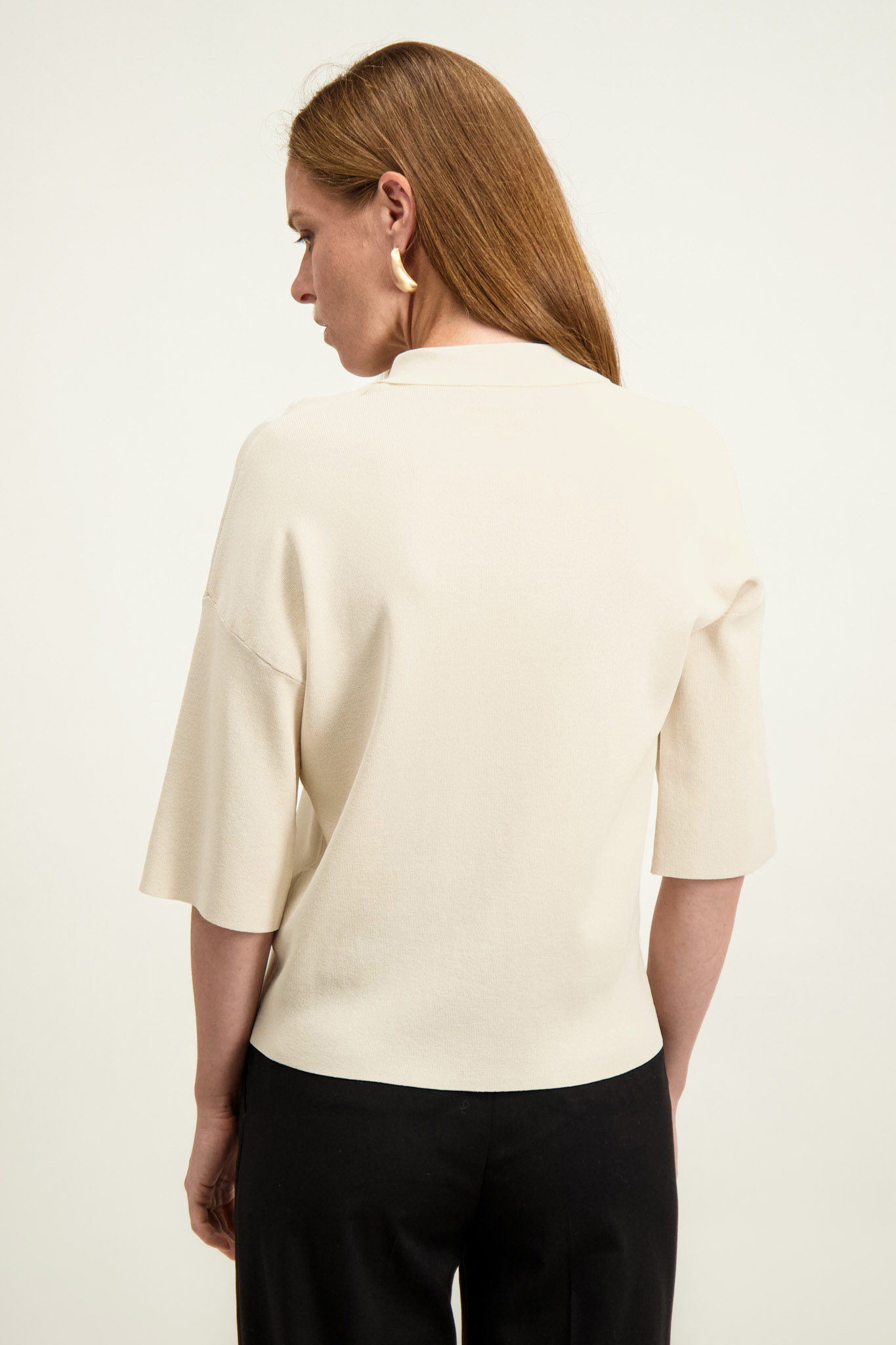 Kremowe polo damskie z rękawem 3/4, wykonane z przyjemnej w dotyku dzianiny. Klasyczny kołnierzyk i subtelne guziki podkreślają elegancki, a zarazem swobodny styl. Luźniejszy fason zapewnia komfort noszenia, co czyni je idealnym wyborem do codziennych, jak i bardziej formalnych stylizacji.
