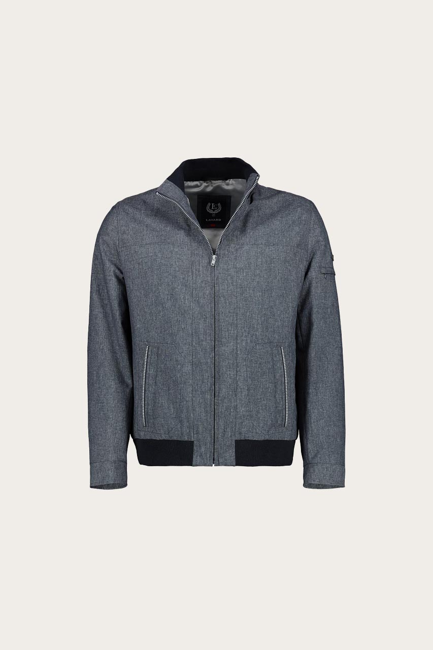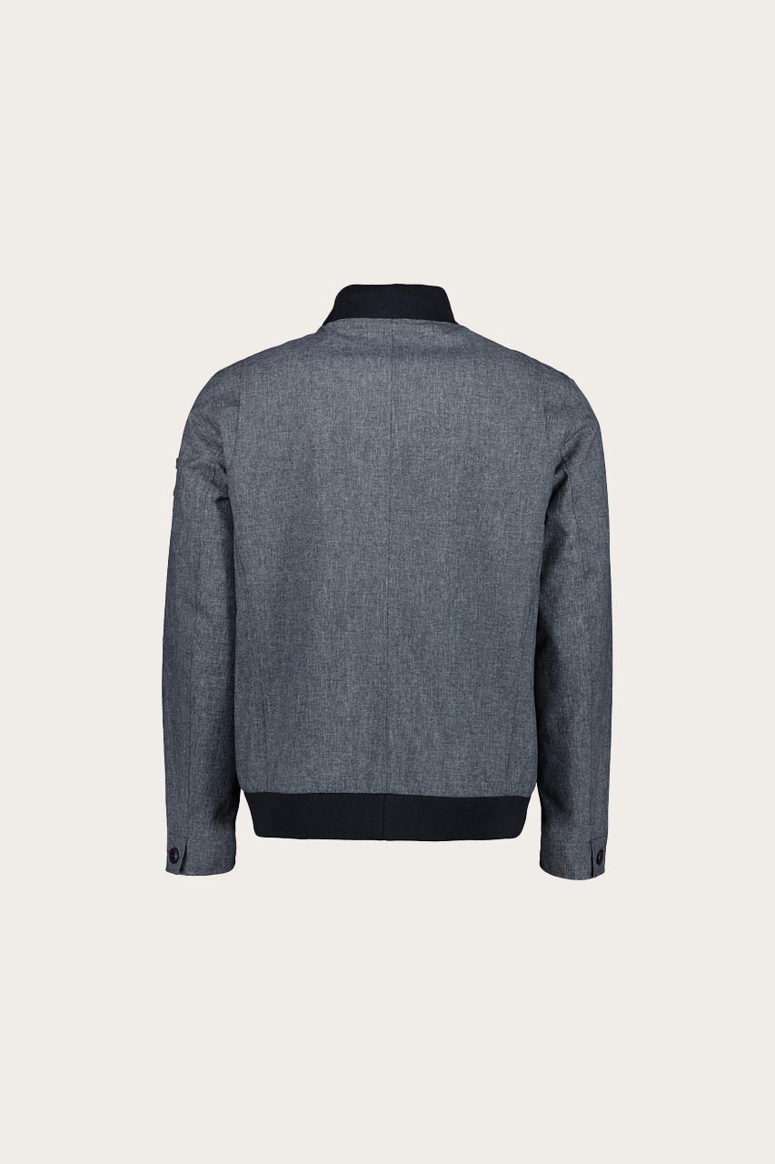 Granatowa kurtka męska w melanżowy deseń. Uszyta z wysokiej jakości tkaniny o właściwościach wodoodpornych oraz wiatroodpornych. Kurtka o ponadczasowym, dopasowanym kroju typu bomber. Model posiada dzianinową stójkę oraz dzianinowy ściągacz na dole.