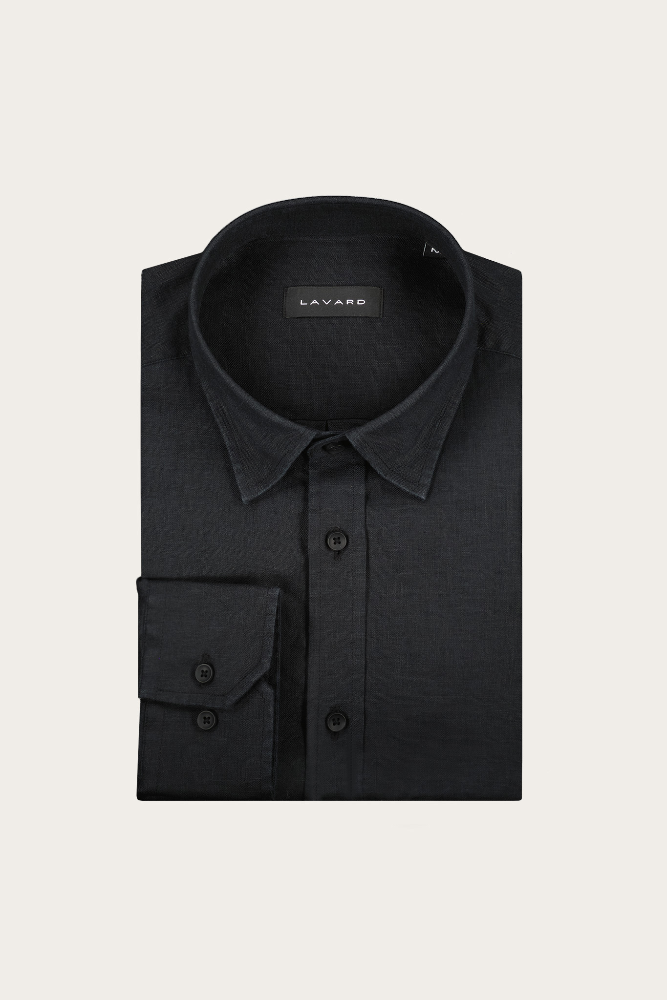 Lniana koszula męska w kolorze czarnym. Model o dopasowanym kroju slim.