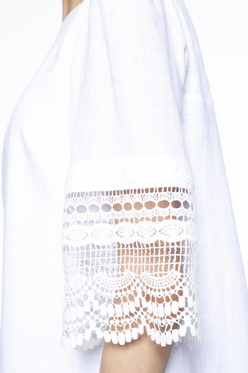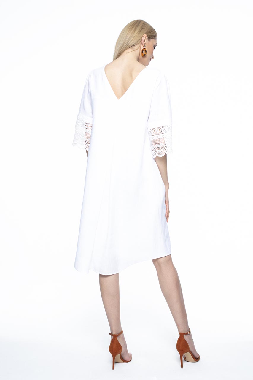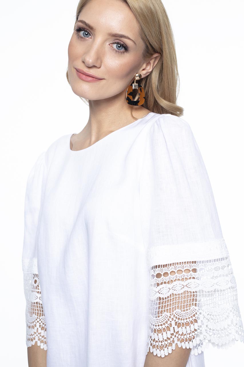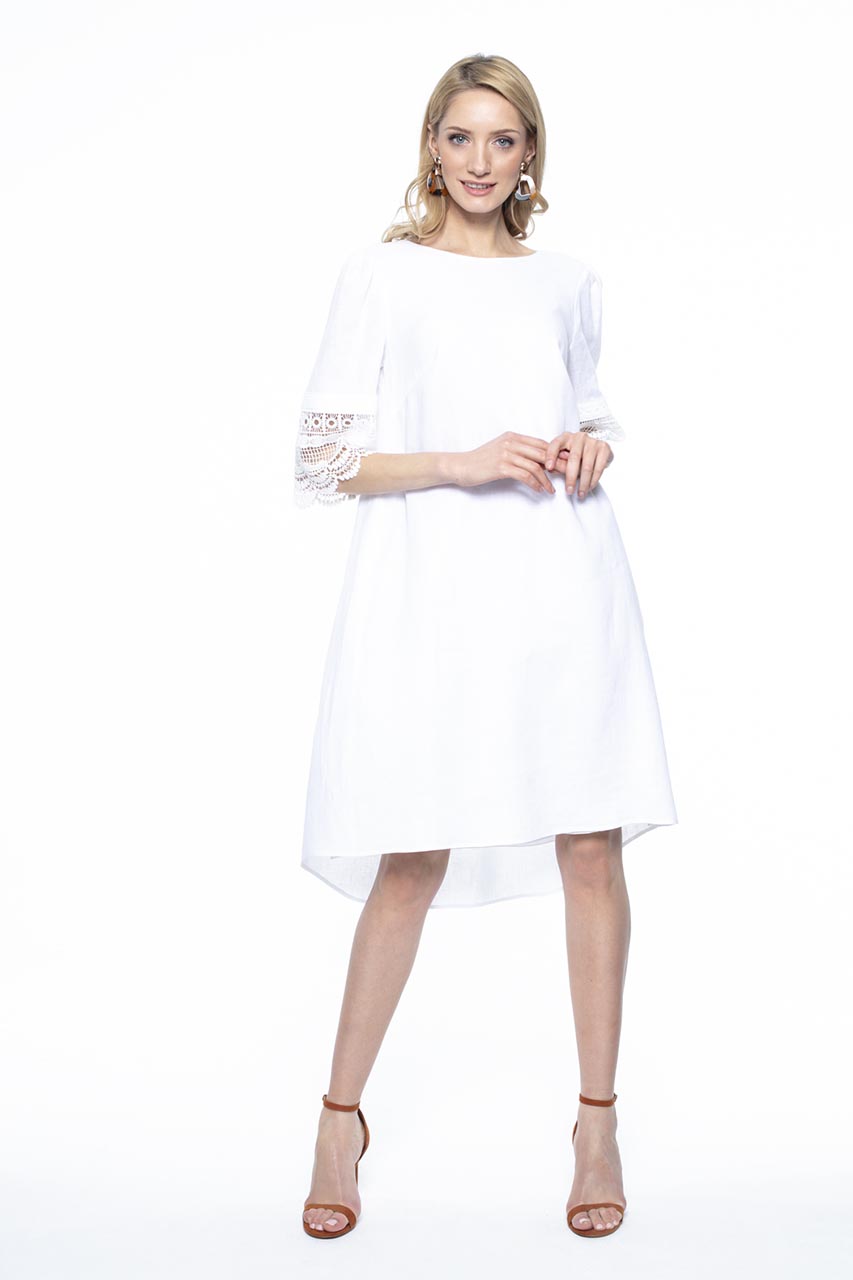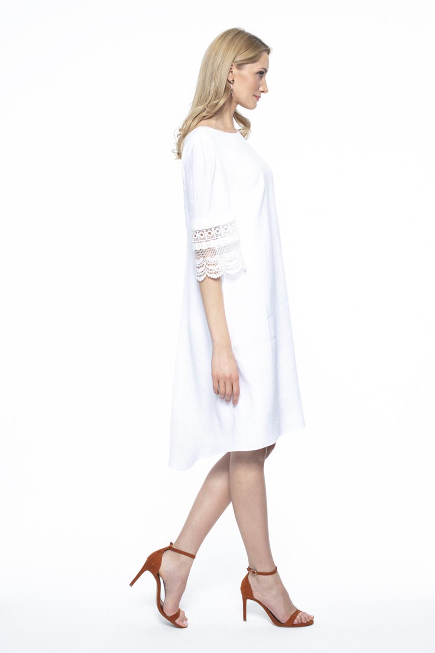 Krótka lniana sukienka damska o luźnym kroju. Biała sukienka jest obowiązkową propozycją na lato, kiedy potrzebny jest lekki oraz komfortowy strój. Oferowany model ma lekko przedłużony tył oraz ozdobne rękawki z gipiury, które dodają sukience wyjątkowego uroku. Można ją nosić zarówno w wydaniu eleganckim z cielistymi czółenkami, a także lekkimi klapkami oraz koszykiem plażowym. Sukienkę docenią zwłaszcza panie, które nie lubią zbyt dopasowanych krojów, a w swoim ubiorze preferują przede wszystkim komfort oraz niewymuszoną elegancję.