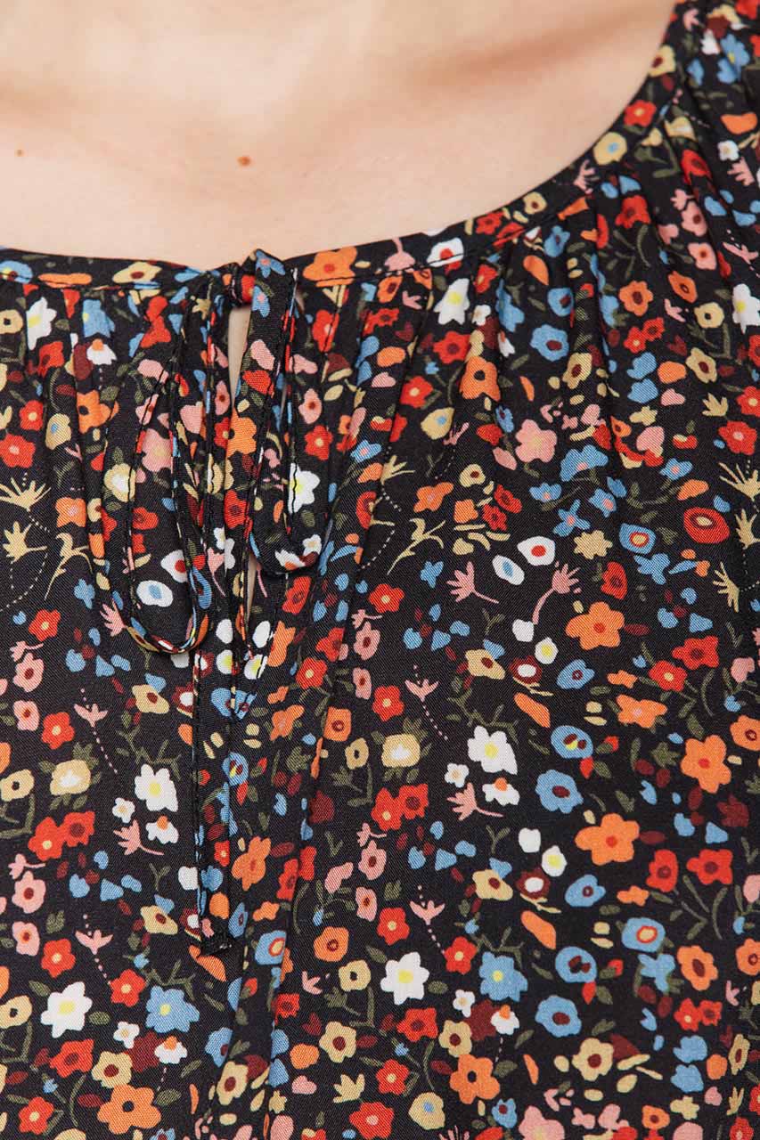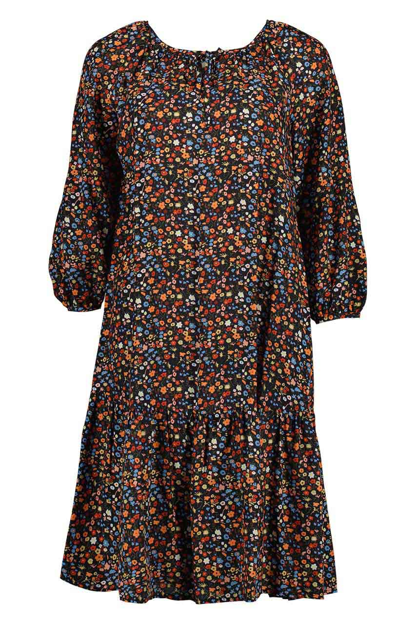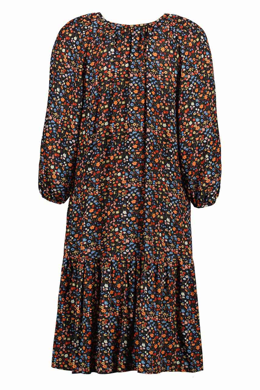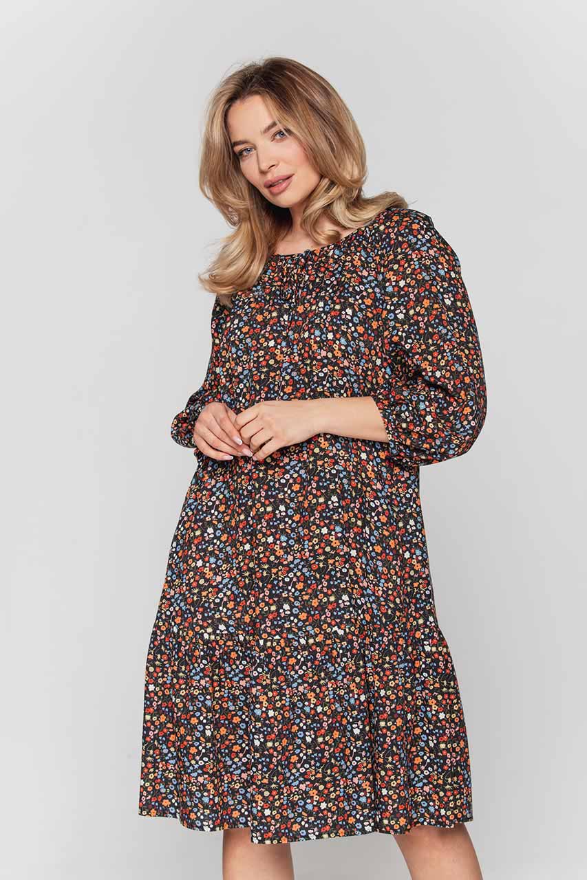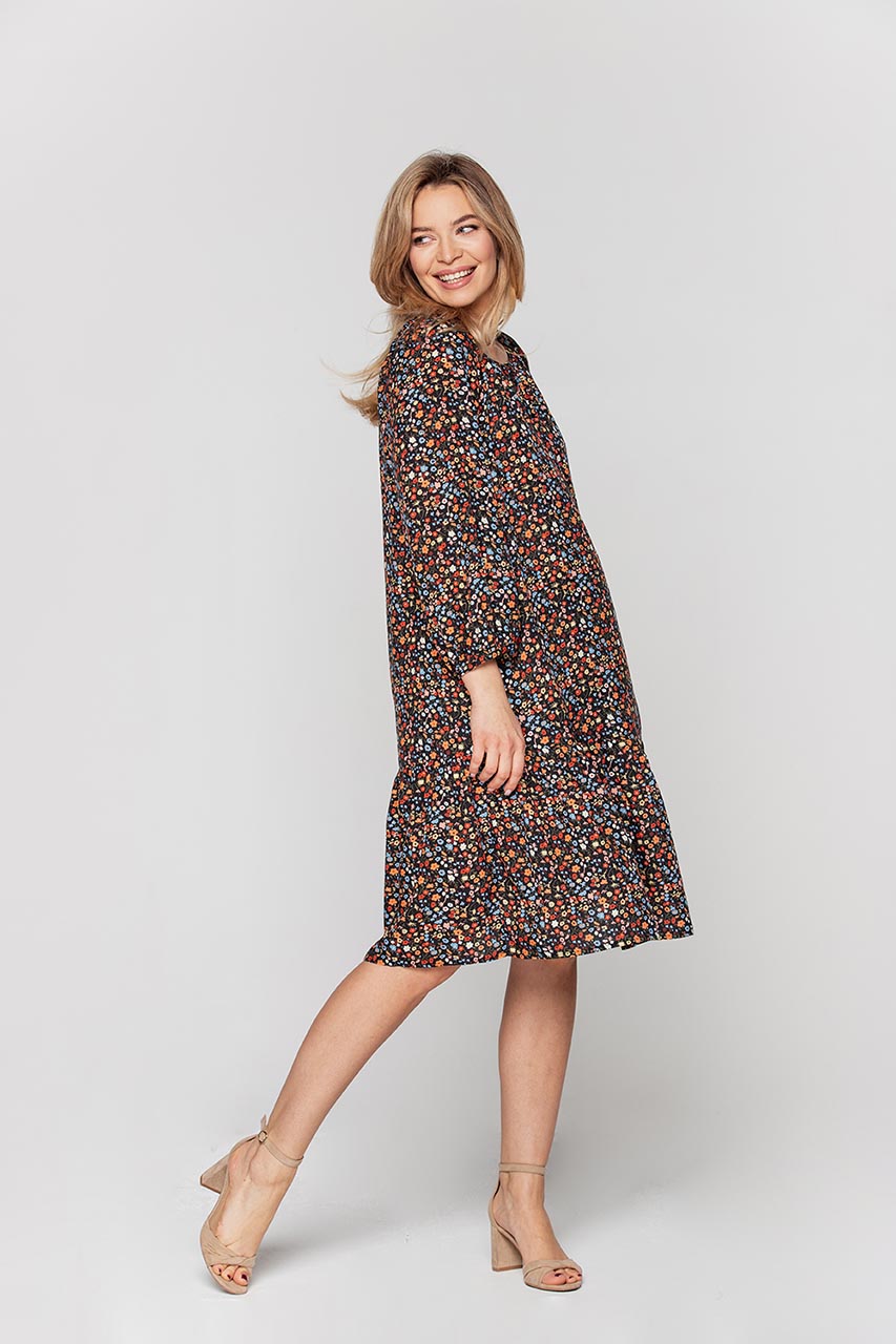 Sukienka damska w drobny kwiatowy wzór. Model posiada falbanki kaskadowe oraz balonowe rękawy o średniej długości, które dodają sukience dziewczęcego szyku i lekkości. Sukienka została uszyta z przyjemnej w dotyku oraz przewiewnej tkaniny wiskozowej, która fantastycznie sprawdzi się latem. Subtelne marszczenie przy dekolcie oraz lamówka wiązana na kokardkę są ozdobnymi akcentami, które urozmaicają fason sukienki. Można ją nosić solo, a także ze skórzanym paskiem. Sukienka zyska wówczas niezwykle lekkiego i kobiecego charakteru, który uzupełnić wystarczy sandałkami na koturnie oraz biżuterią w stylu boho.