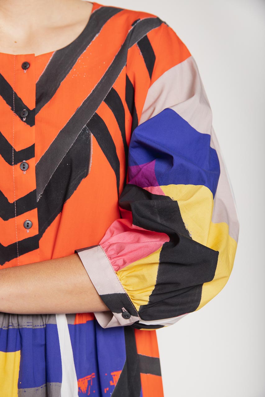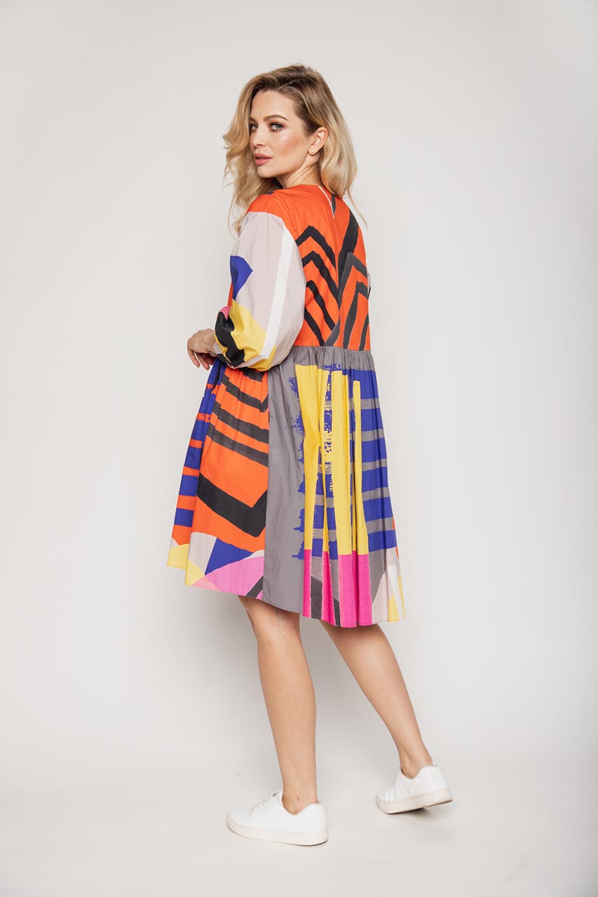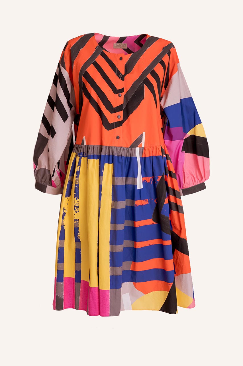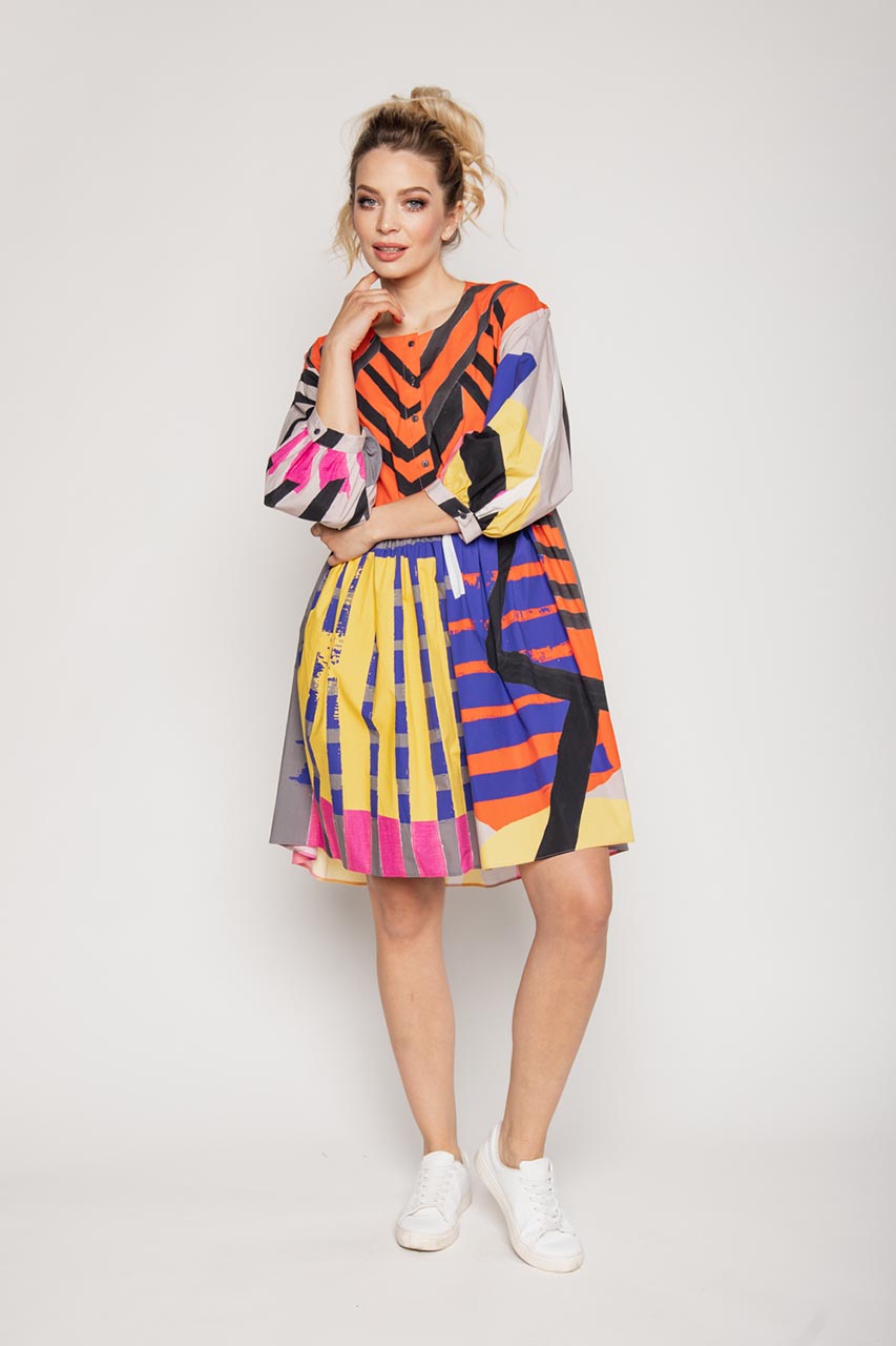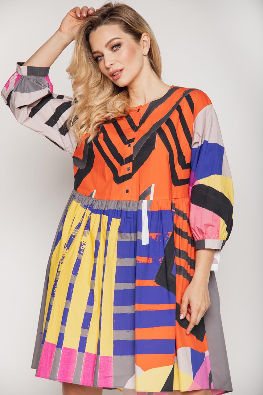 Luźna sukienka o koszulowym fasonie. Model z bufiastym rękawem o długości 3/4. Sukienka posiada zapinaną na guziczki górę oraz falbanę. Została wykonana w 100% z bawełny, co korzystnie wpływa na jej komfort użytkowania latem. Sukienka z uwagi na swój wyrazisty wzór świetnie wypadnie w stylizacjach casualowych z espadrylami oraz jeansową kataną. To doskonała propozycja na lunch z przyjaciółką, weekendowy wypad za miasto lub grilla ze znajomymi.