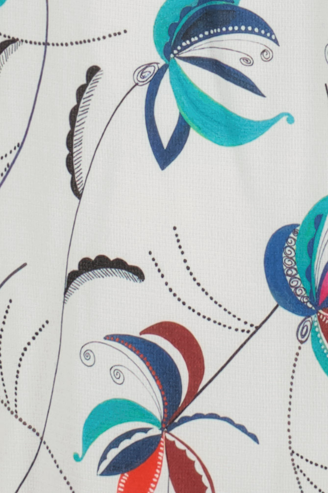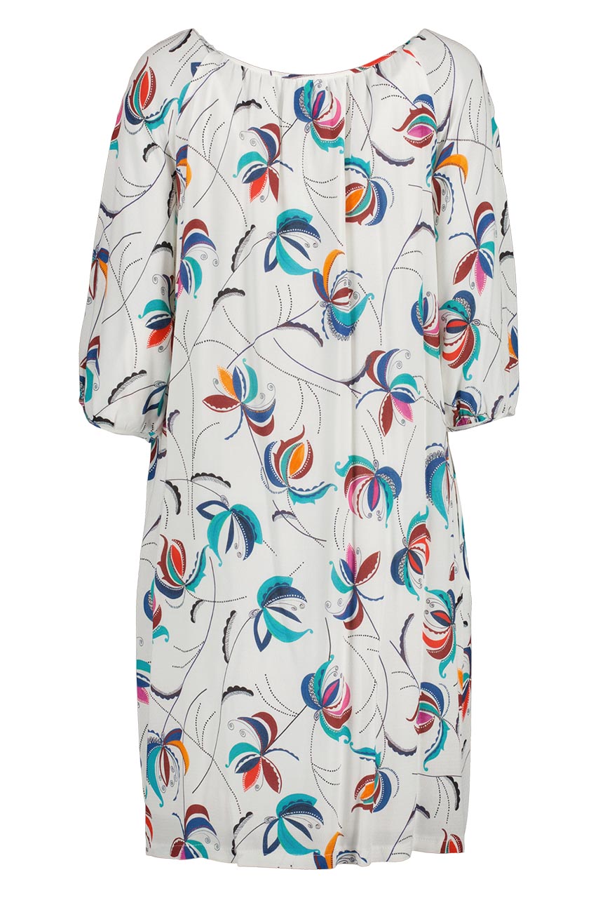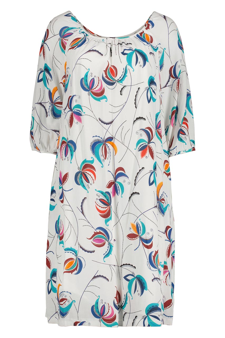 Luźna sukienka, która łączy w sobie biel oraz kwiatowy wzór. To absolutny hit wakacji. Model wykonany z miękkiej tkaniny wiskozowej sprawdzi się rewelacyjnie w gorące dni. Sukienka posiada ozdobne rękawy raglanowe o długości 3/4 oraz efektowne marszczenie przy dekolcie. Można nosić ją solowo lub w połączeniu z ulubionym paskiem. To sukienka dedykowana zwłaszcza na co dzień – sprawdzi się na plaży, podczas wakacyjnej wycieczki lub spotkania z przyjaciółmi. Wybór dodatków również nie będzie trudnością. Wystarczy spojrzeć na kolory pojawiające się na tkaninie – fuksję, turkus, czy pomarańcz. Sukienka świetnie sprawdzi się z sandałkami i torebką w takim właśnie żywym, letnim kolorze.