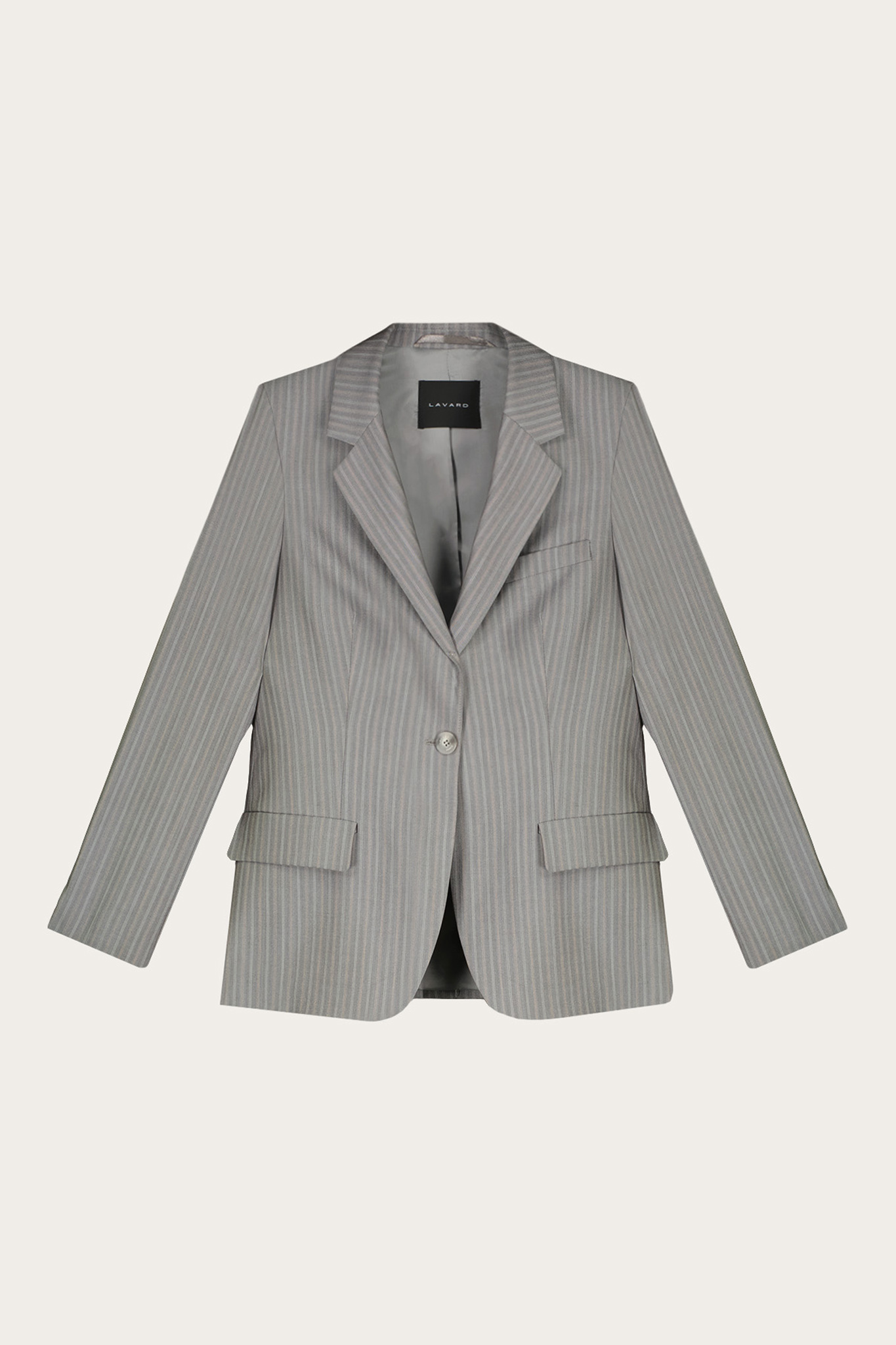 Marynarka damska w kolorze szarym w prążek. Uszyta z miękkiej i przyjemnej w chwycie tkaniny z jedwabiem. Model posiada dwie kieszenie z patką. Ze spodniami (87062) z tej samej tkaniny tworzy garnitur.