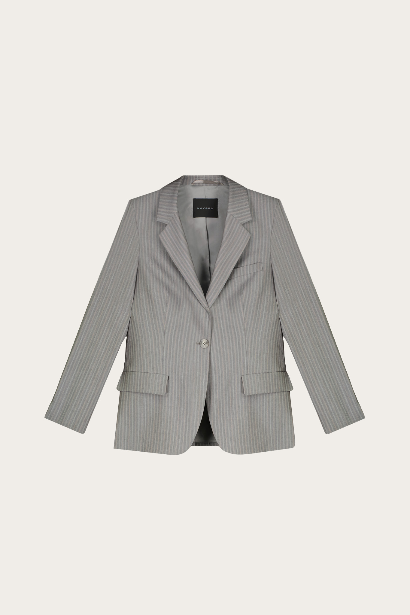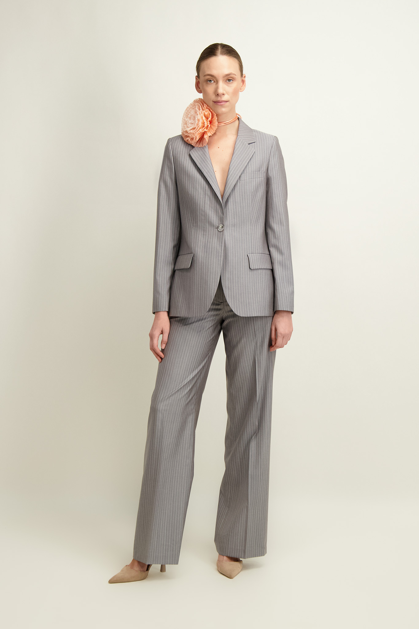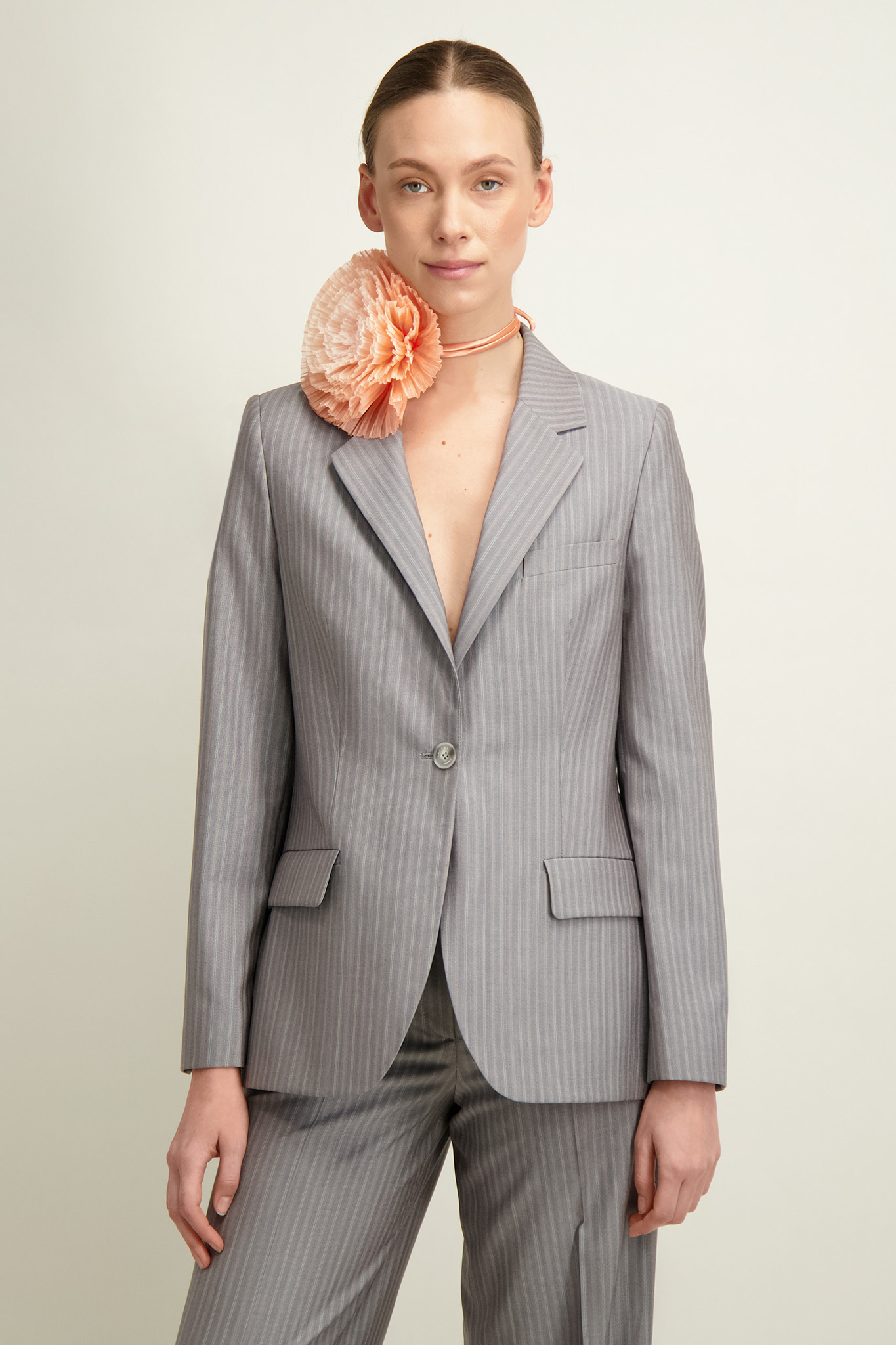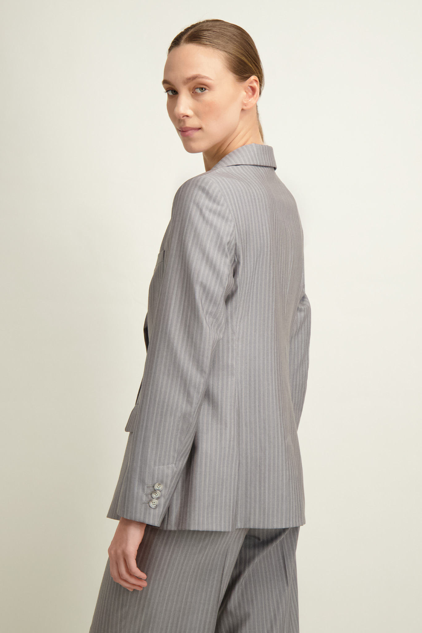 Marynarka damska w kolorze szarym w prążek. Uszyta z miękkiej i przyjemnej w chwycie tkaniny z jedwabiem. Model posiada dwie kieszenie z patką. Ze spodniami (87062) z tej samej tkaniny tworzy garnitur.