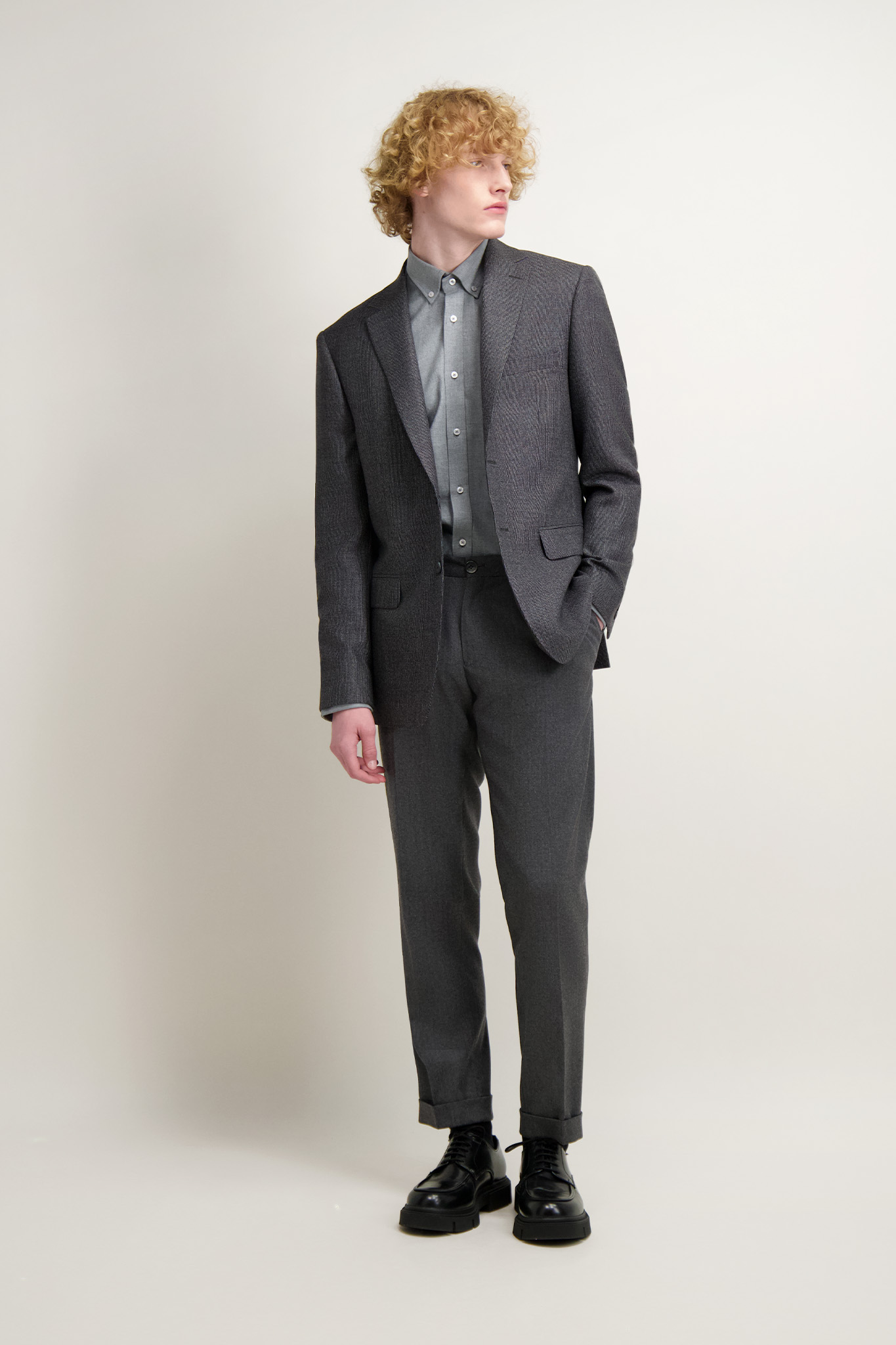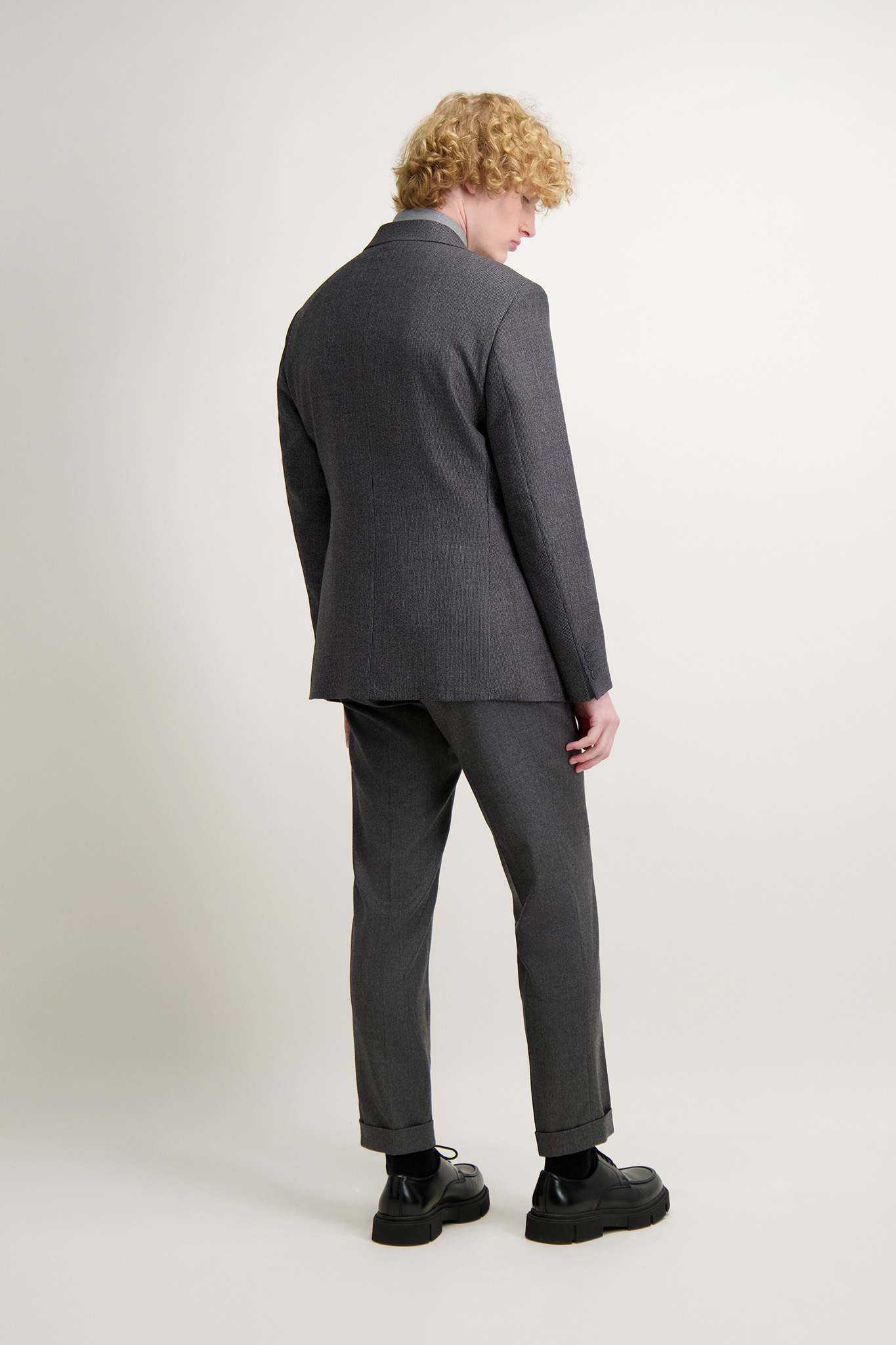 Grafitowa, wełniana marynarka męska z delikatnym melanżowym deseniem. Model na podszewce, posiada lekką konstrukcję zapewniającą naturalne ułożenie na sylwetce.
