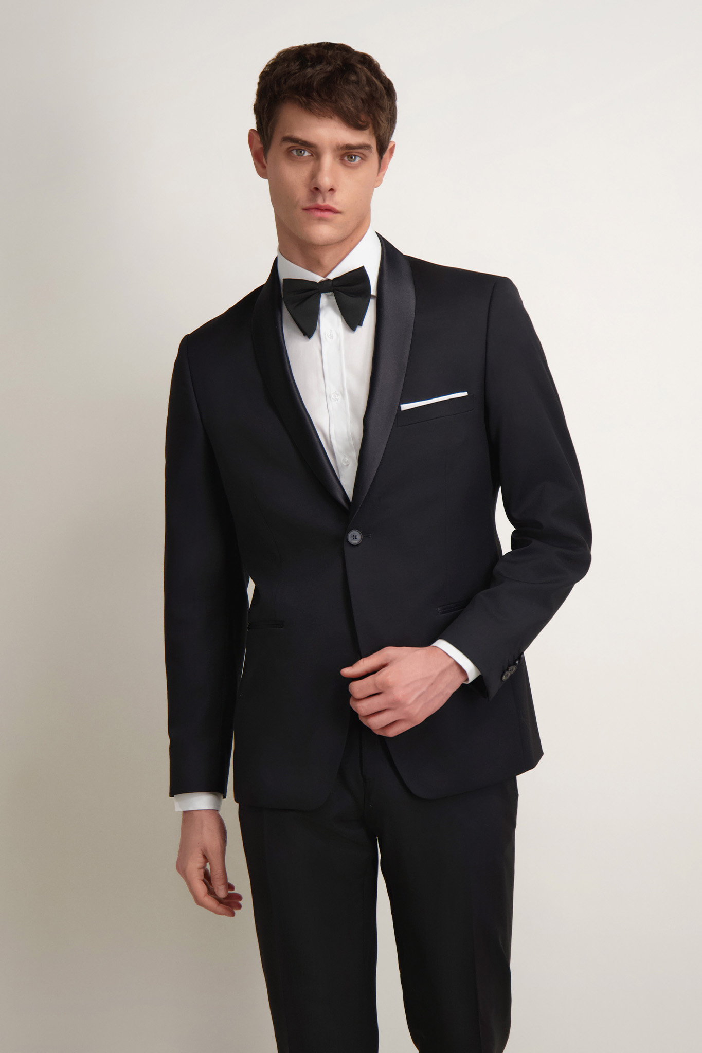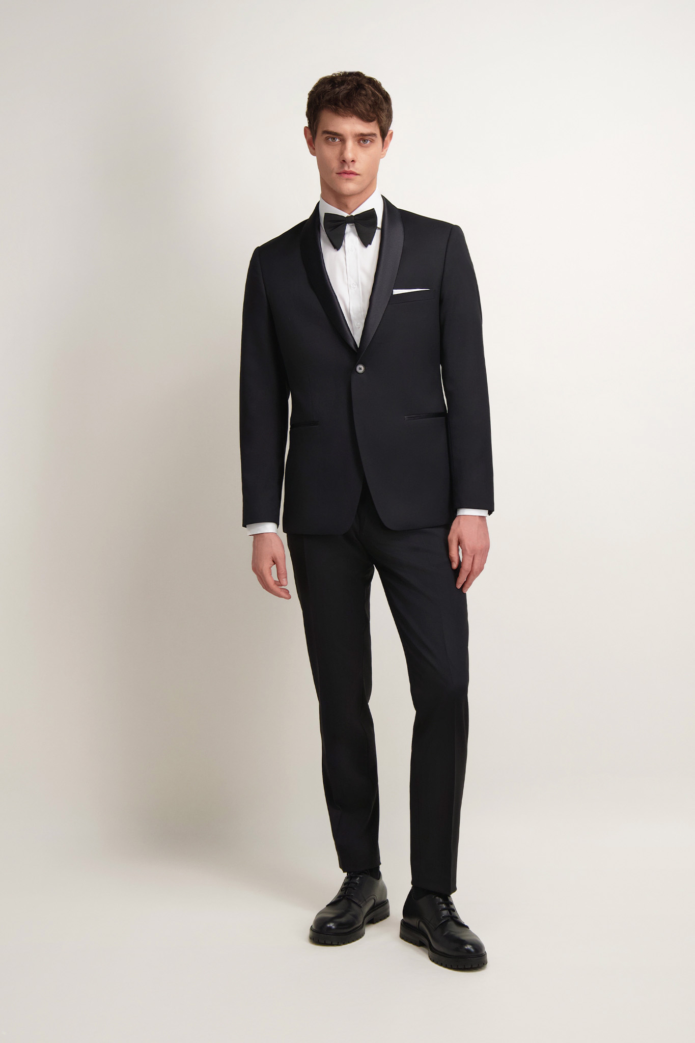 Marynarka smokingowa uszyta z najwyższej jakości wełny Super 110’S. Tkanina pochodzi z renomowanej włoskiej tkalni Vitale Barberis Canonico istniejącej na rynku już od 1663 roku. Ze spodniami (62152) z tej samej tkaniny tworzy garnitur.