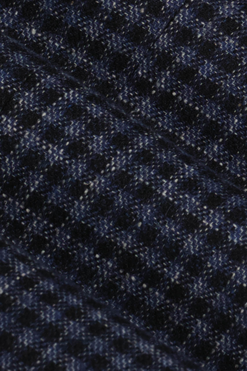 Marynarka w drobną kratkę, utrzymana w granatowej kolorystyce. Model uszyty z włoskiej tkaniny pochodzącej od renomowanego producenta Tollegno. Tkanina to mieszanka virgin wool, lnu i bawełny. Marynarka zapinana na dwa guziki. Posiada szerokie klapy w szpic oraz dwie kieszenie z patką i brustaszę. Wyprodukowano w Polsce.