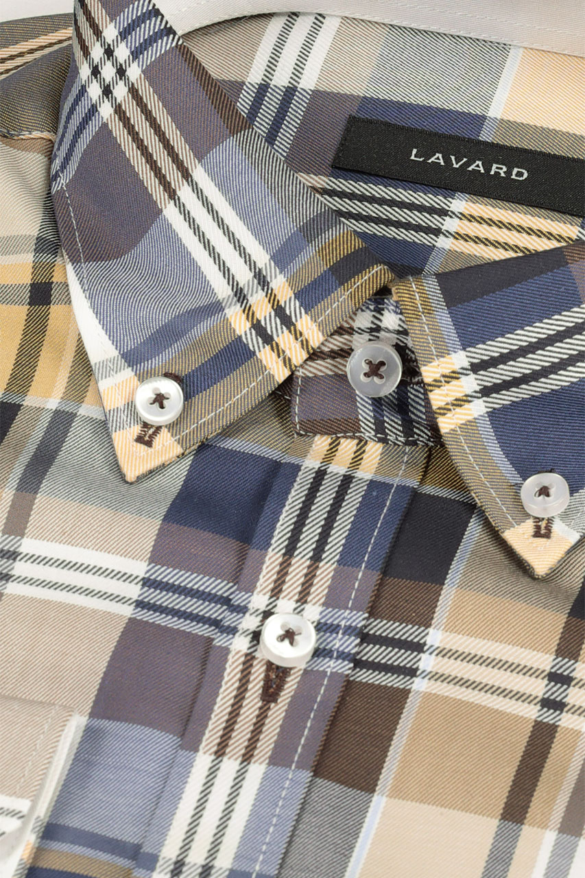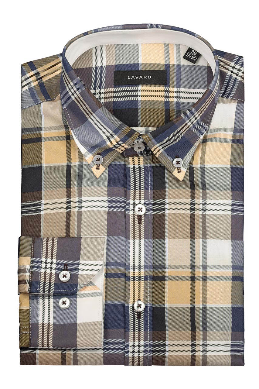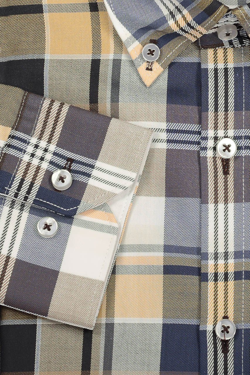 Koszula męska w kolorową kratę. Nieoczywista a zarazem modna kolorystyka wnosi powiew świeżości i odrobinę energii do całej stylizacji. Koszula uszyta z najwyższej jakości bawełny, co znacząco wpływa na komfort użytkowania. Model fantastycznie prezentuje się z beżowymi spodniami chino.