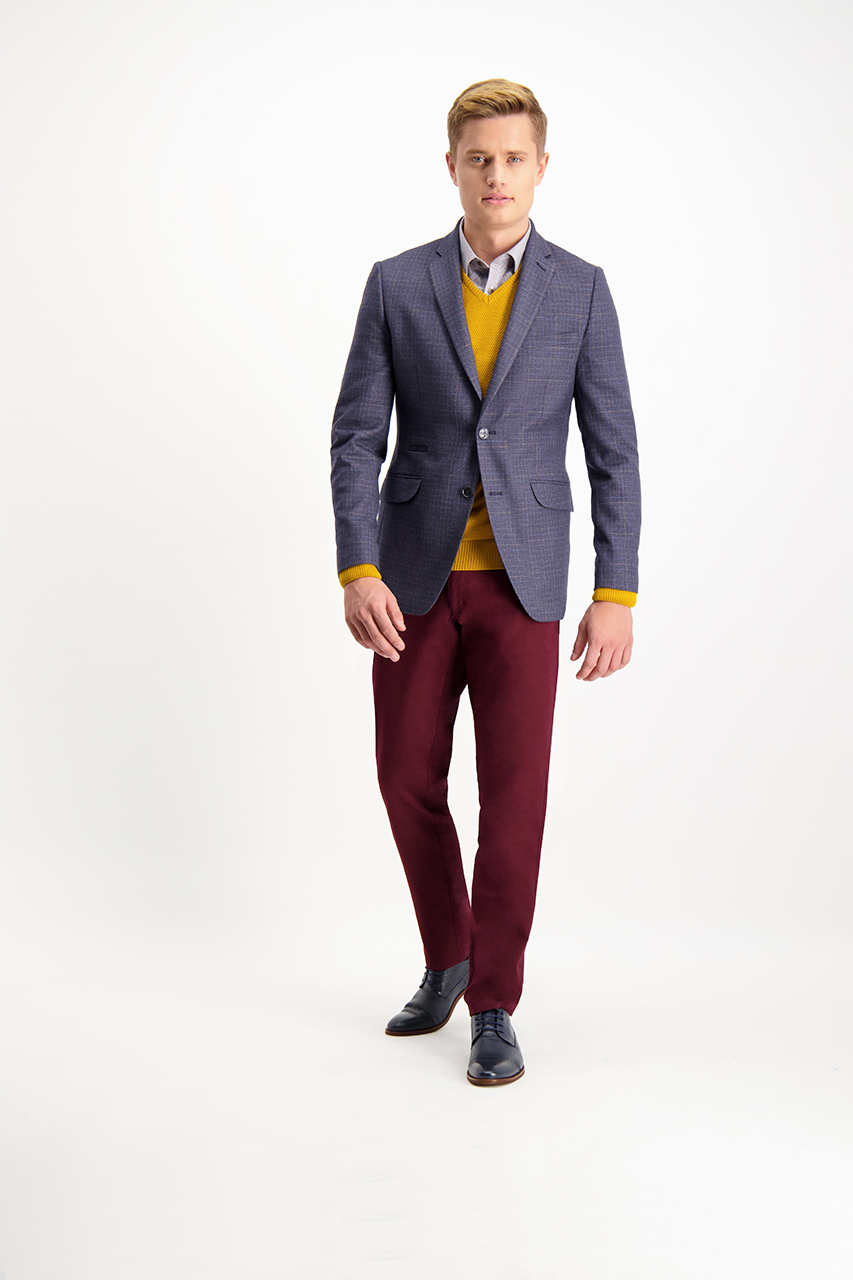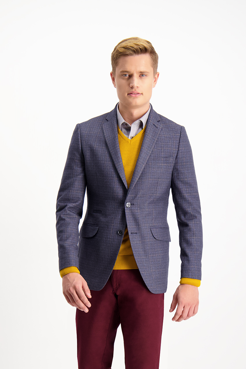 Granatowa marynarka męska w kratę, wykonana z przyjemnej w dotyku tkaniny. Ciekawy model o dopasowanym kroju zapinany na dwa guziki. Posiada dwie kieszenie zakończone patką, zegarówkę i brustaszę. Piękna propozycja, która świetnie prezentuje się z bordowymi lub niebieskimi spodniami chino i klasyczną białą koszulą.
