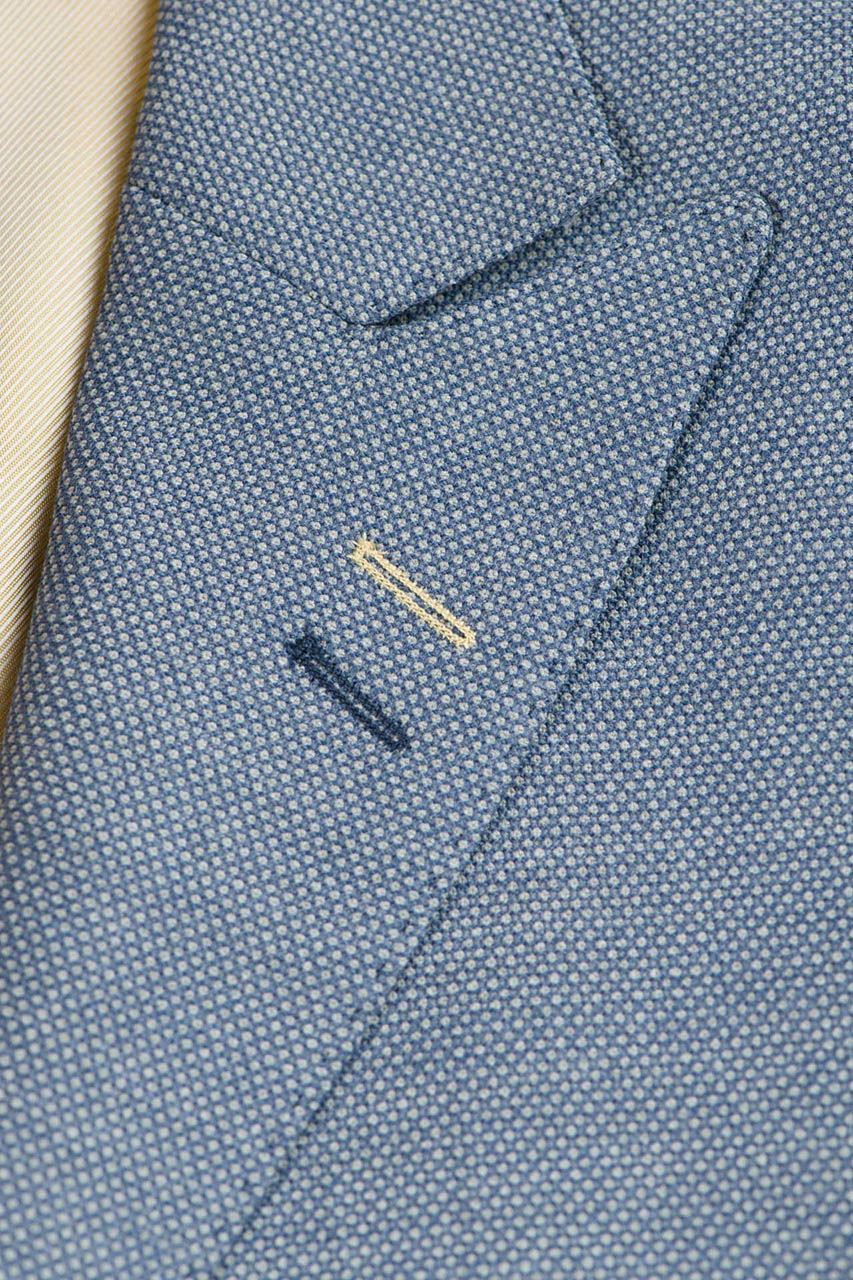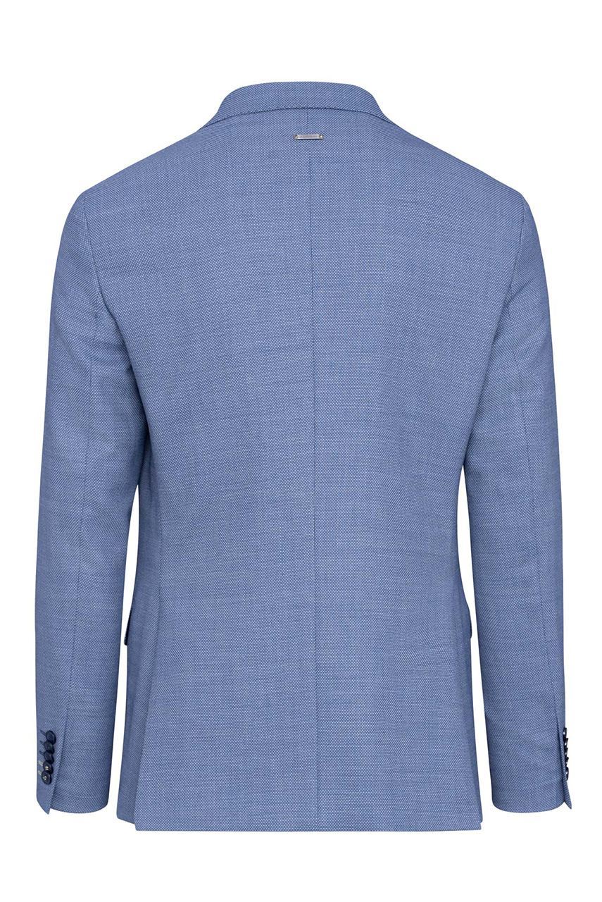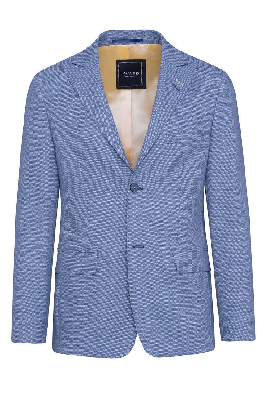 Niebieska marynarka męska z spiczastymi klapami, uszyta z tkaniny z widoczną strukturą. Klasyczny fason z ozdobnymi klapami w szpic, zapinany na jeden rząd guzików. Z przodu dwie kieszenie zakończone patką i zegarówka, z tyłu dwa rozcięcia. Guziki przyszyte kontrastową nicią w beżowym kolorze. Marynarka idealna do półformalnych zestawów z jasną koszulą i beżowymi chinosami.